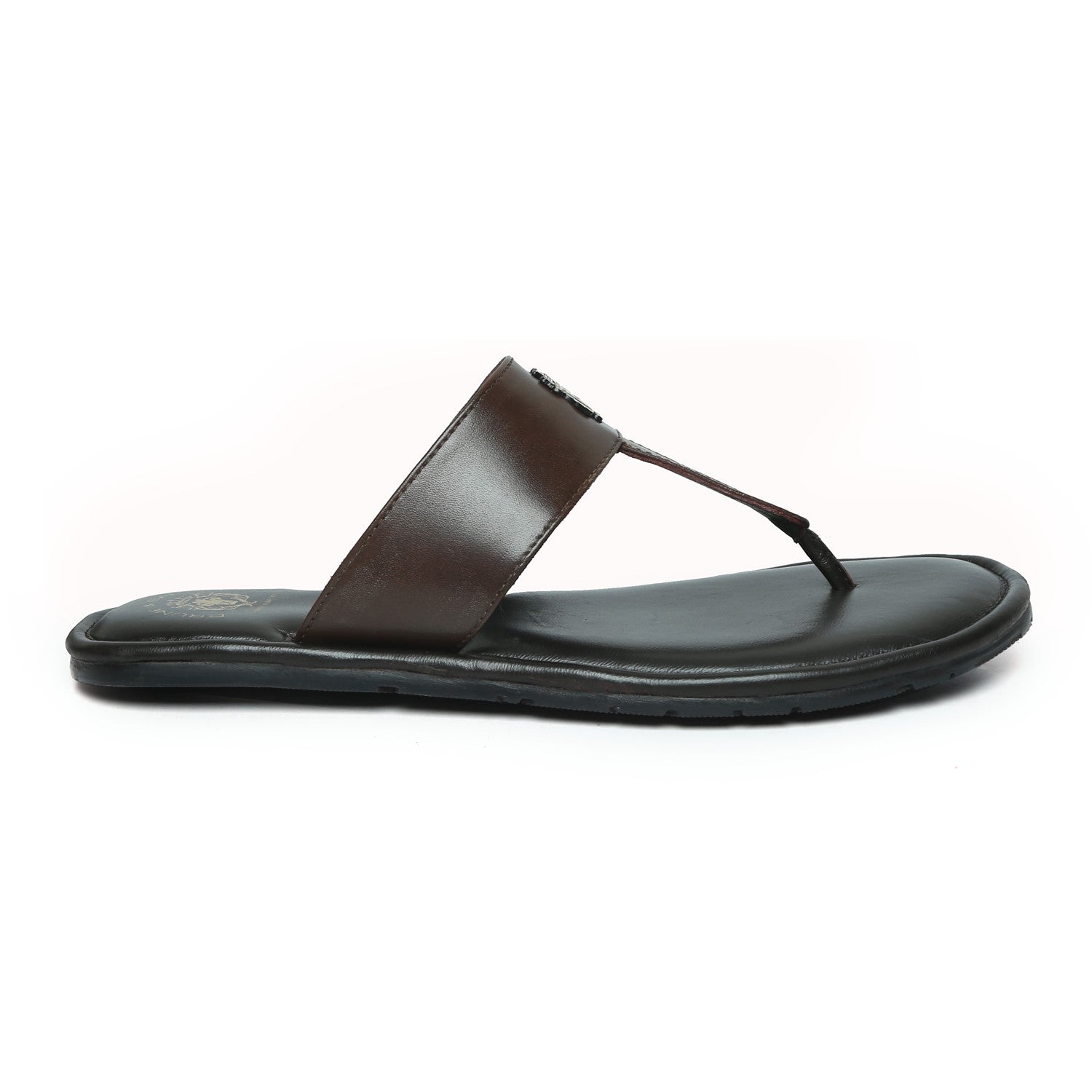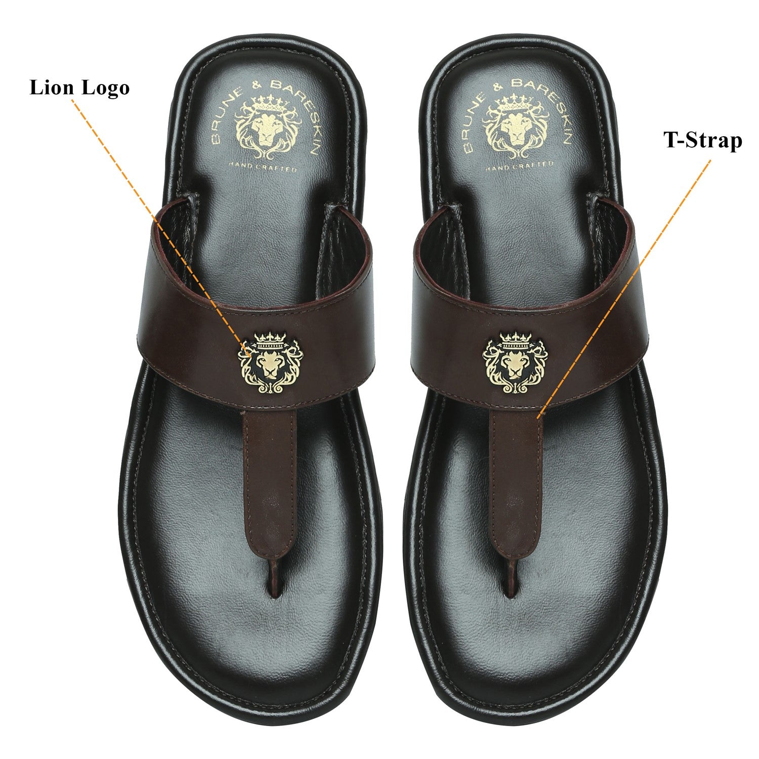 These contrasting black and brown Leather fashion slippers with a metal lion logo are designed to give complete comfort and style. Brown Upper Genuine Leather strap with contrasting golden lion logo provides vogue and ruggedness at the same time. This super-soft base gives you all-day comfort. These men's casual footwear is a good pick to wear with casuals and ethnicities.