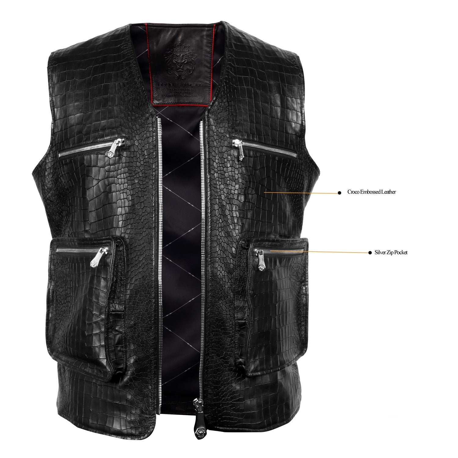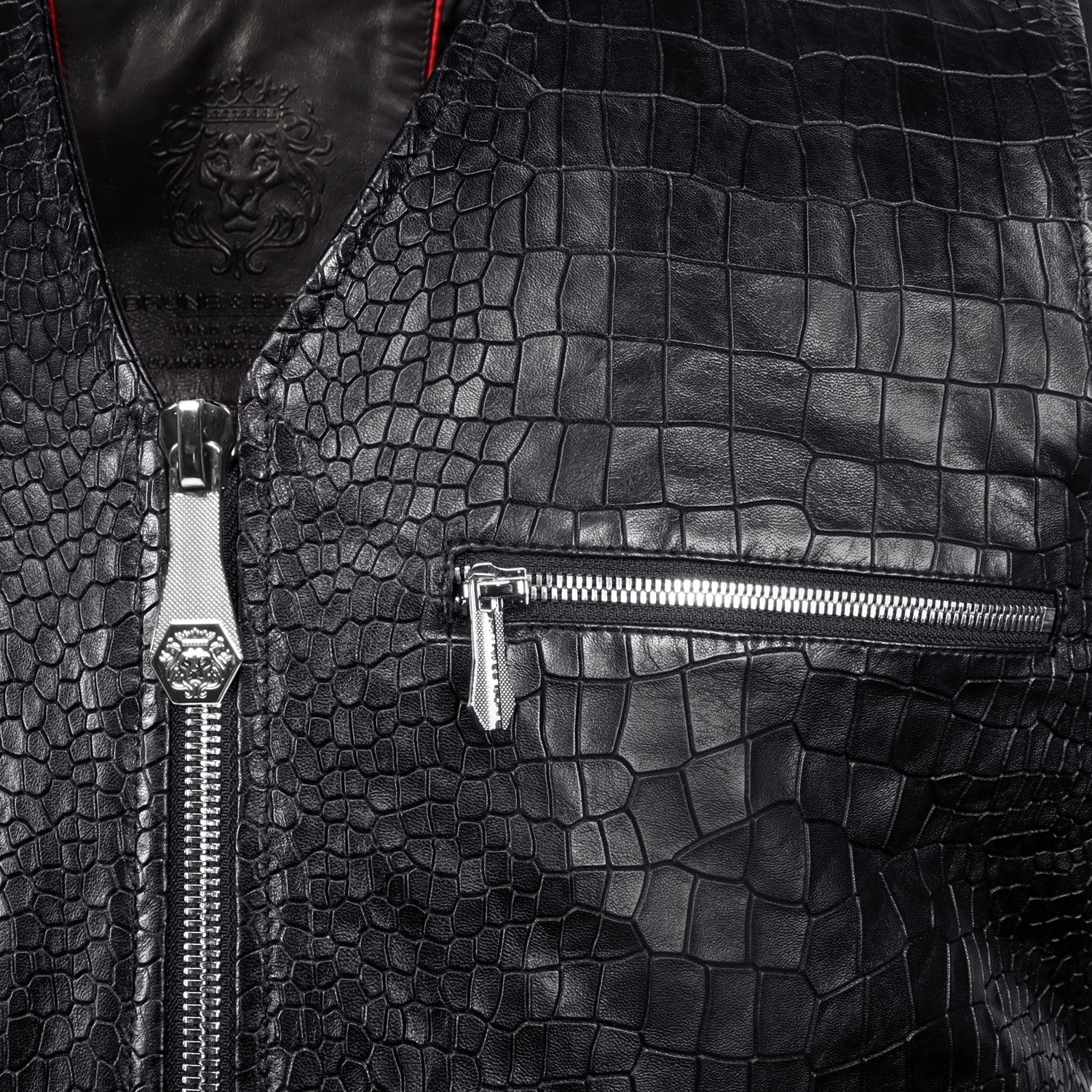 Crafted for those who appreciate bold textures and refined craftsmanship, this black sleeveless jacket is made from premium croco-embossed leather that delivers a rich, exotic finish with a powerful edge. The intricate croco pattern adds depth and dimension, making every panel visually striking.