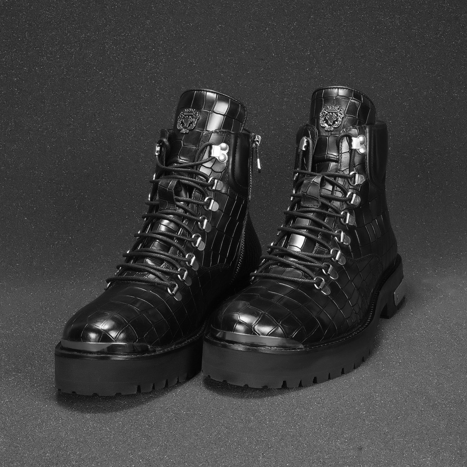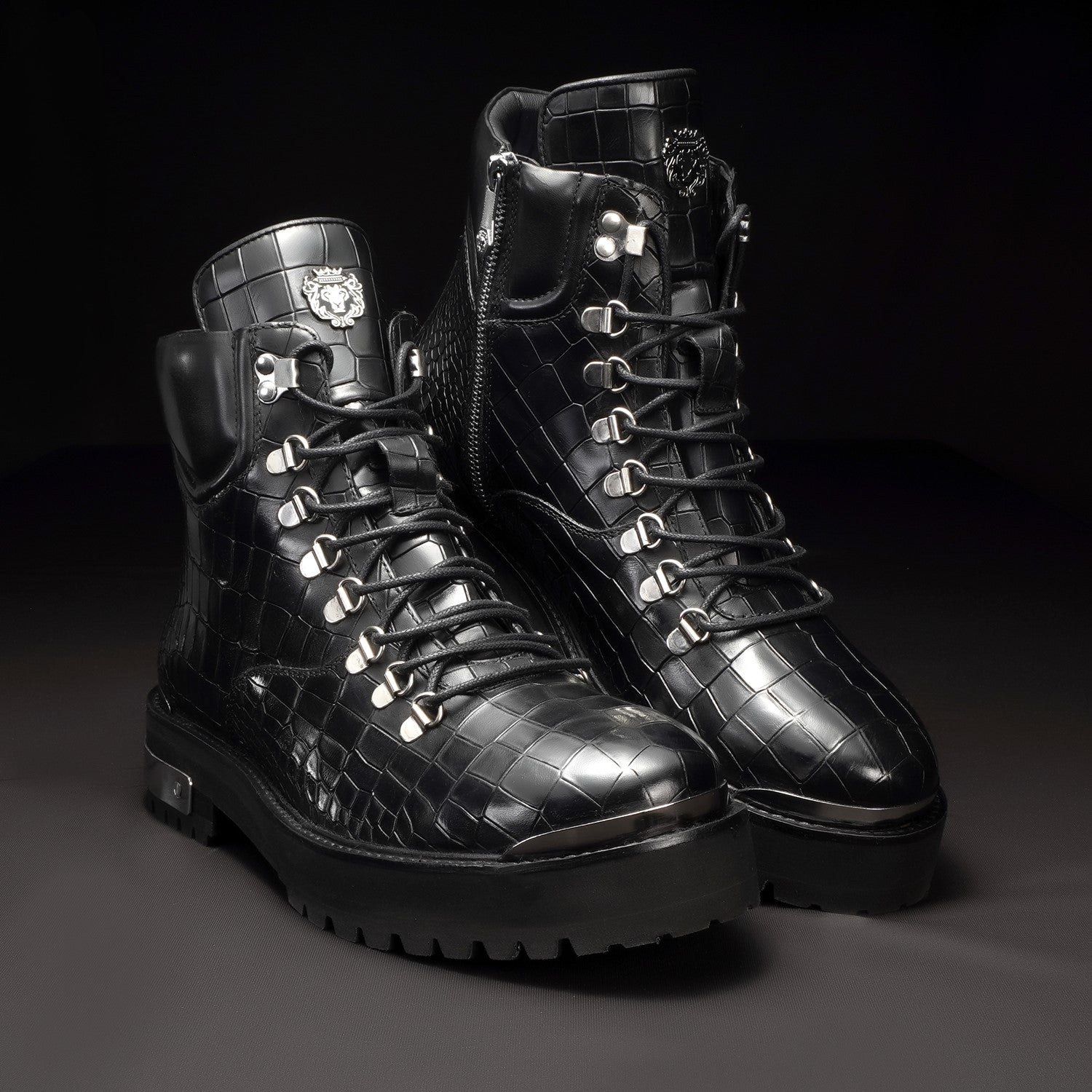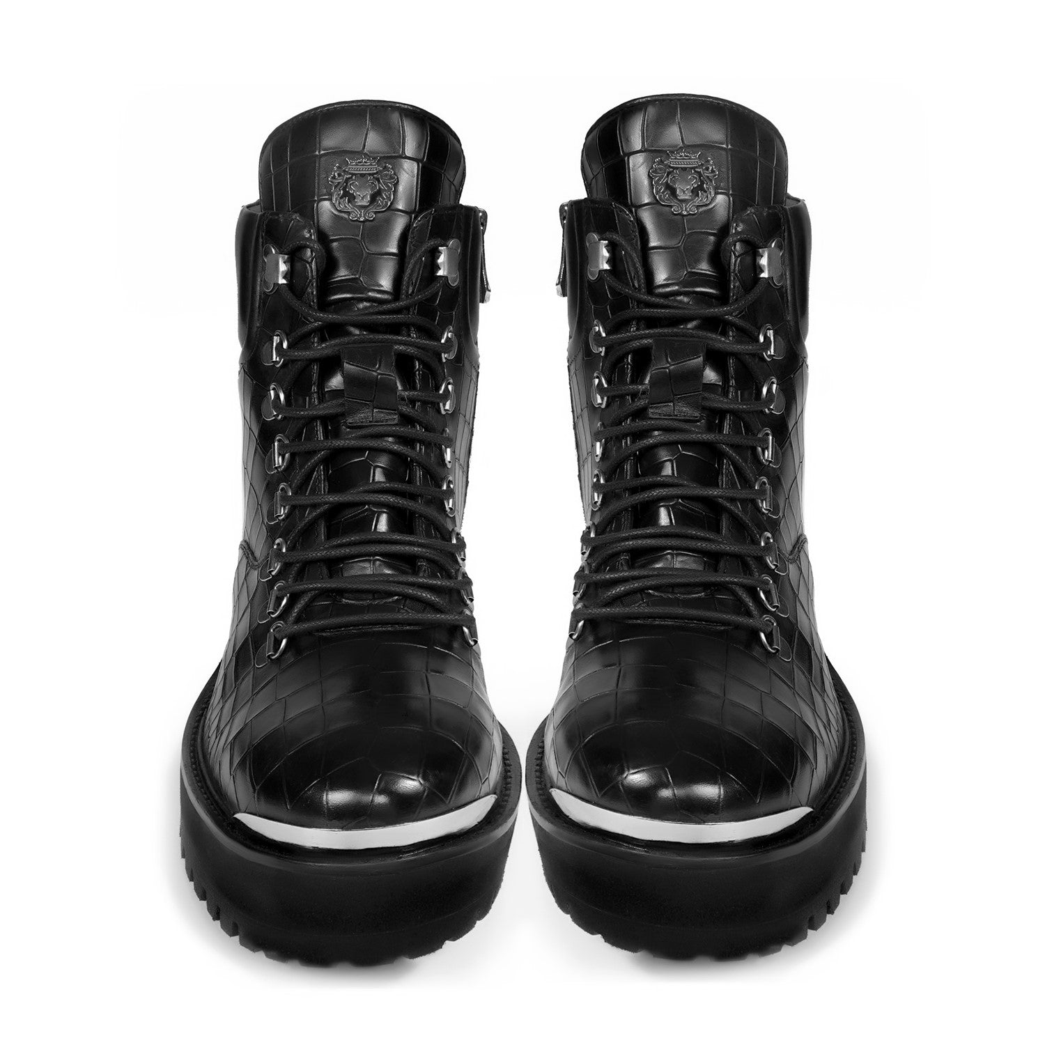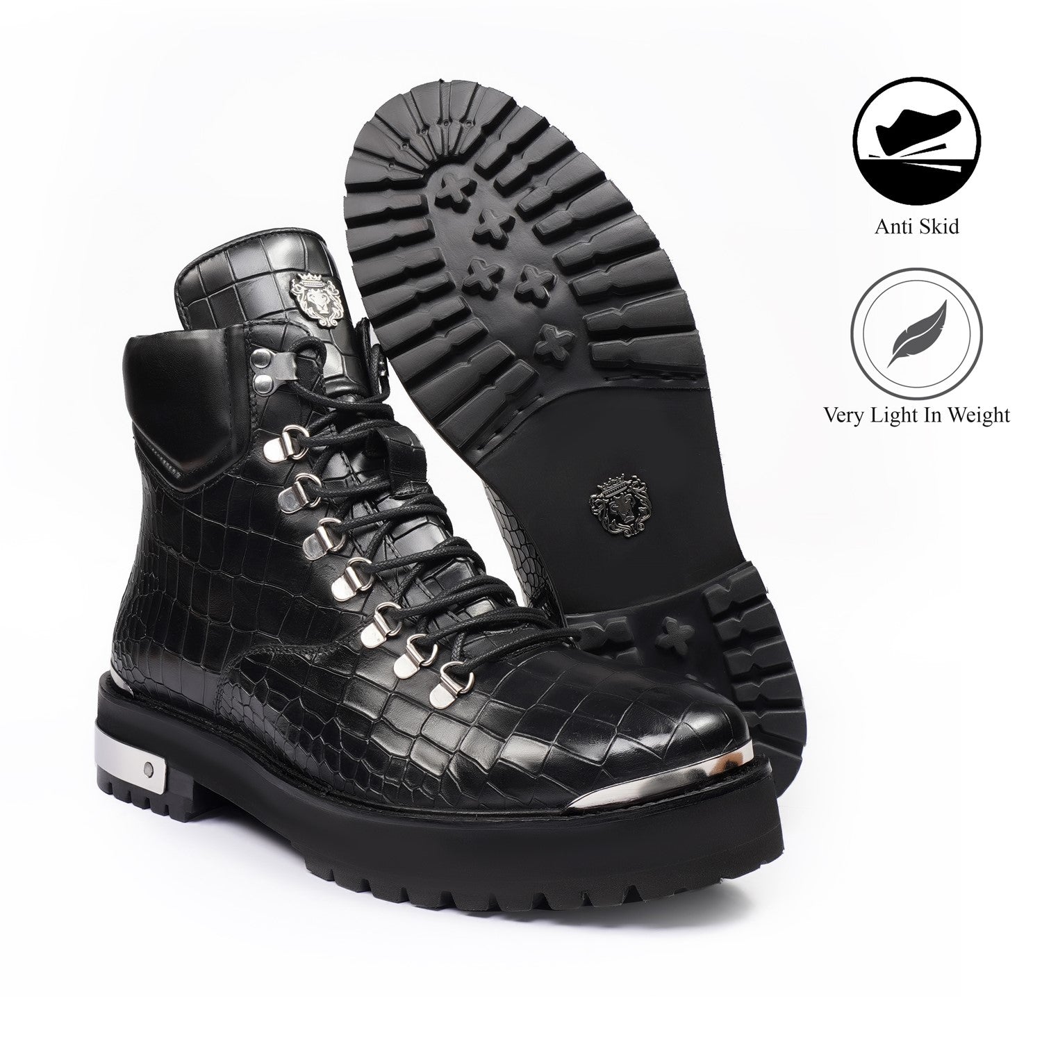 Elevate your footwear collection with these premium boots, crafted from a combination of luxurious croco leather. Featuring a lightweight yet durable chunky sole, these boots offer all-day comfort without compromising on style. The silver D-ring eyelets and metal lion logo add a bold touch, while the padded collar ensures superior ankle support.