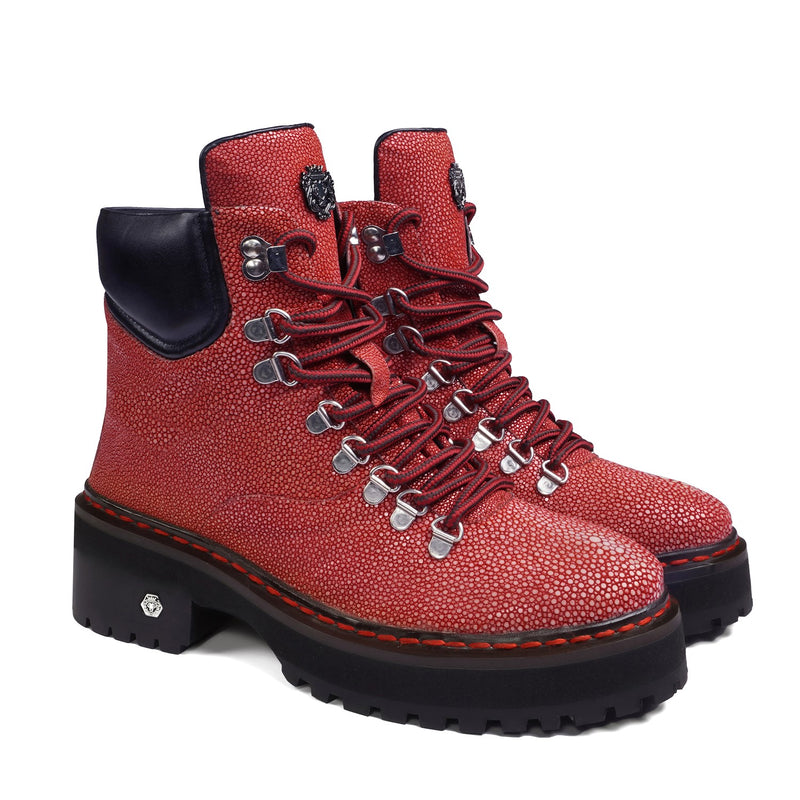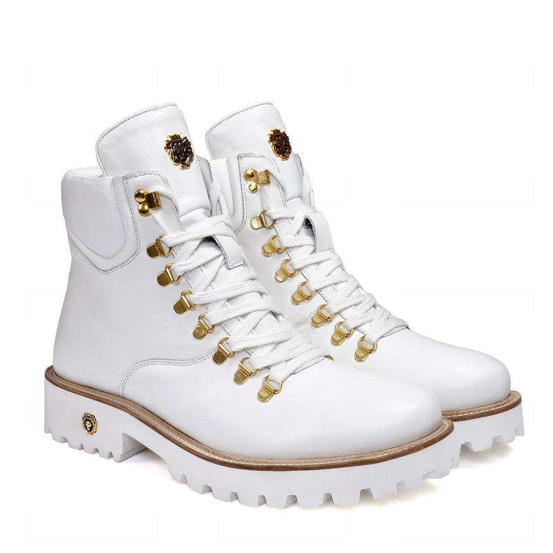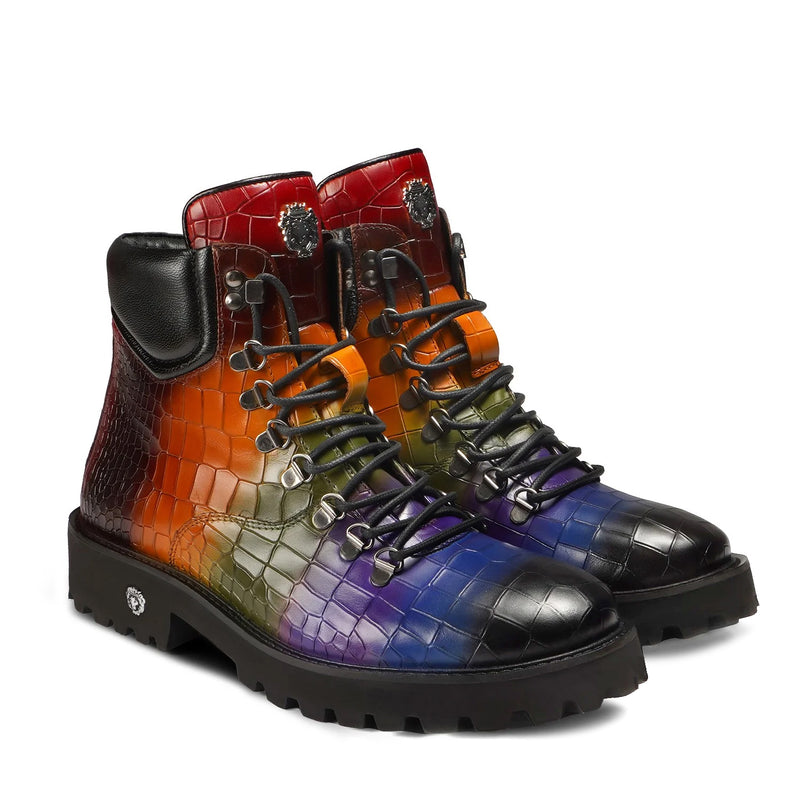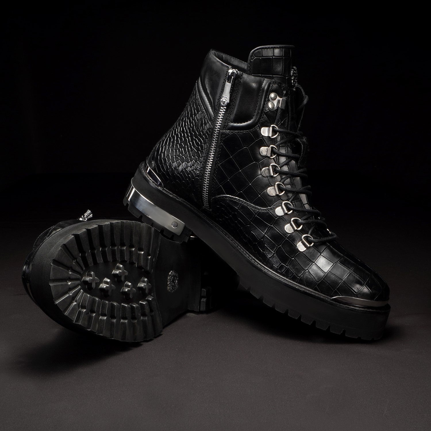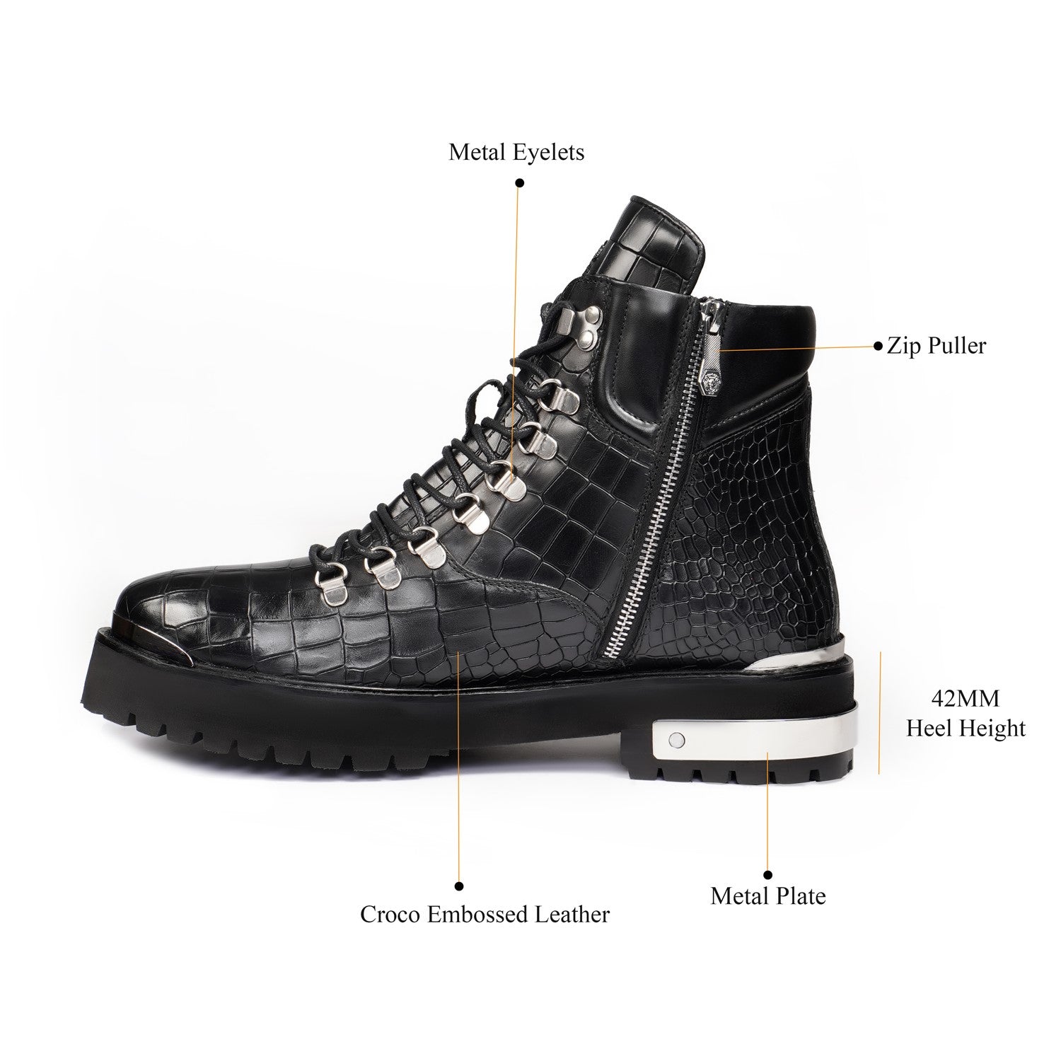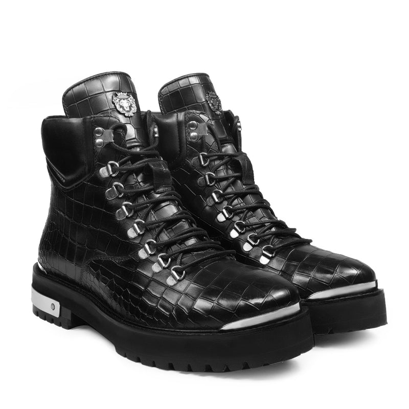 Elevate your footwear collection with these premium boots, crafted from a combination of luxurious croco leather. Featuring a lightweight yet durable chunky sole, these boots offer all-day comfort without compromising on style. The silver D-ring eyelets and metal lion logo add a bold touch, while the padded collar ensures superior ankle support.
