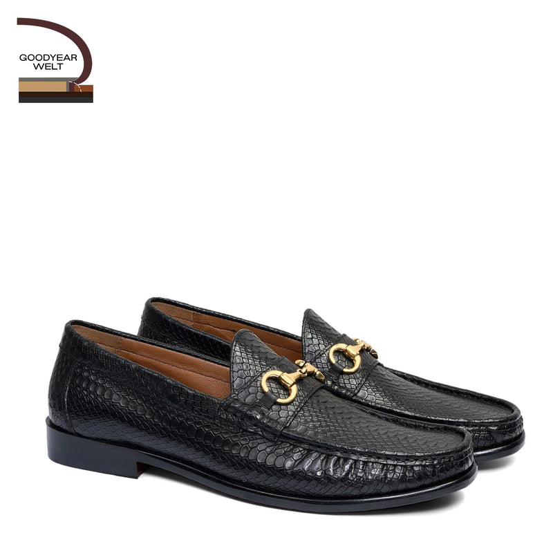 Men's Black Goodyear Welted Sole Loafers in Croco Textured