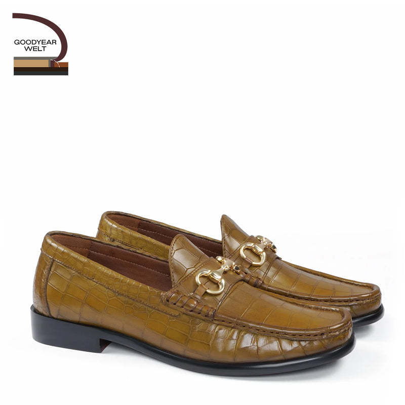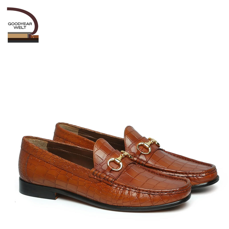 A modern twist on the classic moccasin slip-ons shoe is style thing to admire. The deep cut croco print leather looks very elegant. The golden horse-bit on the croco textured black leather enhances the chic style further. The hand painted burnished effect on the genuine leather surface showcases the masterpiece level art. The contrasting leather sole glorifies the overall accent of the shoe.