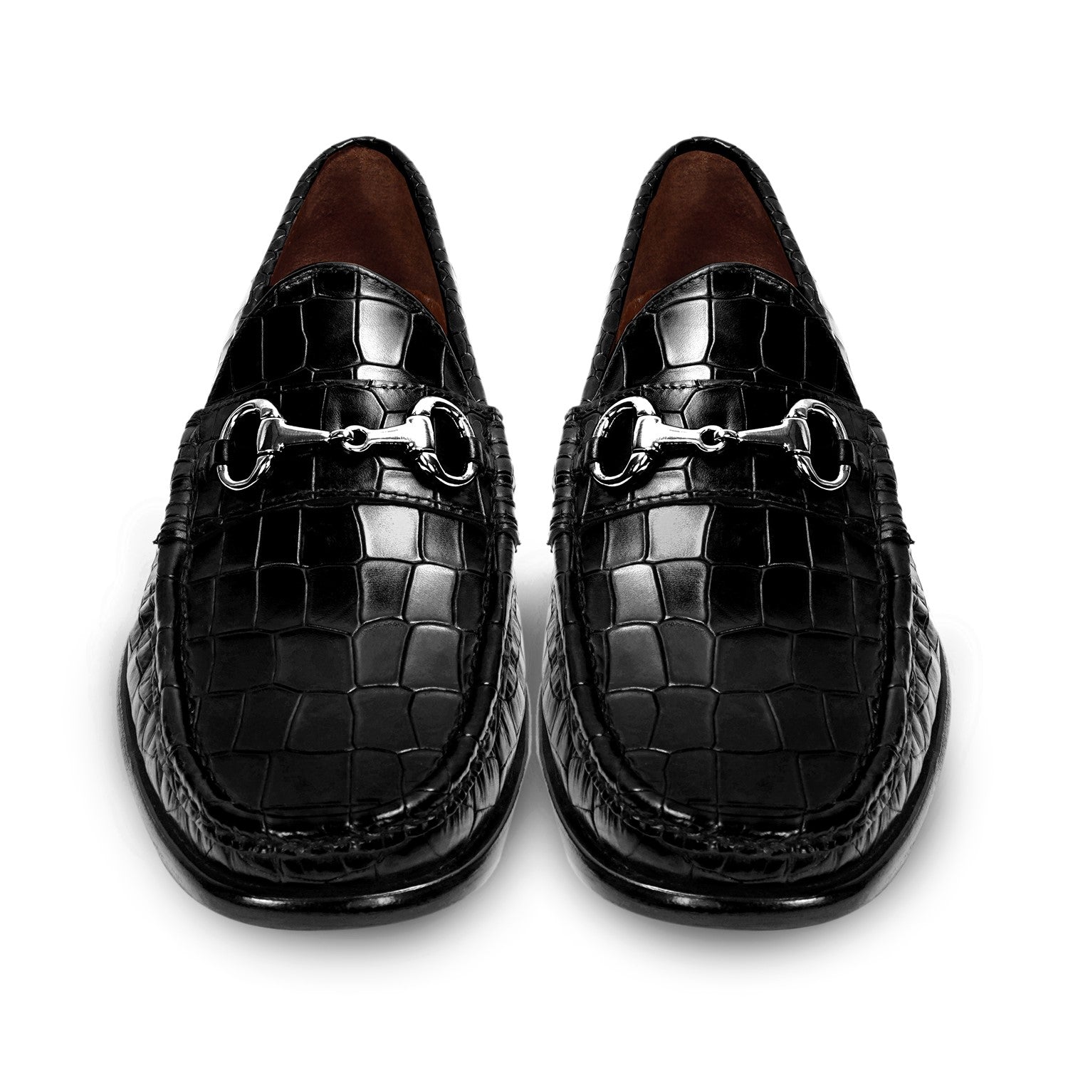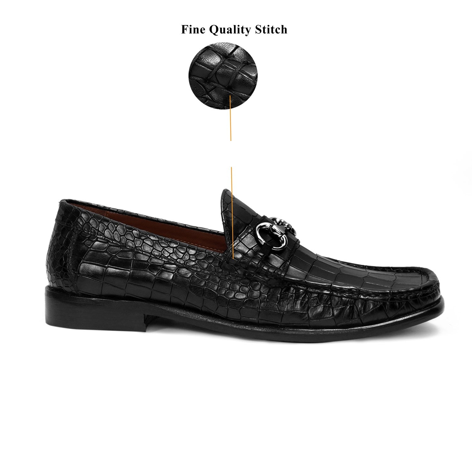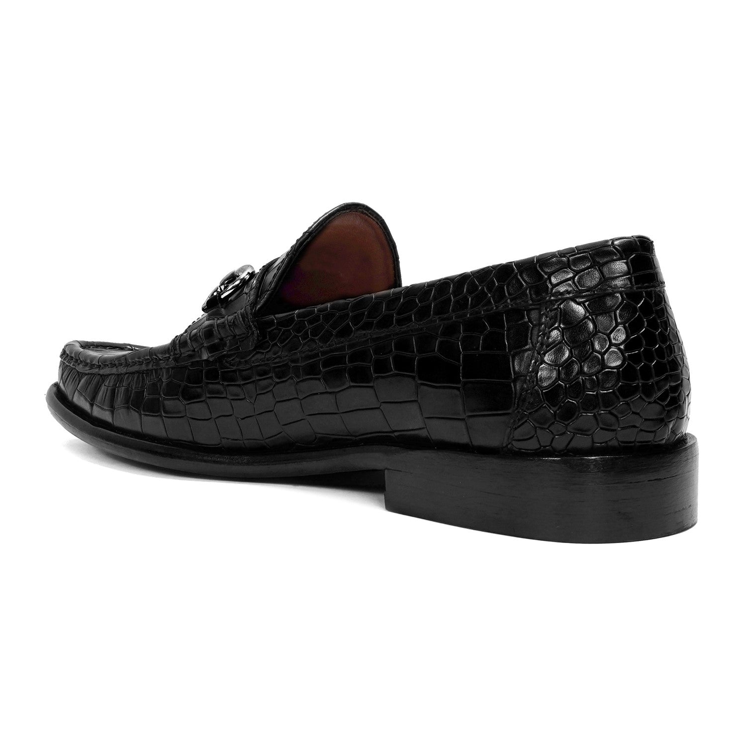 Black Croco Textured Leather Loafer With Horsebit Silver Detailing