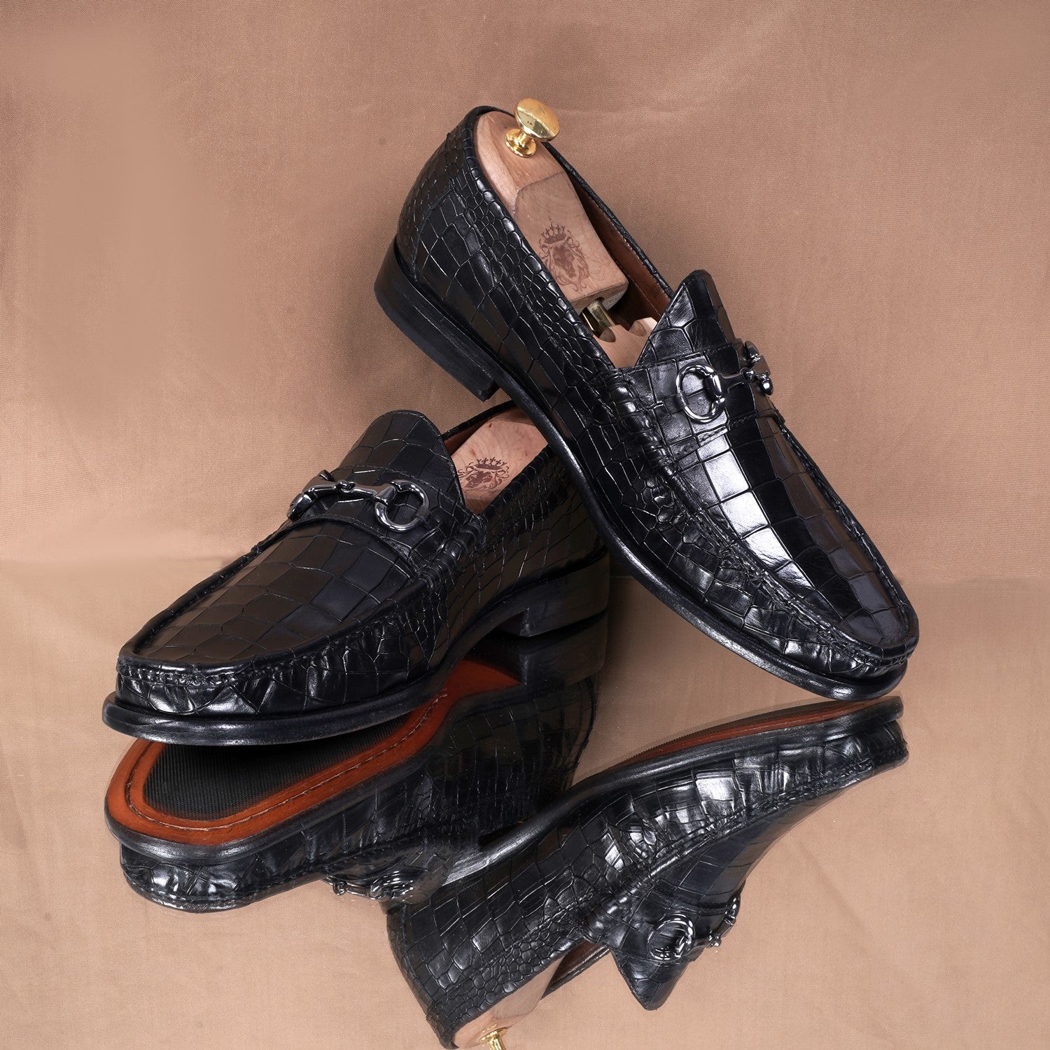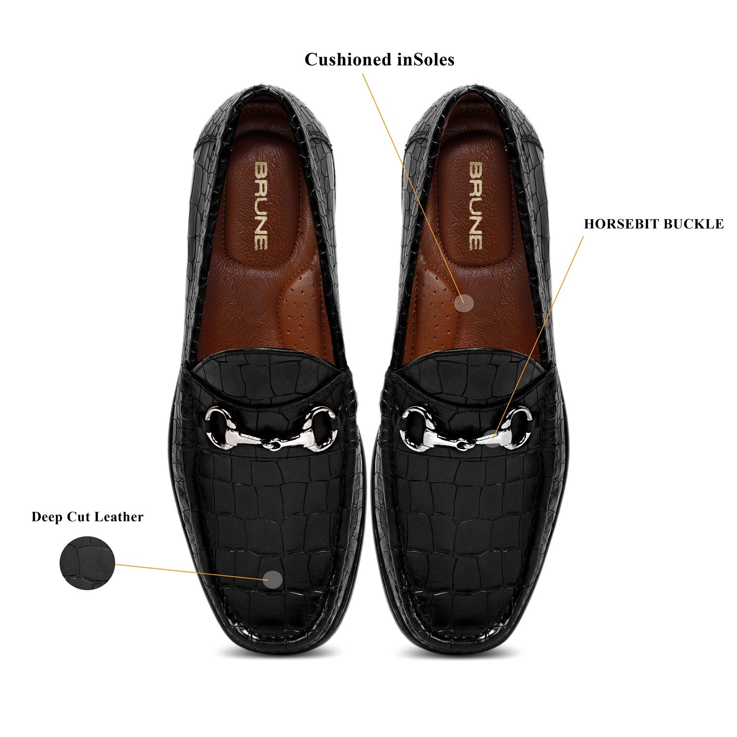The black deep cut croco textured leather loafers by Brune & Bareskin are a luxurious and stylish footwear option. These loafers feature a sleek and sophisticated design, perfect for both formal and casual occasions. The upper is made of high-quality genuine leather with a deep cut croco texture, adding a touch of elegance and uniqueness to the loafers. The black color provides a classic and versatile look, allowing them to be easily paired with various outfits. Adding to the aesthetic appeal, the loafers are adorned with a golden horse-bit detail, providing a subtle yet eye-catching accent. Rubber anti-skid sole ensures stability and traction, providing a secure grip on various surfaces. Whether you're walking on slippery floors or uneven terrain, these loafers will keep you steady and confident.