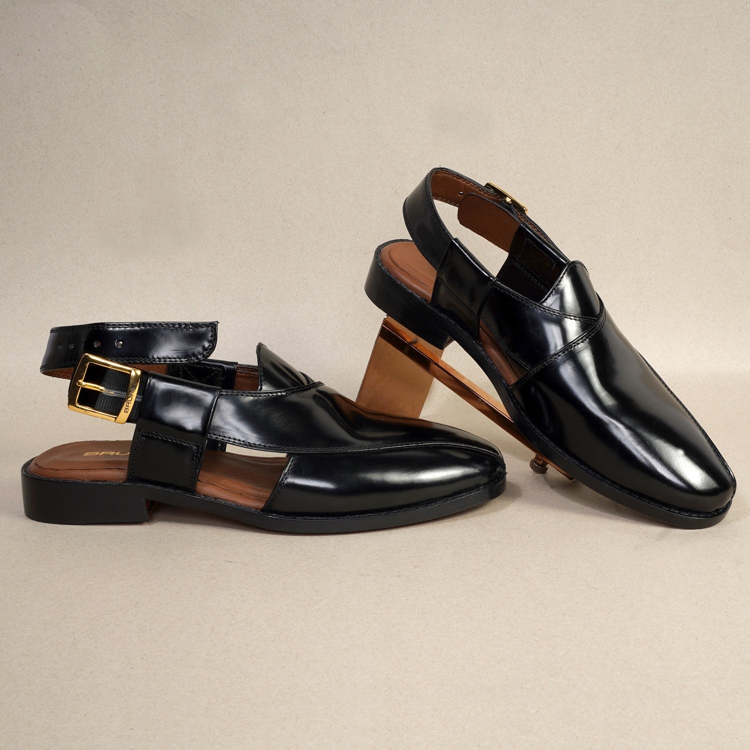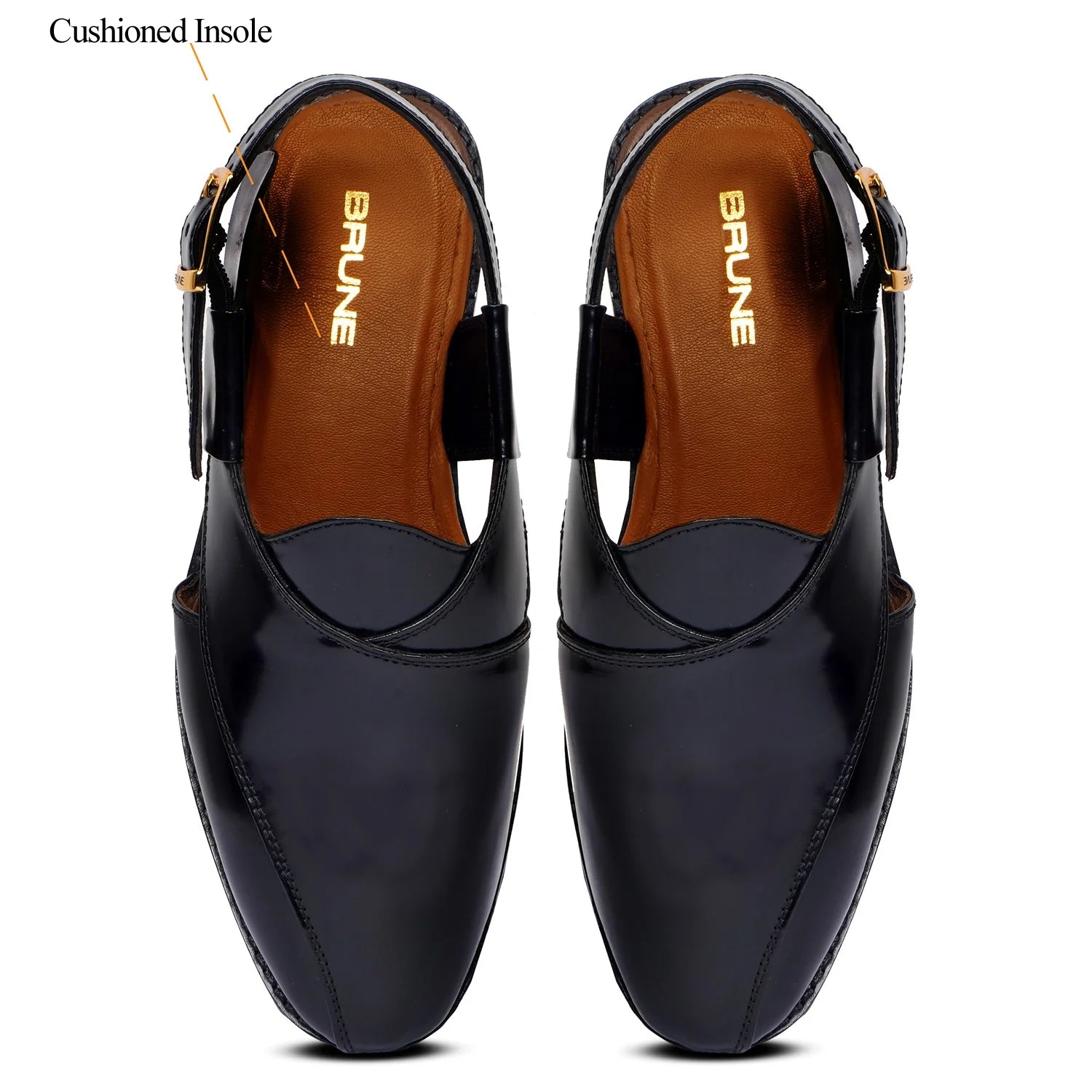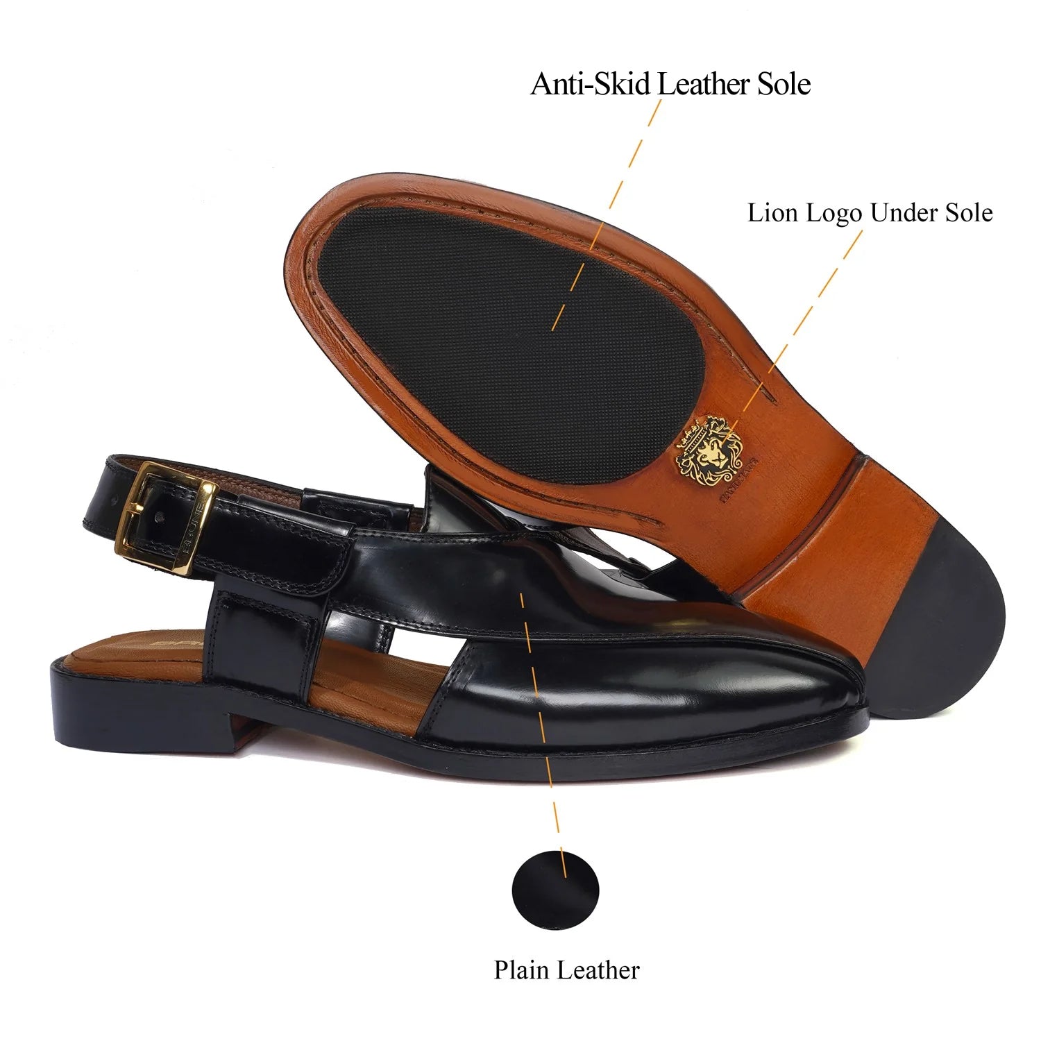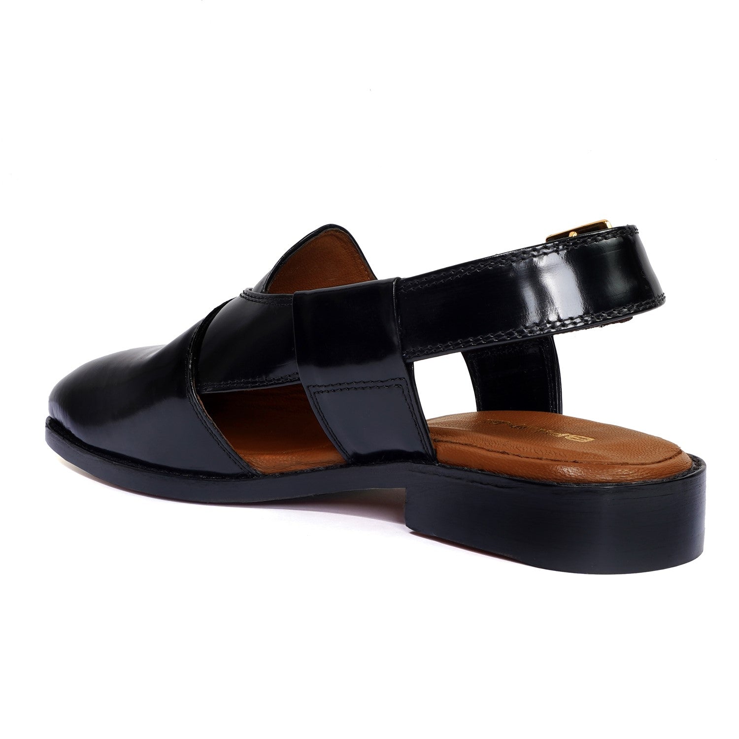 Black Cross-Strap Men's Peshawari Sandals with Leather Sole