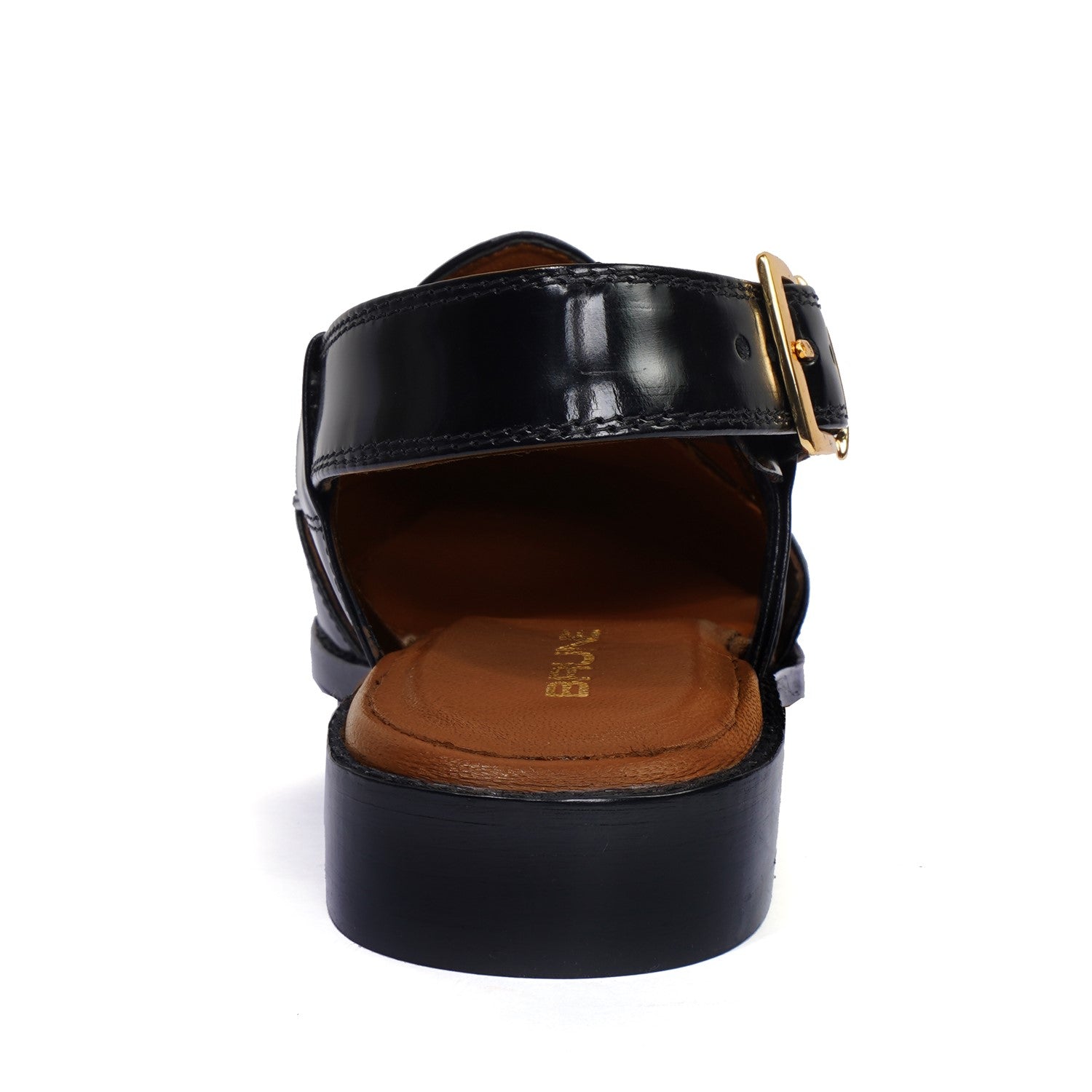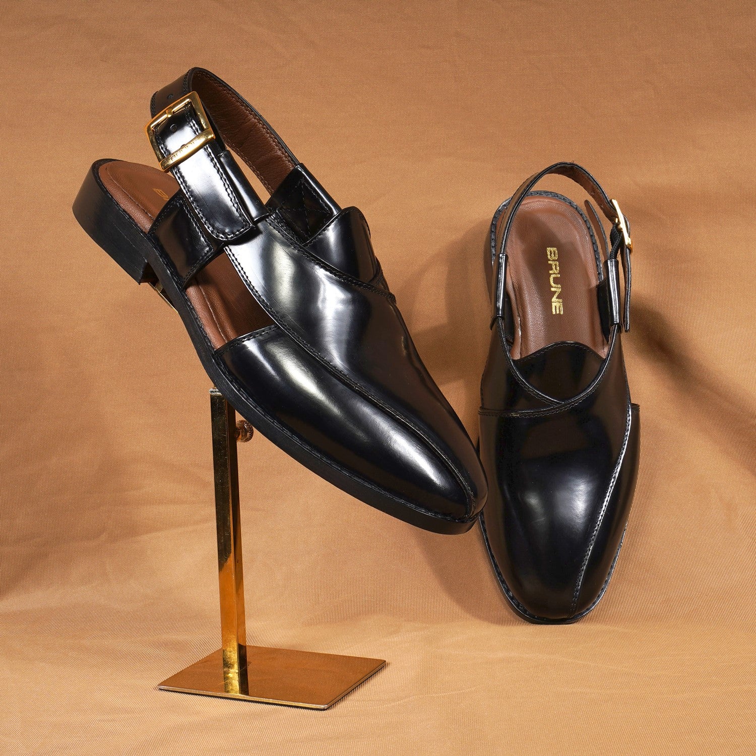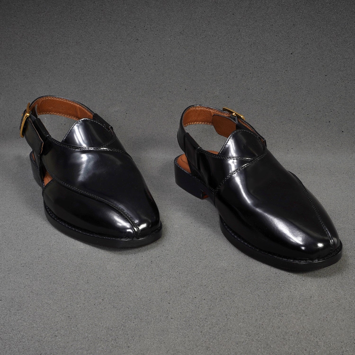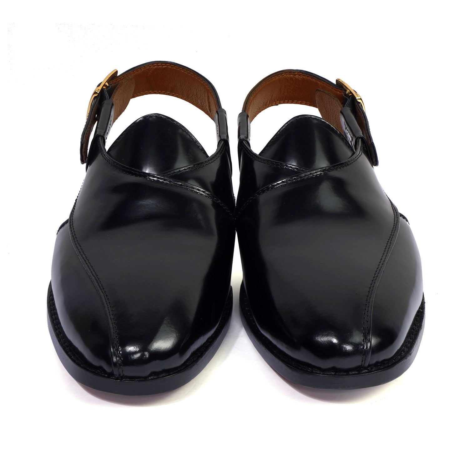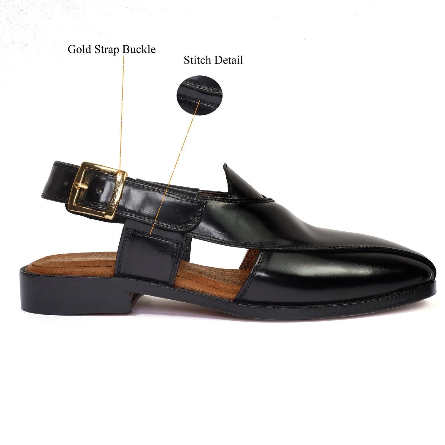 Black Cross-Strap Men's Peshawari Sandals with Leather Sole