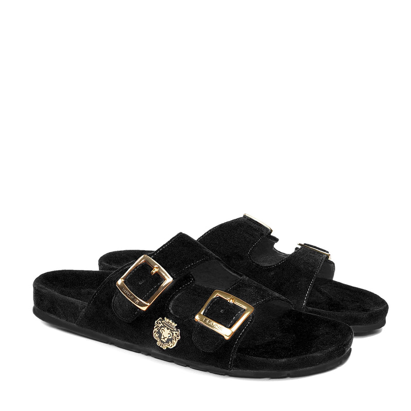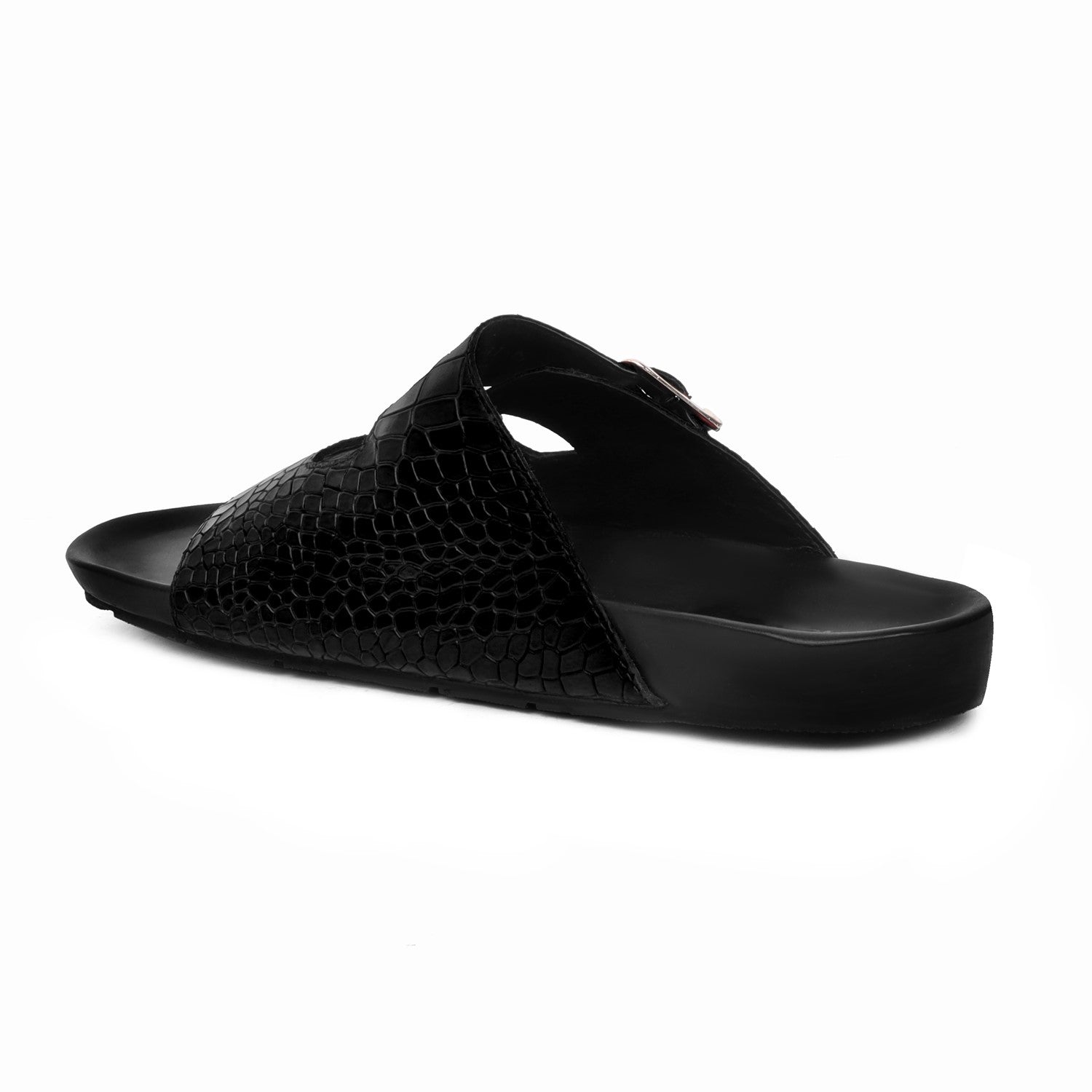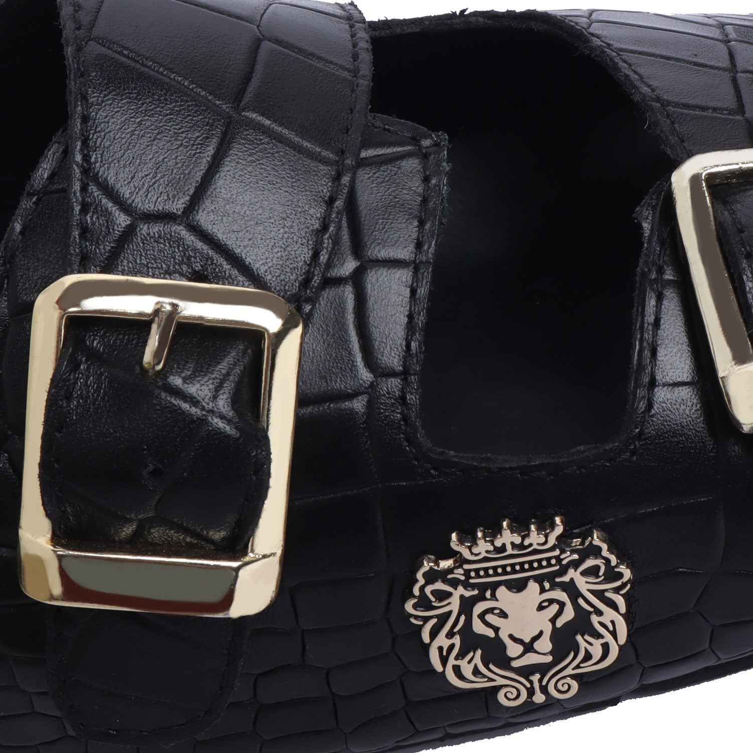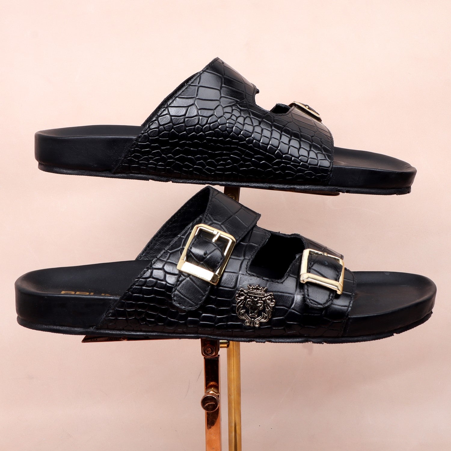 Adjustable Buckle Slide-in Slippers in Black Croco Textured Leather