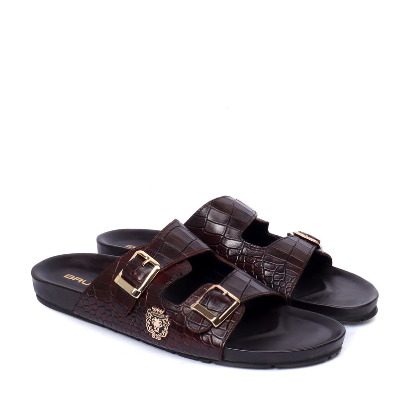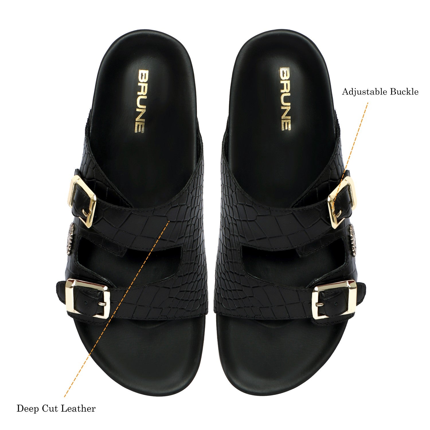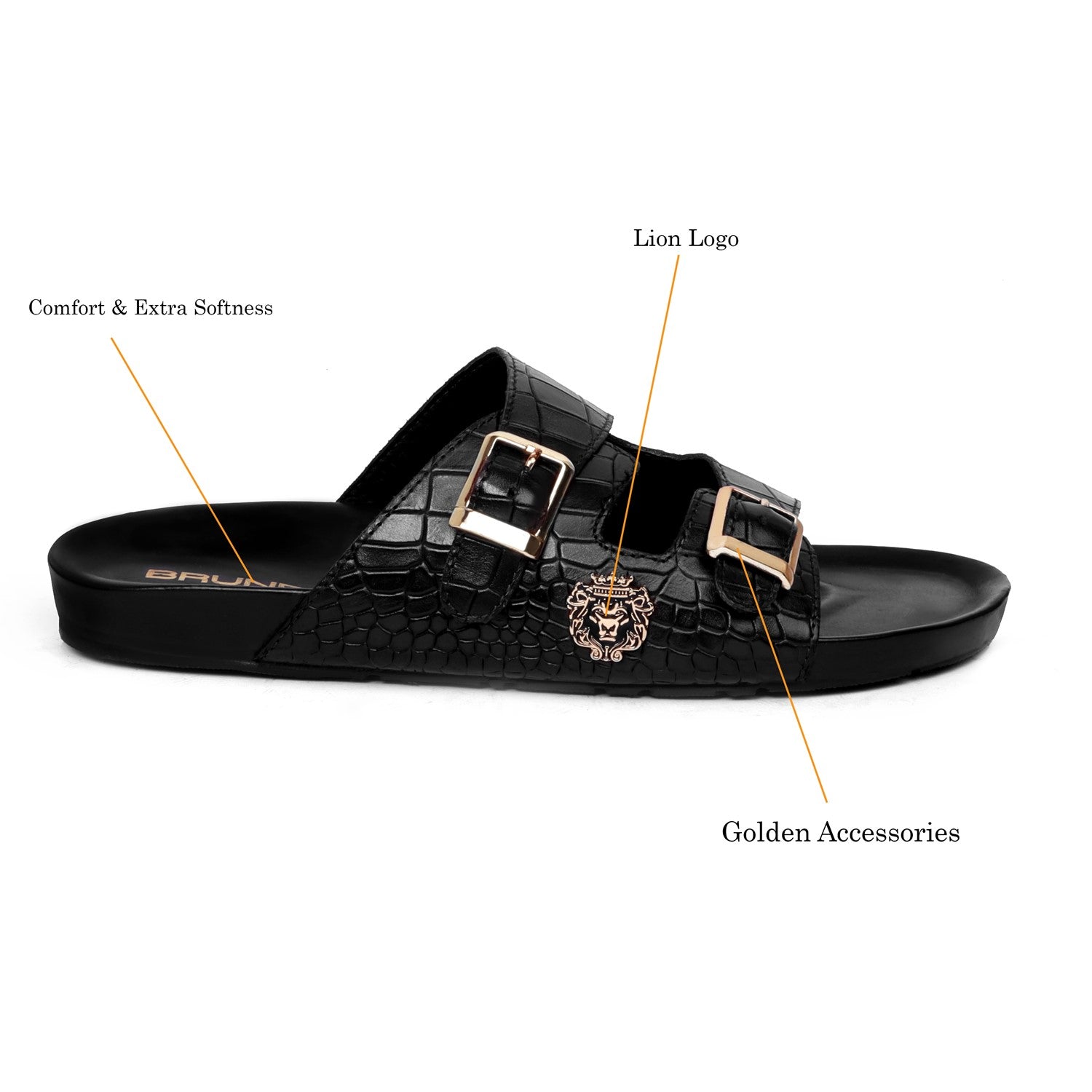 When it comes to Slippers, comfortably is the highest priority. These Cut Croco leather Slippers are the luxurious piece of beauty from Brune & Bareskin. These Double Monk Leather slippers are a must-have of the season. Double Monk Deep cut Croco Adjustable buckle strap spells freedom and the casual lifestyle. The gel injected memory foam base is designed to provide you comfort while walking. We use special layering techniques to keep the base cozy and retain its shape. Cut Croco Adjustable buckled strap endows the extra room for every foot. The wider straps Design with BRUNE & BARESKIN Lion Logo enhance the elegance further. Anti-Skid outer leather sole ensures the perfect walking grip. Carry these with Jeans, Shorts, Capri's, and other casual wear to be a style leader.