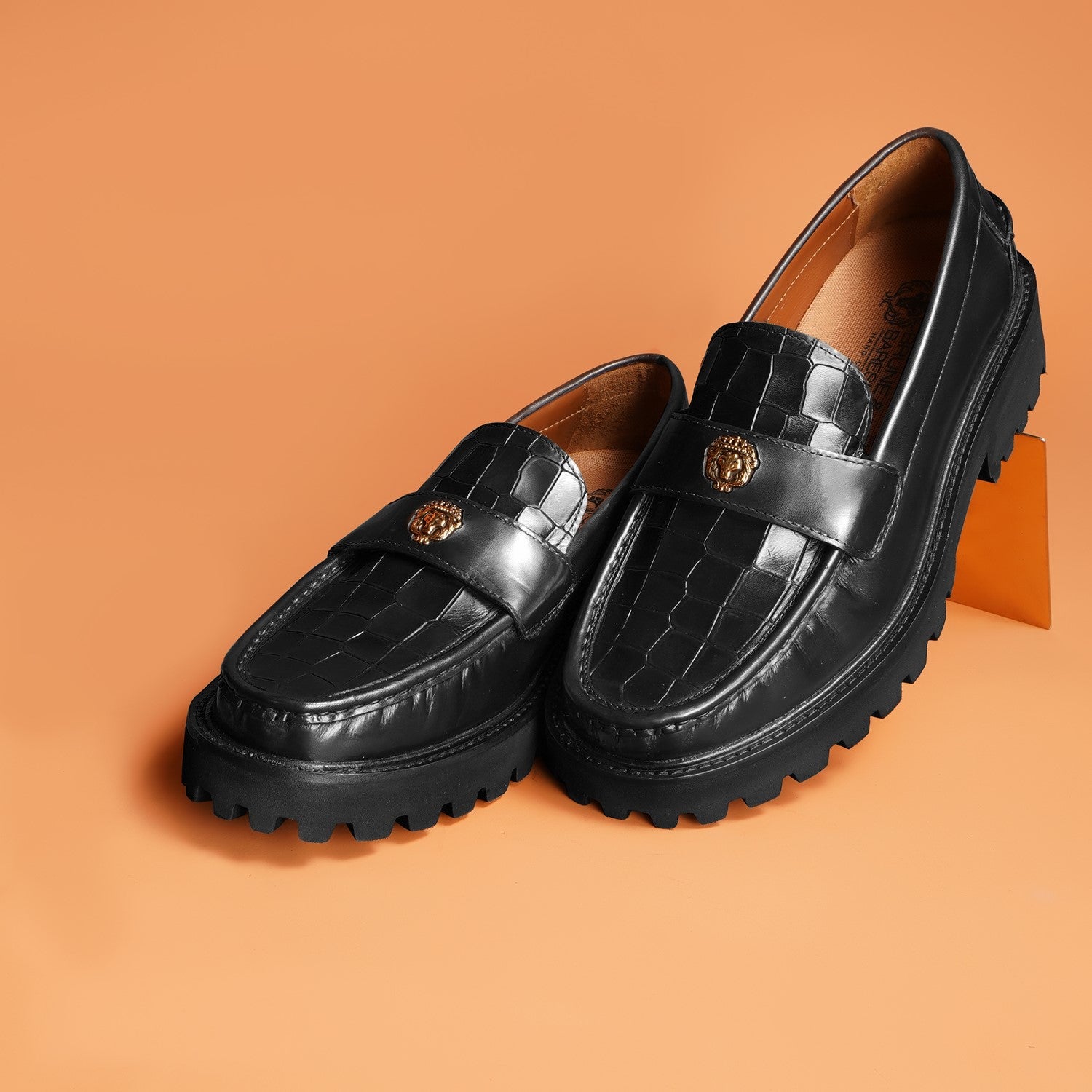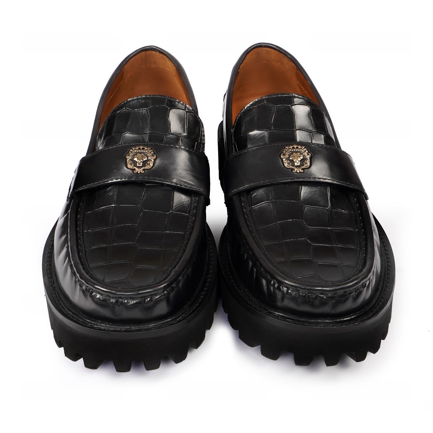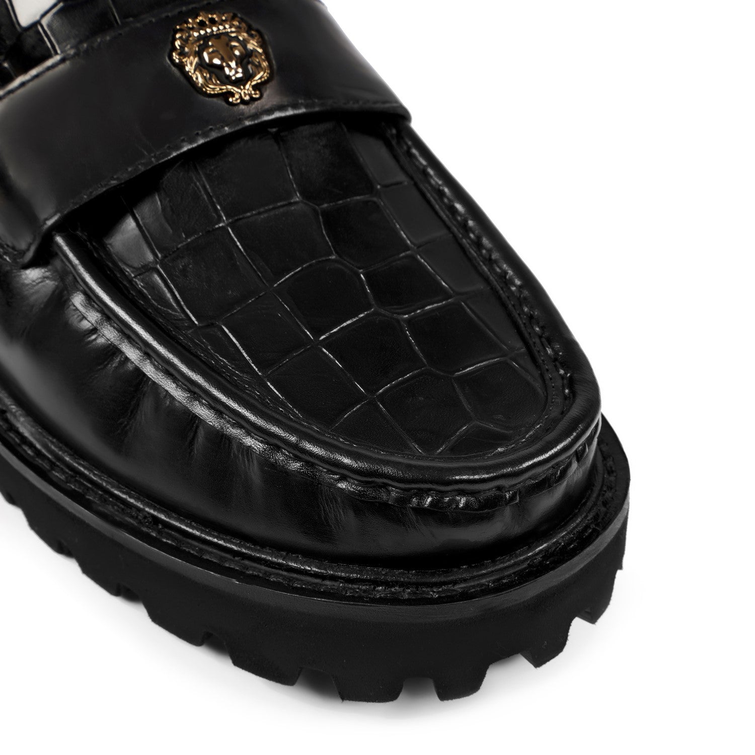 Black Deep Cut Croco Chunky Sole Loafers with 3D Golden Lion Logo