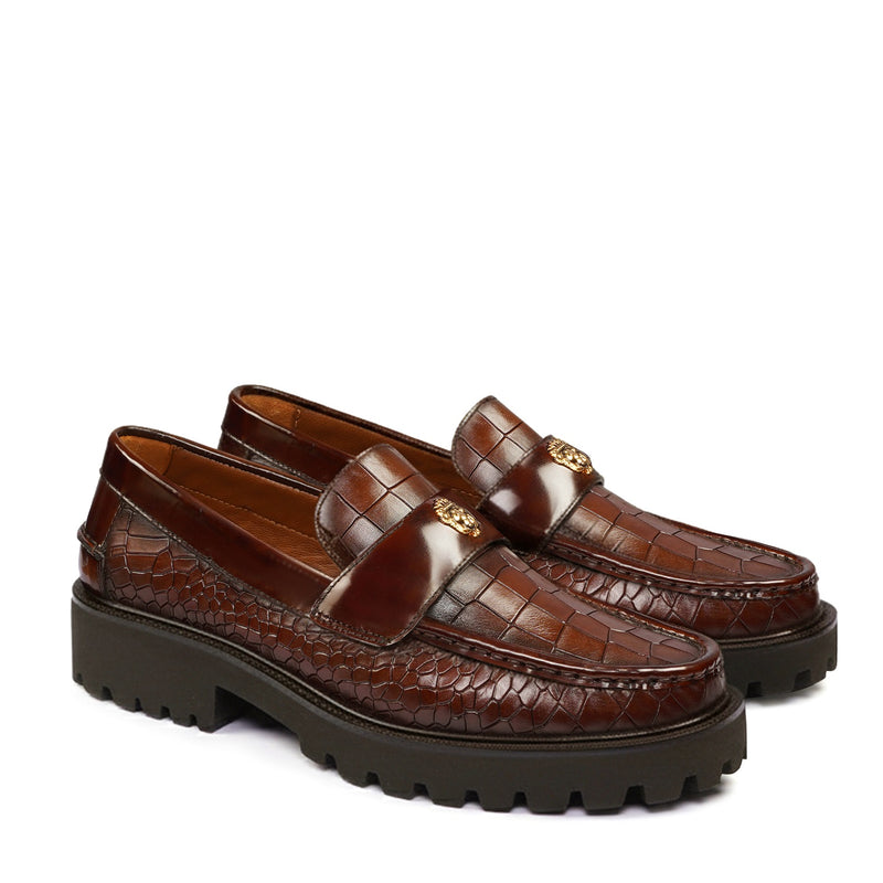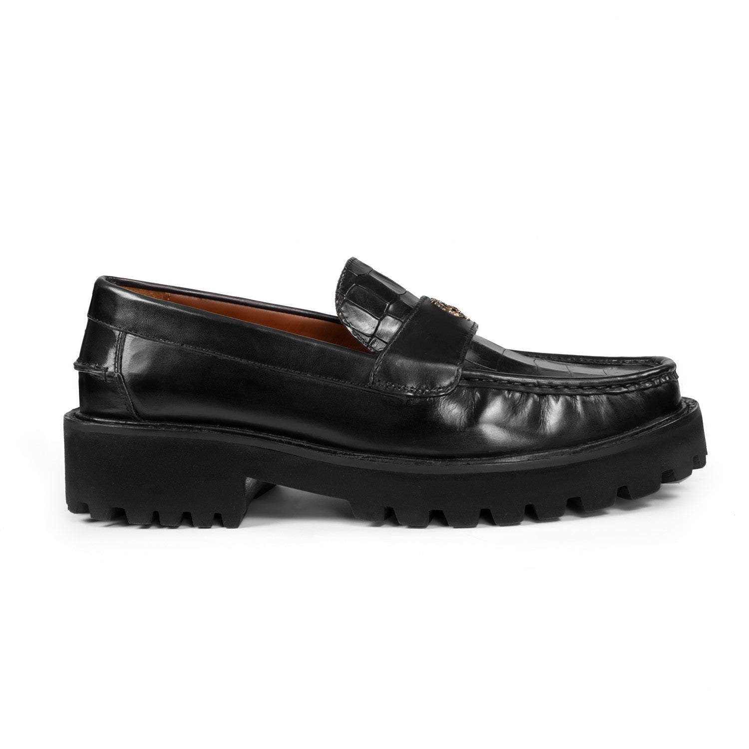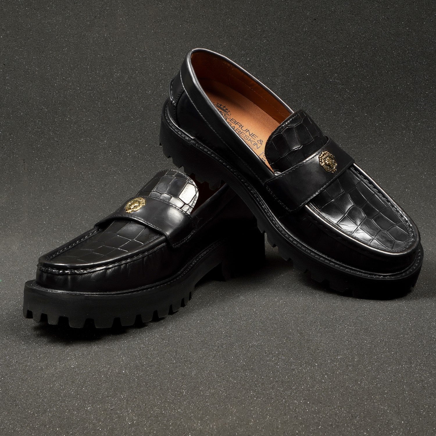 Black Deep Cut Croco Chunky Sole Loafers with 3D Golden Lion Logo