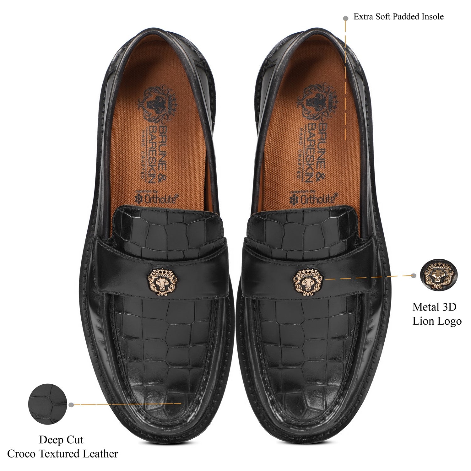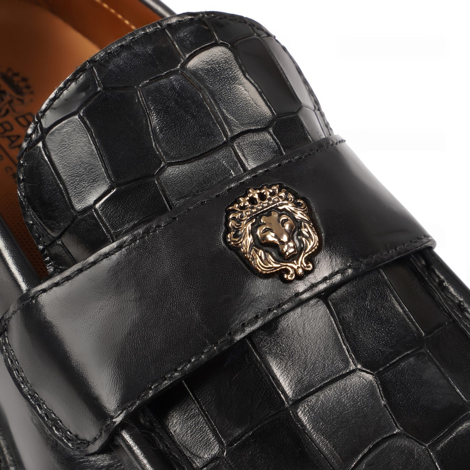 Black Deep-Cut Croco Loafers, designed with a brushed off leather strap and a signature 3D metal lion logo.