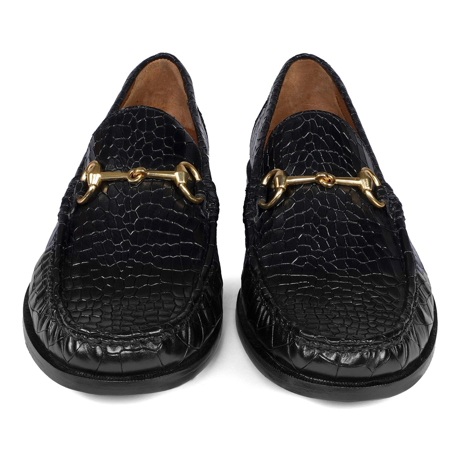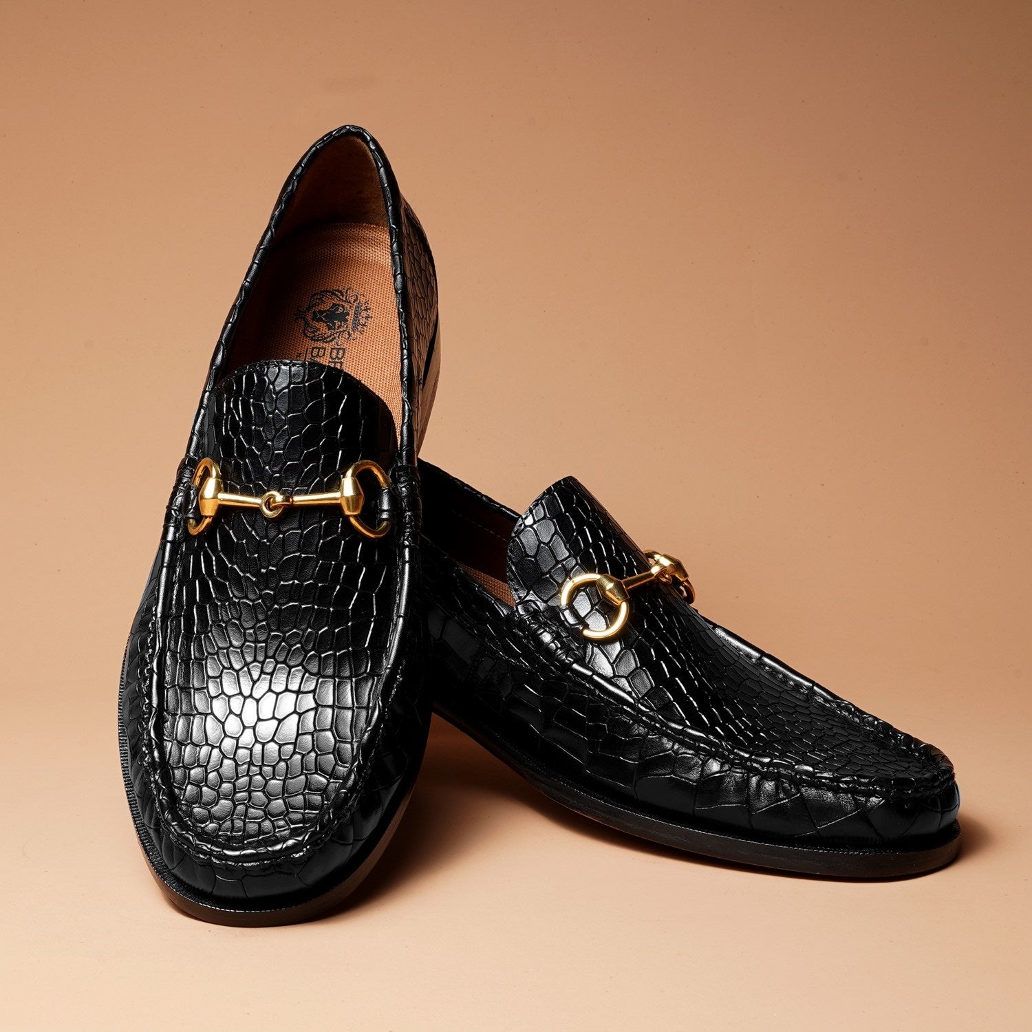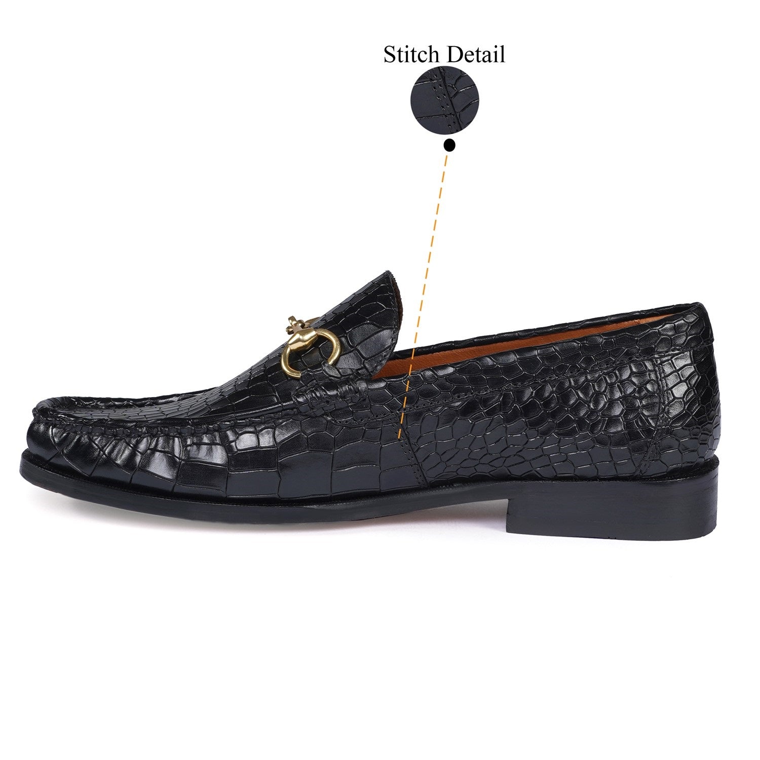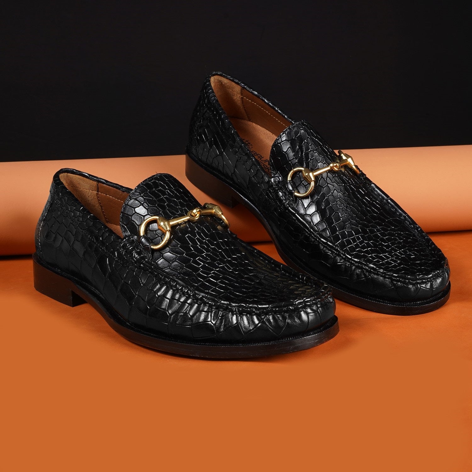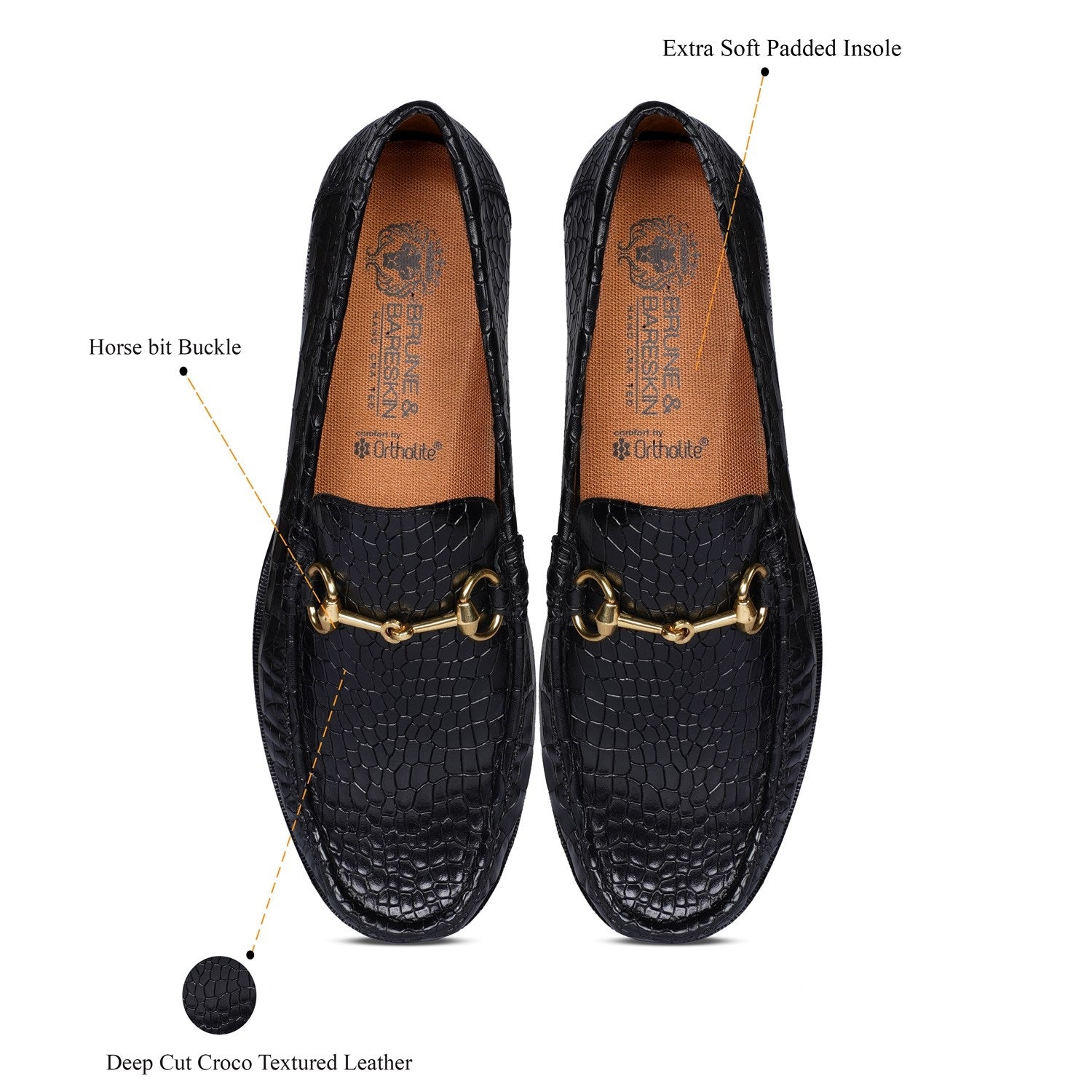 Experience unrivaled comfort and style with our Extra Comfort & Soft Loafers. Slip into these black Deep Cut Croco leather shoes, featuring a golden horse-bit buckle and stitched detailing on the heel cap.