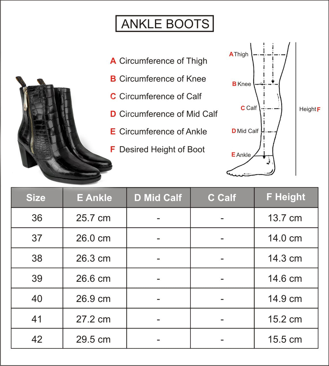 An elegant design for the fashion-forward ladies out there. The high ankle length ensures to look good from casuals to formal attires. It is the perfect footwear to gift to that perfect woman in your life. It is hand colored in deep darker tone of Black on imported Deep Cut Croco Leather boot. Outer side zip and inner side elastic provides the extra convenience to wear it. The greater detailing at the ankles with rectangular elastic pockets, lend a classy look to these leather shoes. The stitched leather on the side elastic provides a more streamlined look to it. High Raise blocked heel adds up the extra elegance to look. The color can also be customized further with your matching apparel. This shoe can be customized according to your liking.