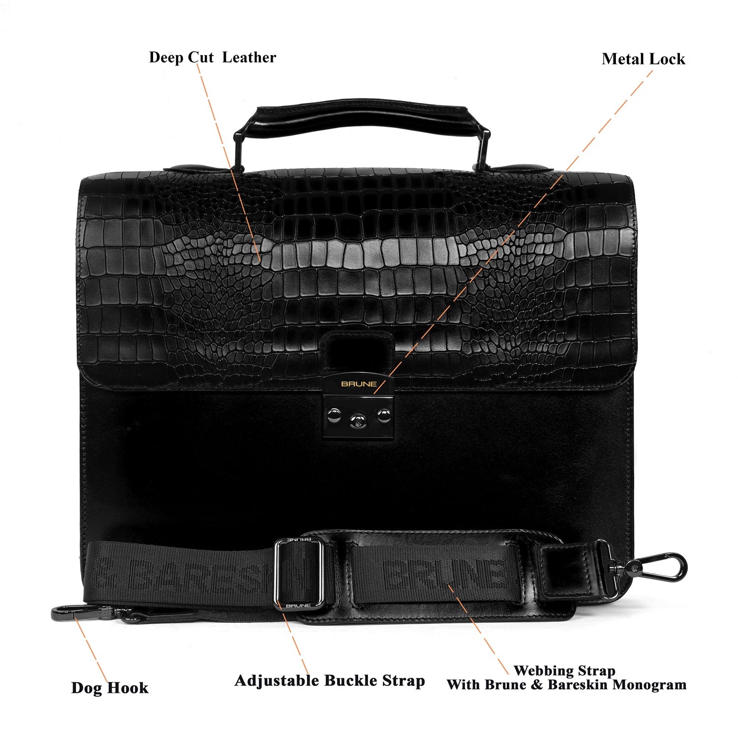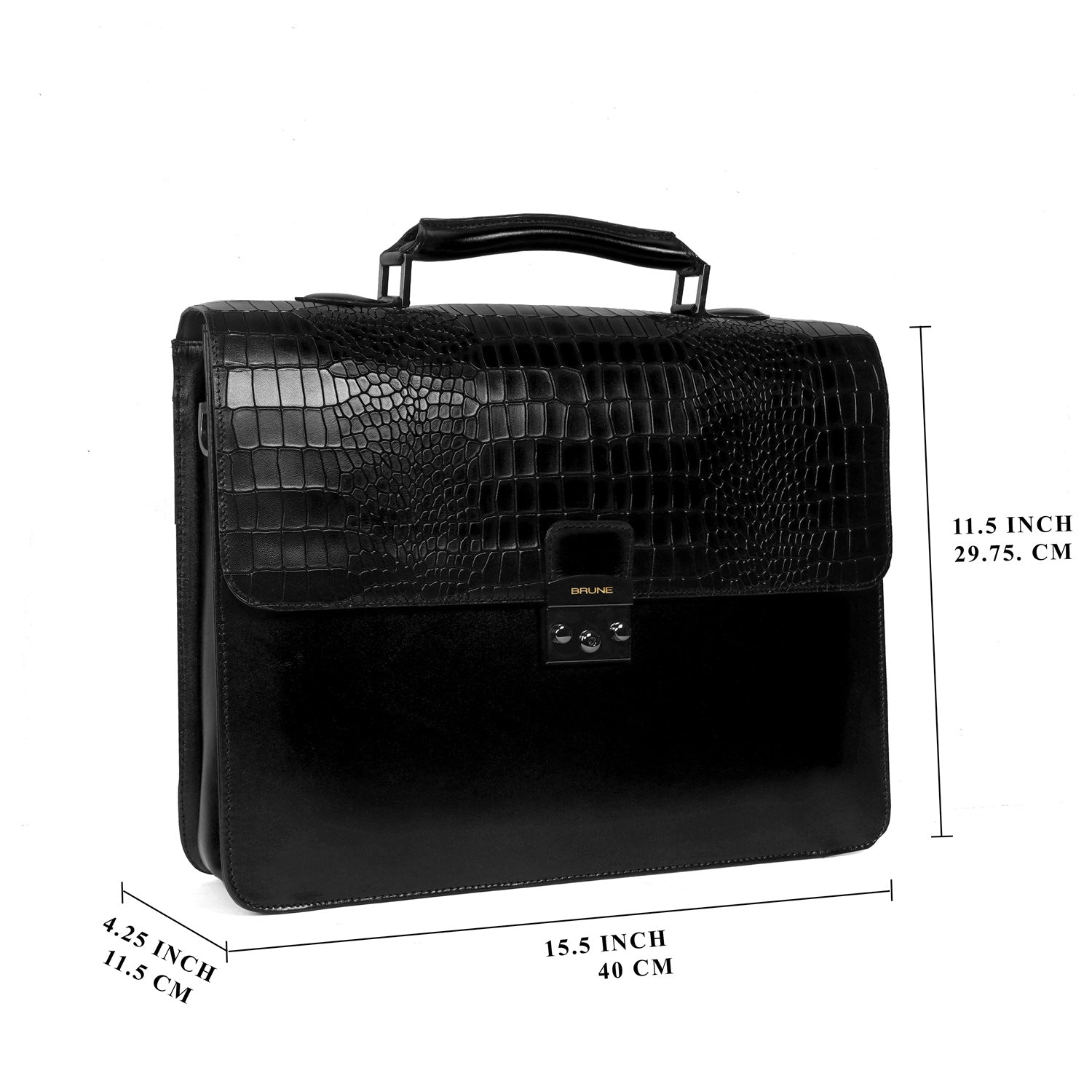 The Black laptop Briefcase by Brune & Bareskin adds a touch of sophistication to your business meetings and travel. Handcrafted from genuine and deep cut croco textured leather, this premium briefcase offers a unique and stylish look, while the durable quality ensures long-lasting use. Stay organized with dedicated pockets for documents, pens, cards, and a padded laptop sleeve, while the gunmetal secured push button flap and backside zipper pockets provide extra security. Complete with a removable shoulder strap and branded monogram, this briefcase makes a perfect impression.