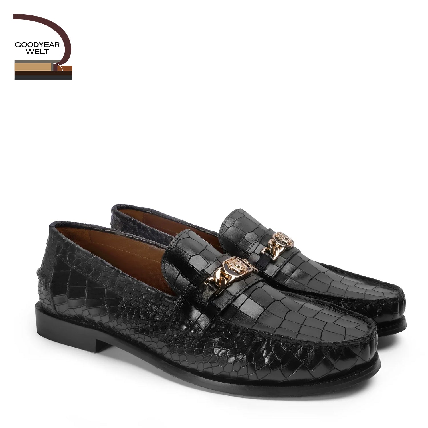 Black Deep Cut Croco Moccasin Goodyear Welted Sole Loafer with Chain Embellishment Trademark Lion Logo