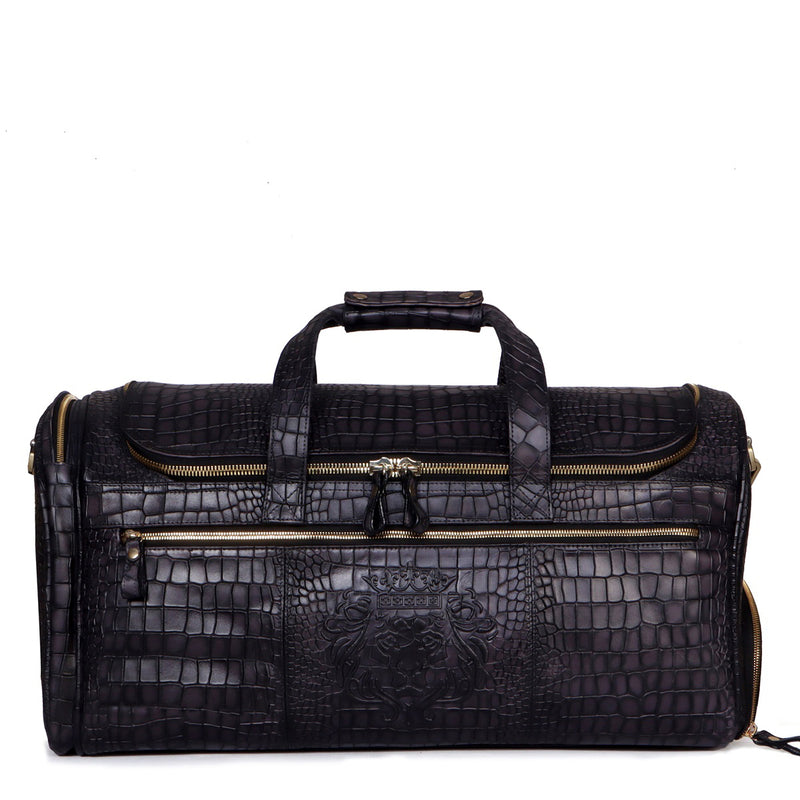 It is a handmade duffle bag that is crafted with precisely selected deep cut croco textured black leather. It is often said that finding the perfect partner for traveling is quite tough, with this croco print bag you will not only find the best but also the most attractive one. It features multiple utility compartments. The large main compartment has ample space to carry the clothes for a long weekend. On the front and back of the bag, it has two large zip pocket compartments to carry the essentials with easy access. It also features a dedicated zip show pocket to carry the footwear. The removable/adjustable shoulder strap provides the needed comfort while carrying it. It also has a handle to carry it quickly by hand. You can change the color and also add your initials with our bespoke services.