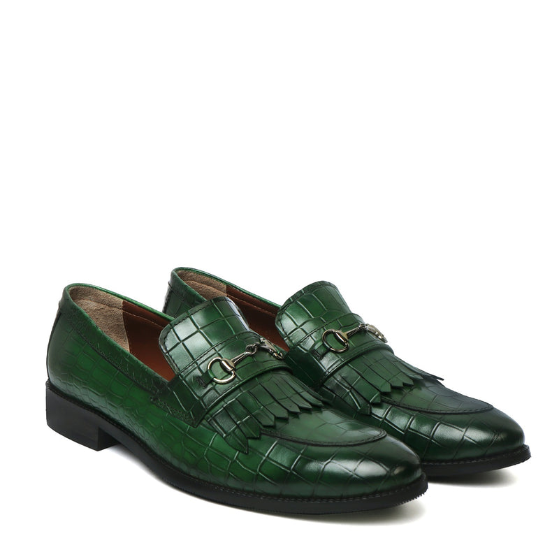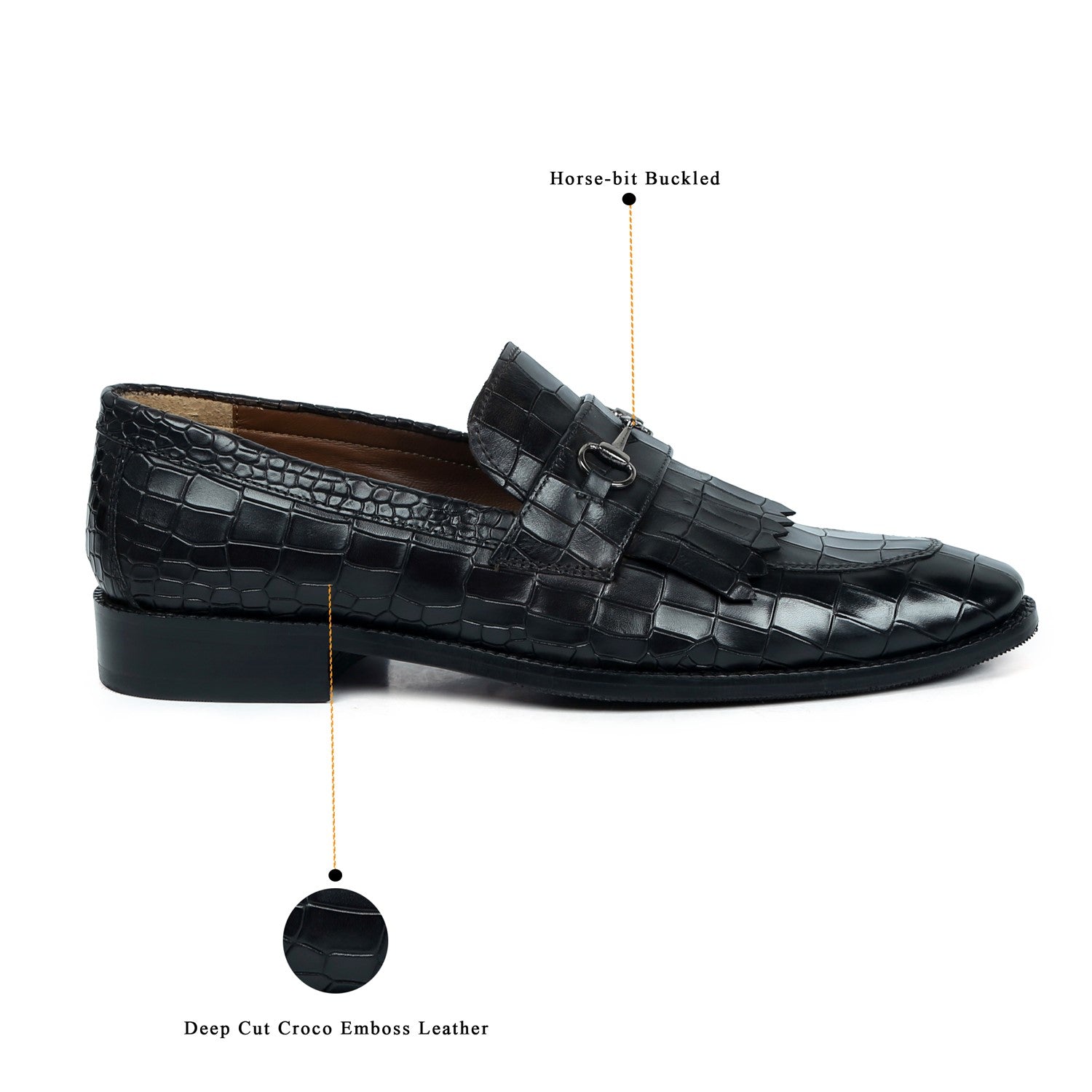 Black Slip-On Shoes in Deep Cut Leather with Fringes Horse-bit Buckled