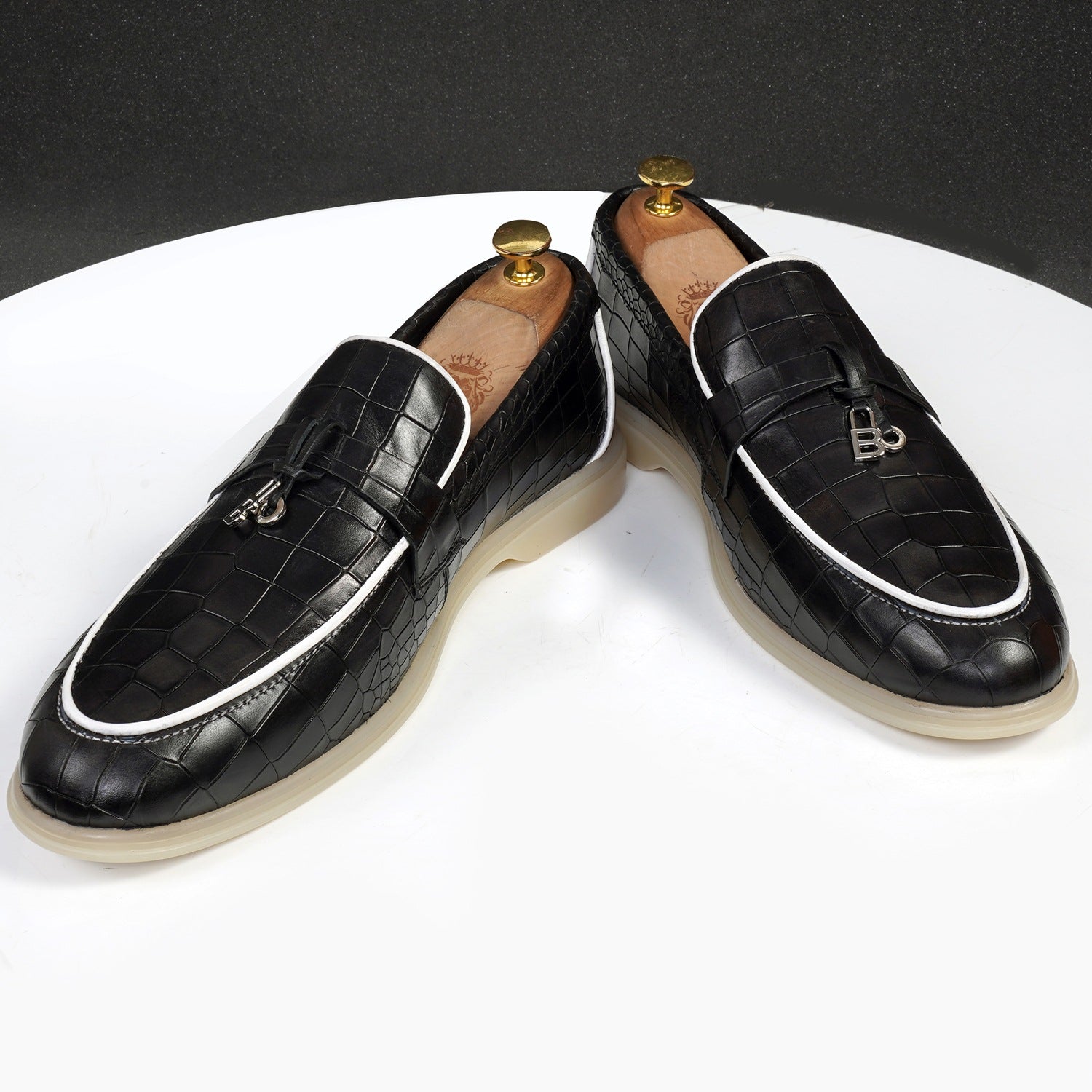 Embody timeless elegance with this Black Deep Cut croco textured Leather Loafer. Crafted from premium Brune & Bareskin leather, these men’s shoes boast a deep cut croco-textured design and feature a tassel metal initial design on the vamp. The rubber sole provide perfect grip for all occasions, while the durable leather ensures the utmost comfort and longevity.