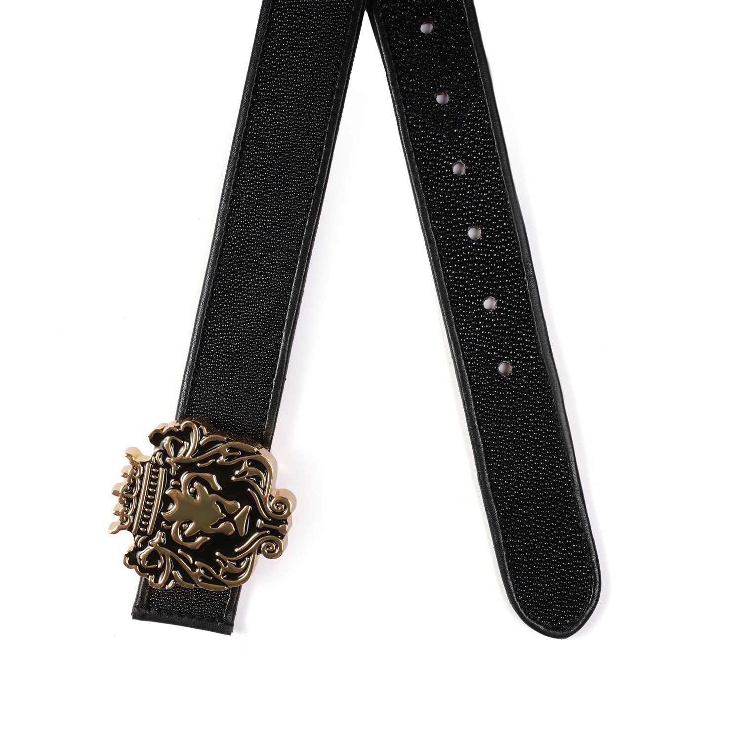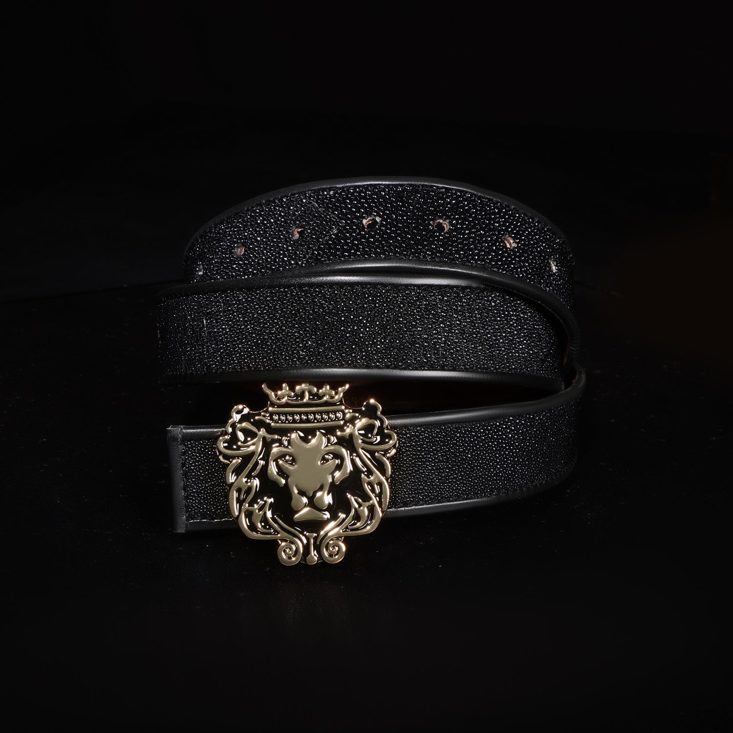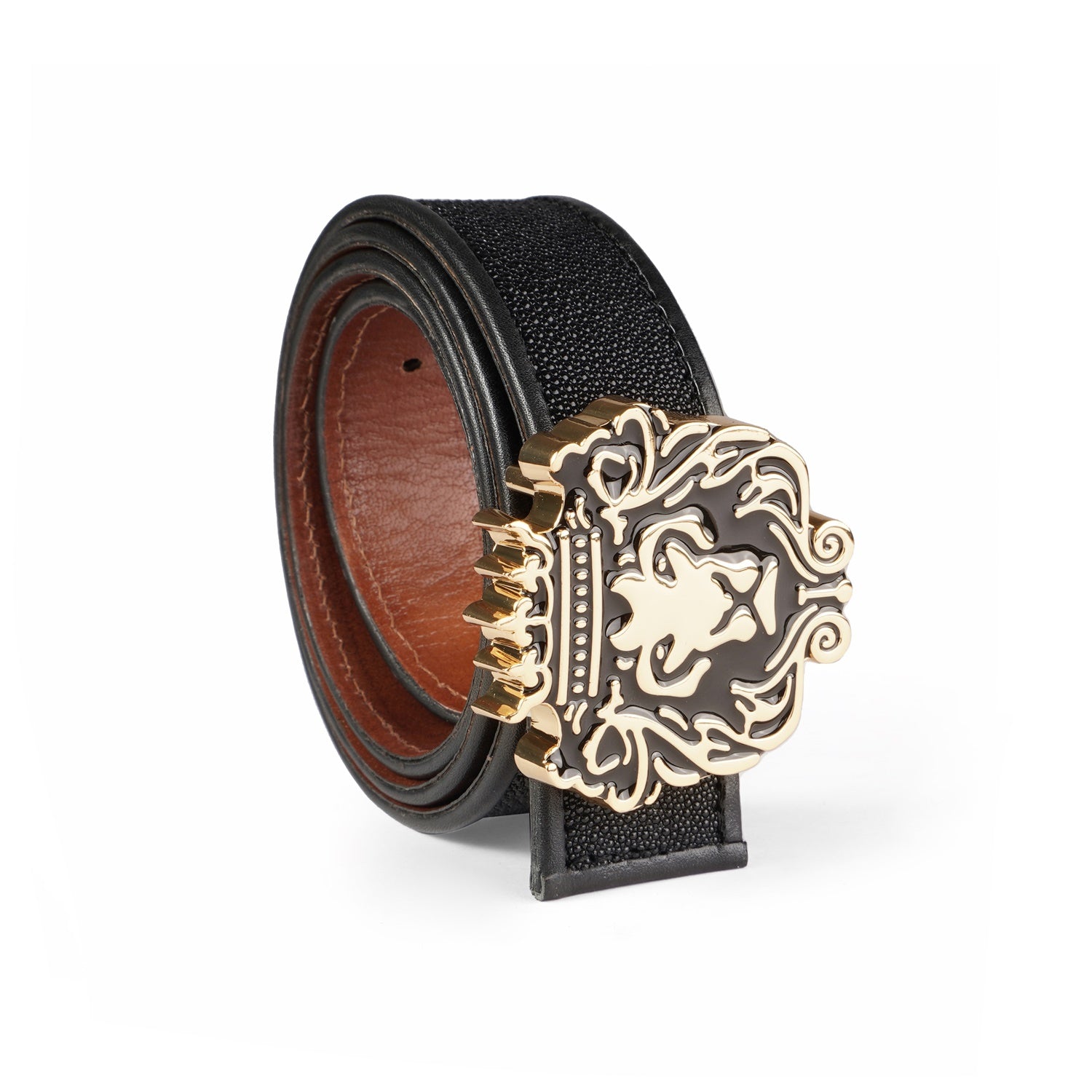 Black Exotic Stingray Leather Belt with Golden Lion Logo Buckle