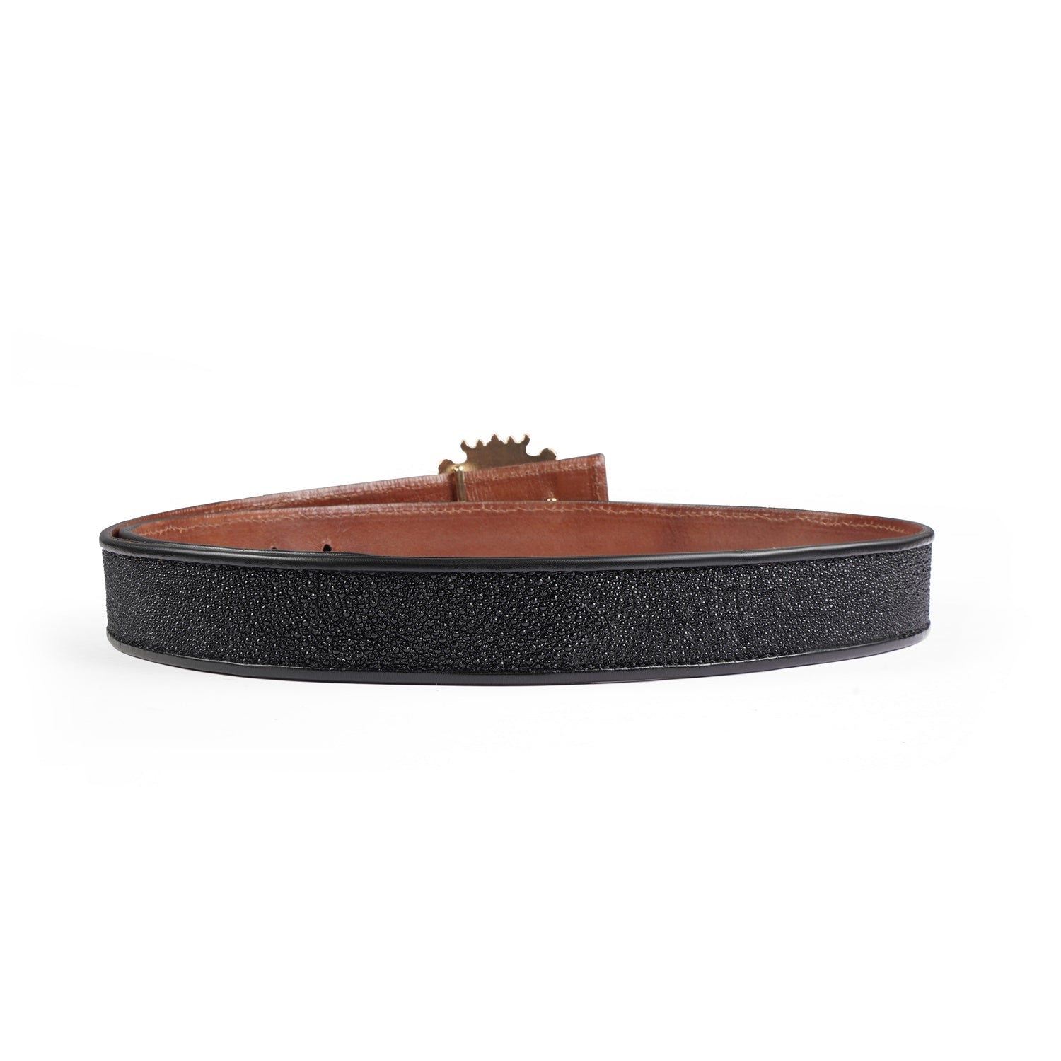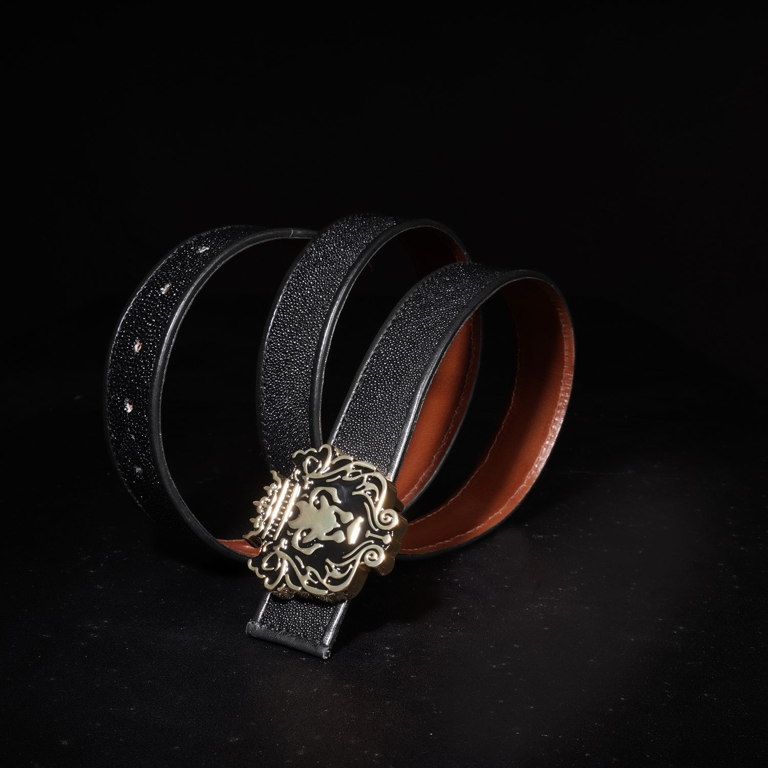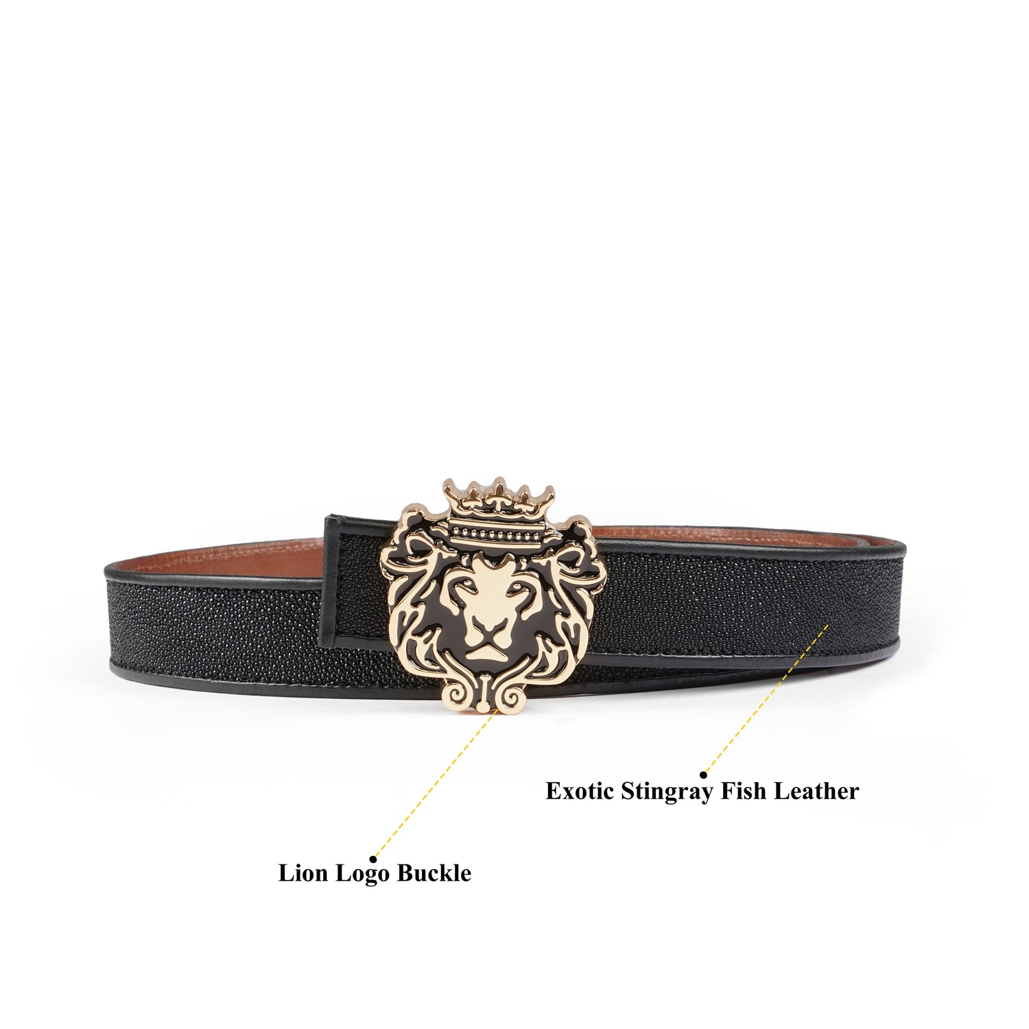Black Exotic Stingray Leather Belt with Golden Lion Logo Buckle