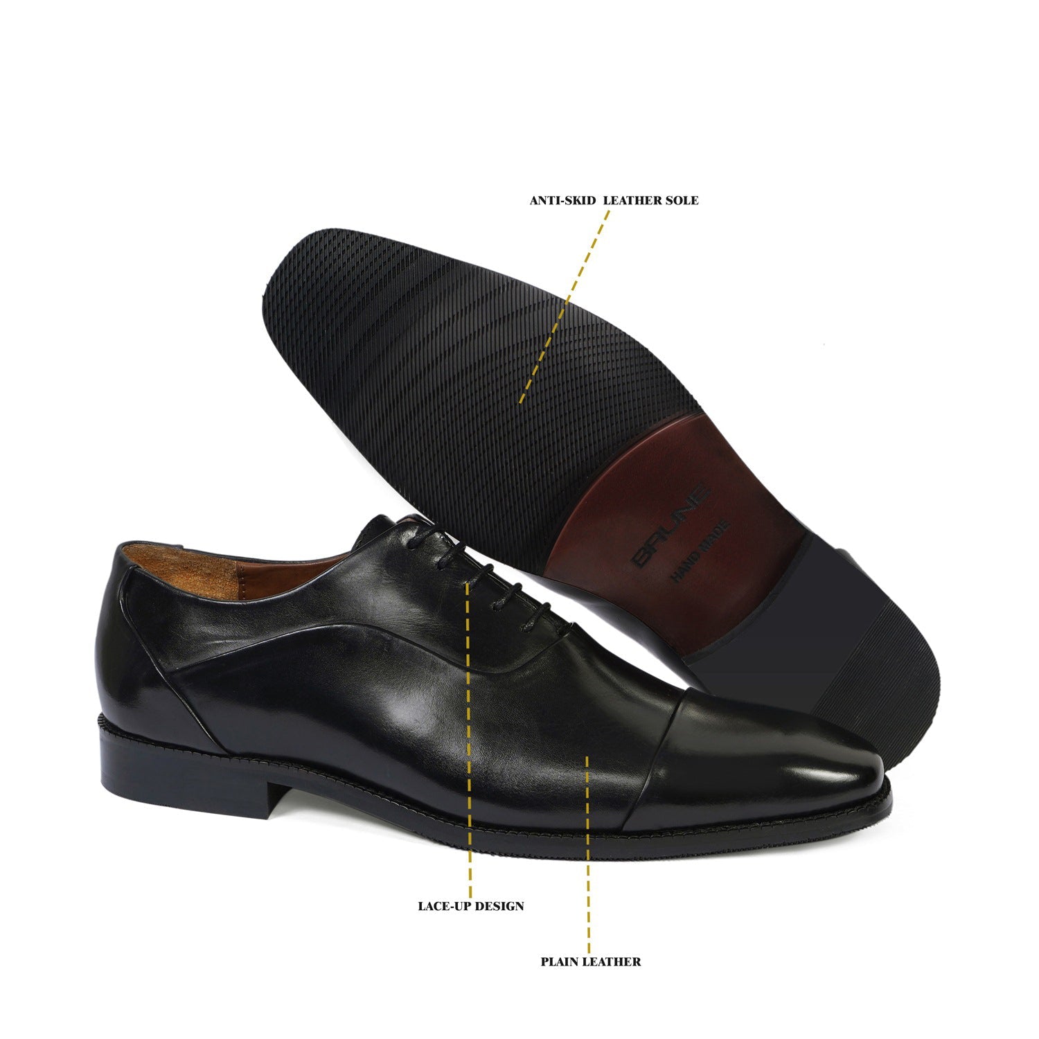 This plain black shoe is a classic and goes from Formals to Semi Formals. The comfortable opening provides an additional elegance to it. The right choice of color will make your day. These shoes are fitted that emphasize the size and shape of your feet to perfection. The pointed-tip adds an element of perfect style while the rounded and narrow heel ensures a snug fit as well as foot balance. This high-veg tanned leather shoe will surely serve you for a longer time period. You can get it customized in your favorite color shade & Initials with our Brune & Bareskin services.