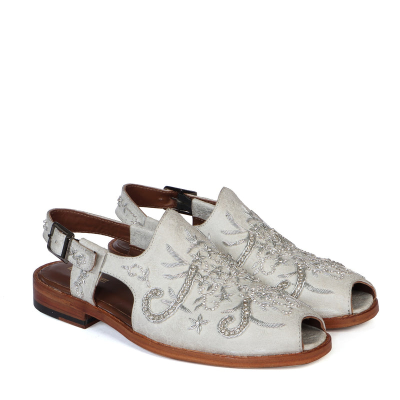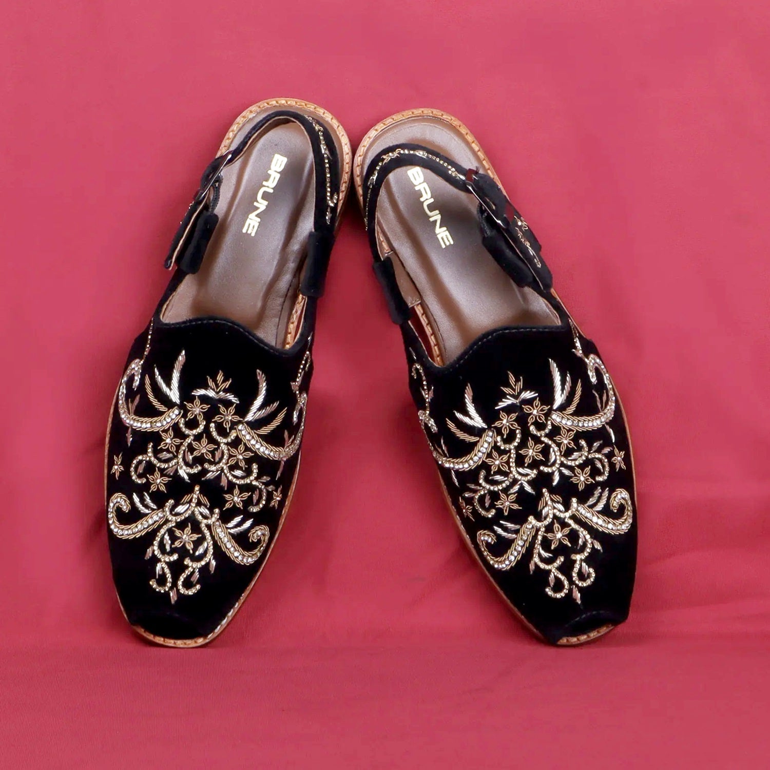 When you choose to wear branded, customized Pair by BRUNE& BARESKIN, you are sure to get more than a few glances coming your way. The right choice of color will make your day. These Black pair full zardosi sandals are hand made with the selected finest materials. This sandal is well suited with the ethnics and sherwanis. The adjustable strap provides a snug fit. The leather sole enhances the look of this well crafted Zardosi Peshawari Sandal further. This astonishing pair is very comfortable to wear. Match it with your favorite Suits and be prepared to be the show-stopper at any party. This is the perfect gem for the Zardosi lovers from the style bucket of BRUNE & BARESKIN.