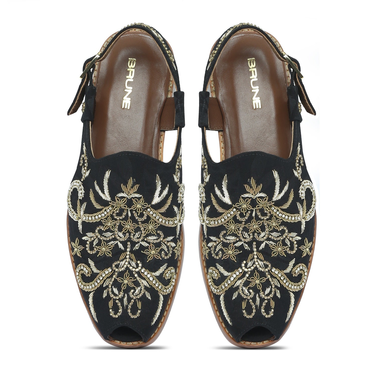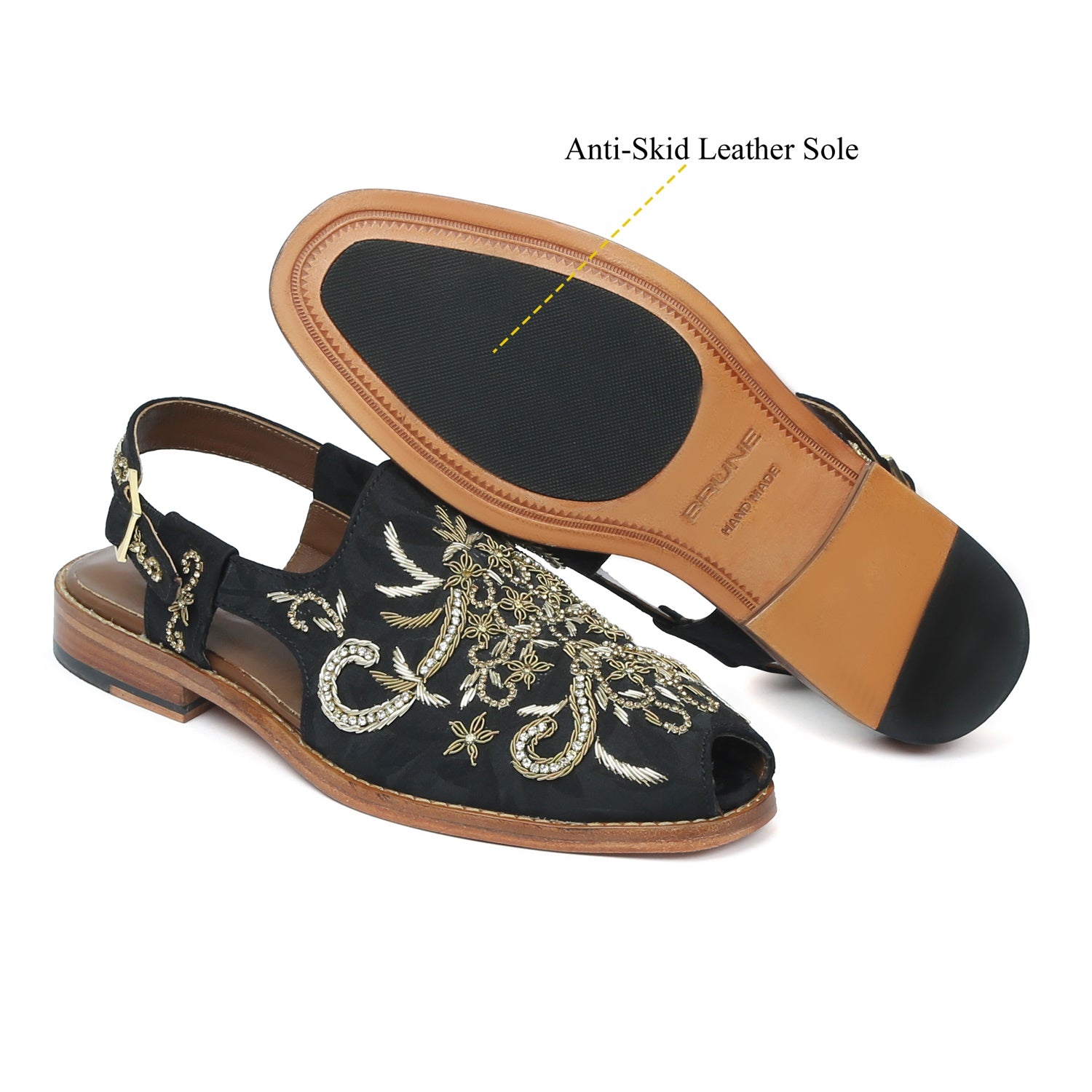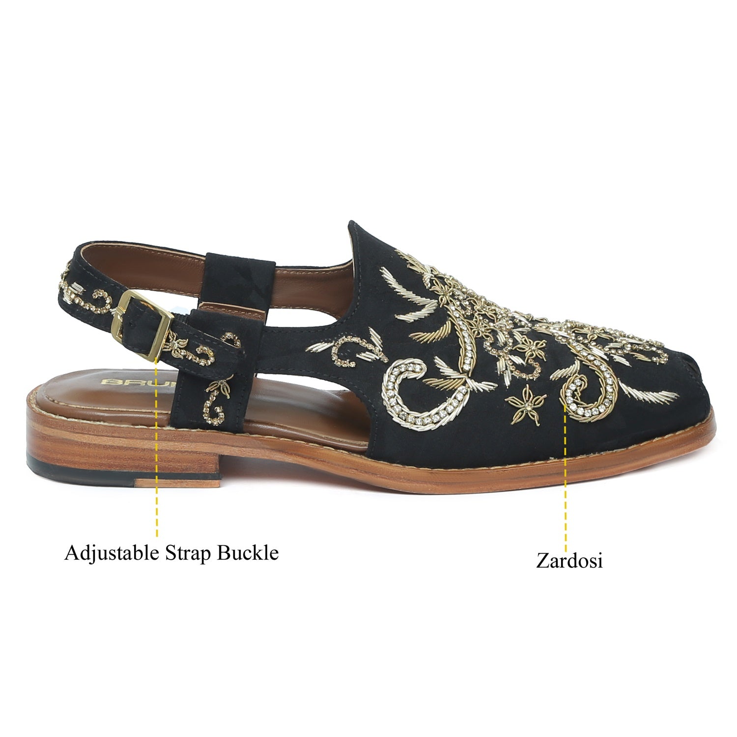 Black Peep-toe Zardosi Peshawari Sandal with Leather Sole