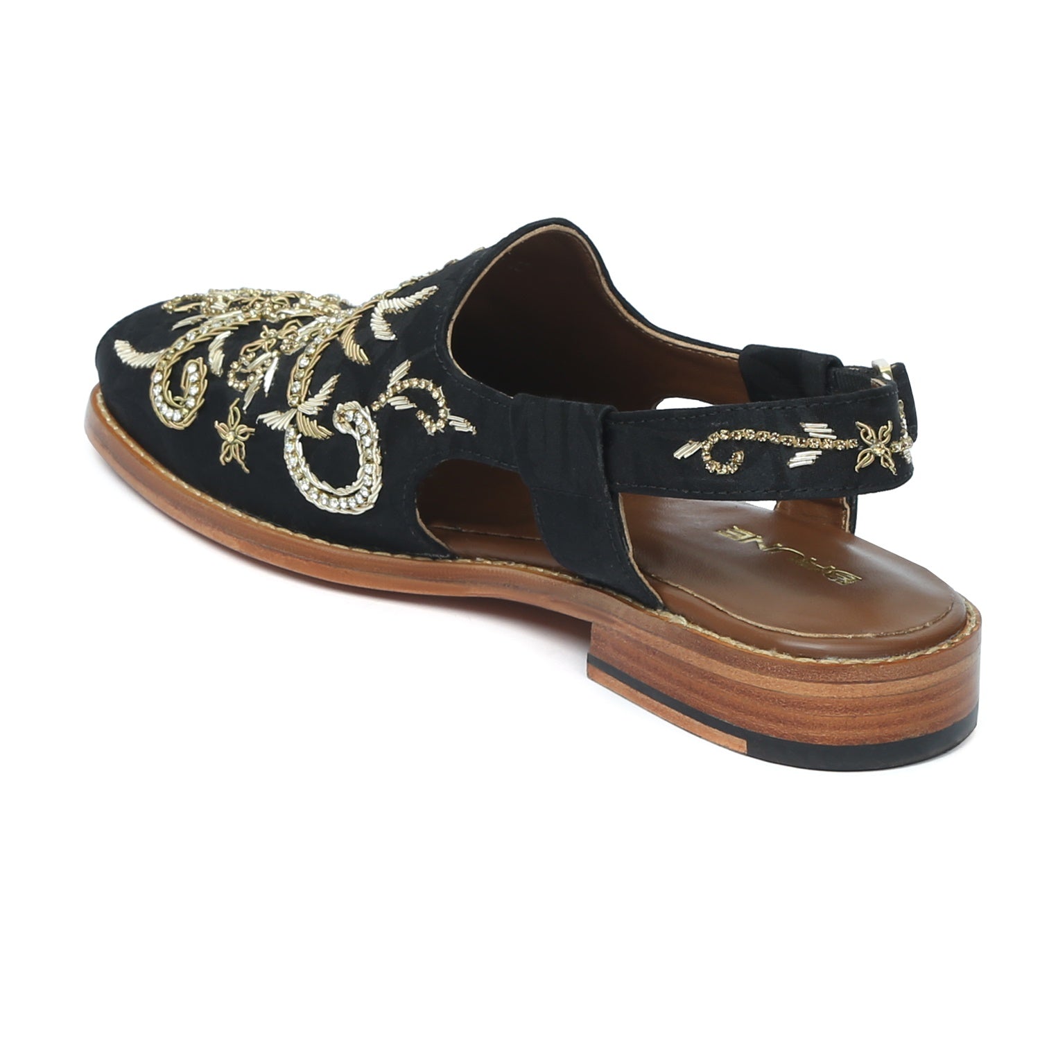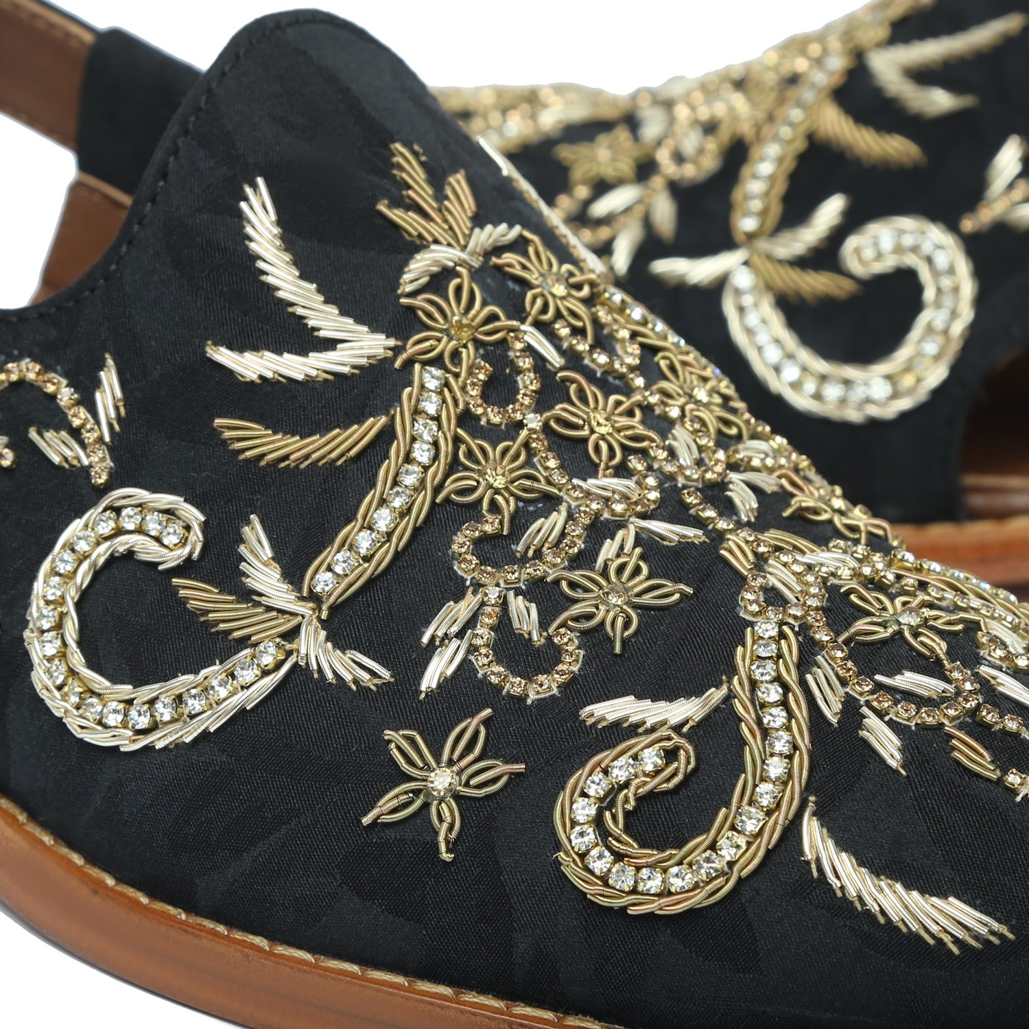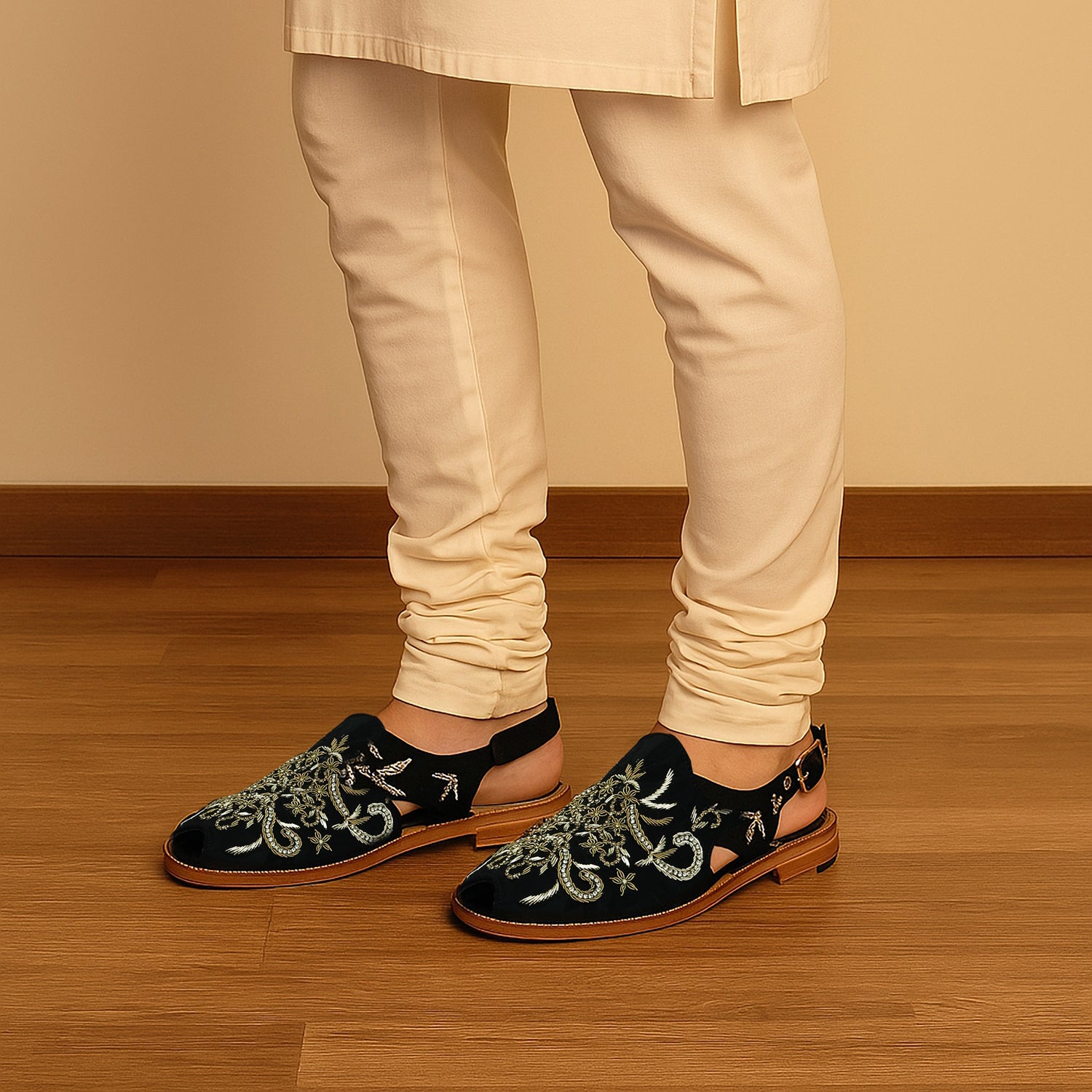 Black Peep-toe Zardosi Peshawari Sandal with Leather Sole