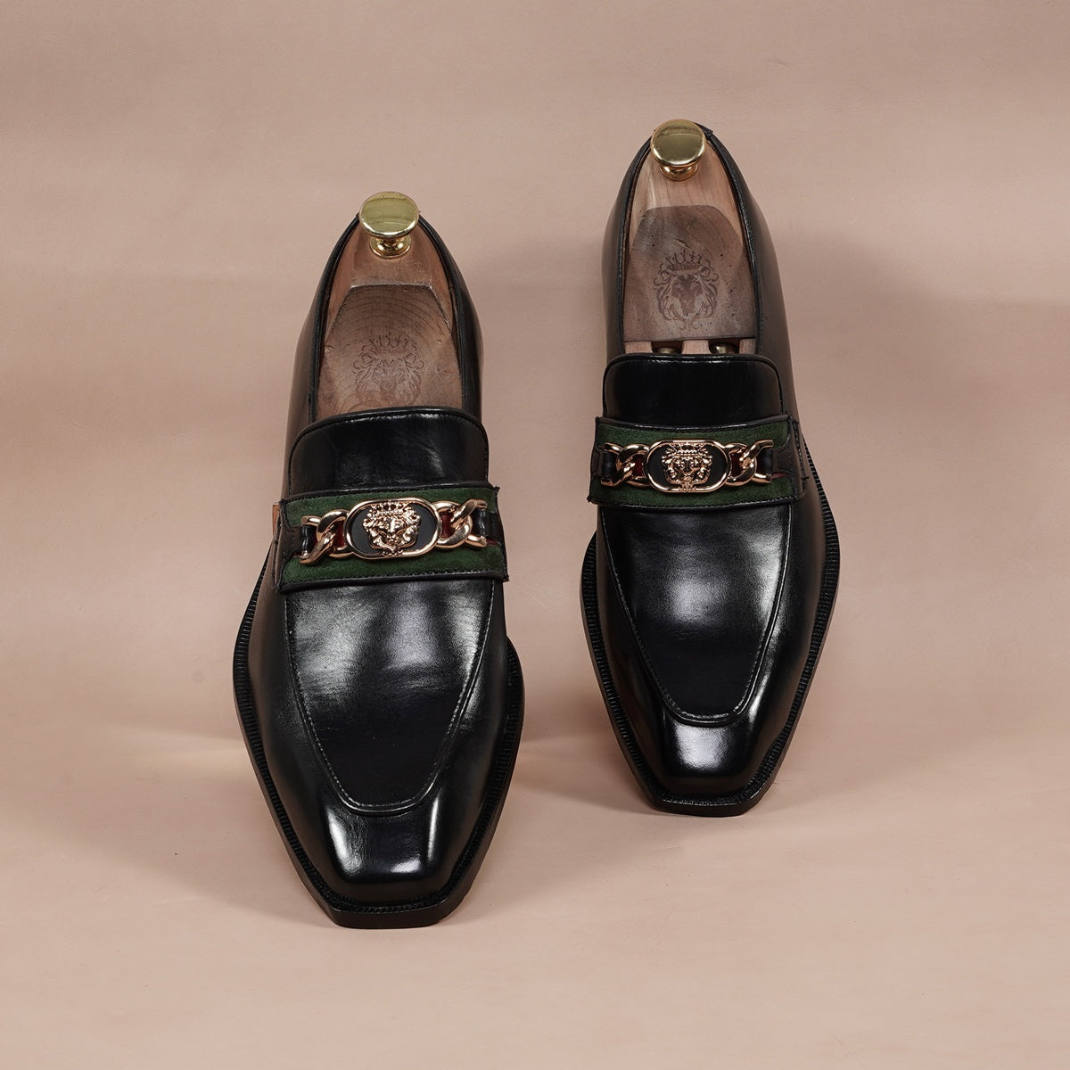 Black Cuban Heel Leather Slip-On with Trademark Chain Logo