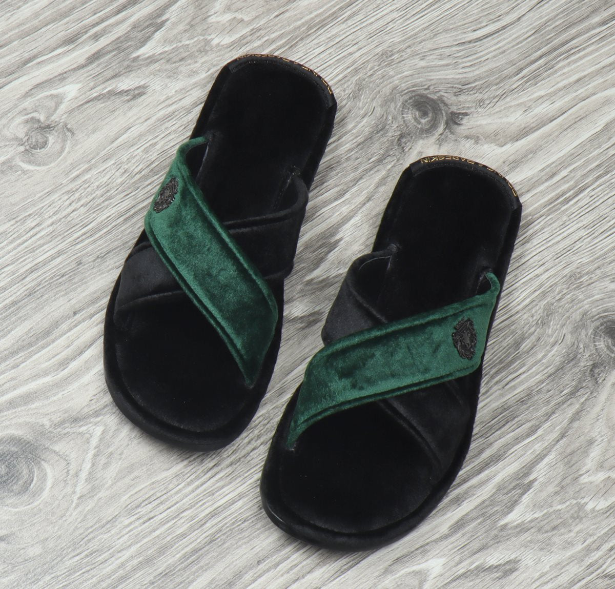 Green and Black velvet cross strap sliders are must-have footwear this season. These super soft velvet base slippers are a must-have of the season. The gel injected memory foam base is designed to provide you comfort while walking. We use special layering techniques to keep the base cozy and retain its shape. The wider cross-design straps with BRUNE & BARESKIN Lion Logo enhance the elegance further. Carry these with Jeans, Shorts, Capris, and other casual wear to be a style leader. Anti-Skid Rubber outer sole ensures the perfect walking grip.