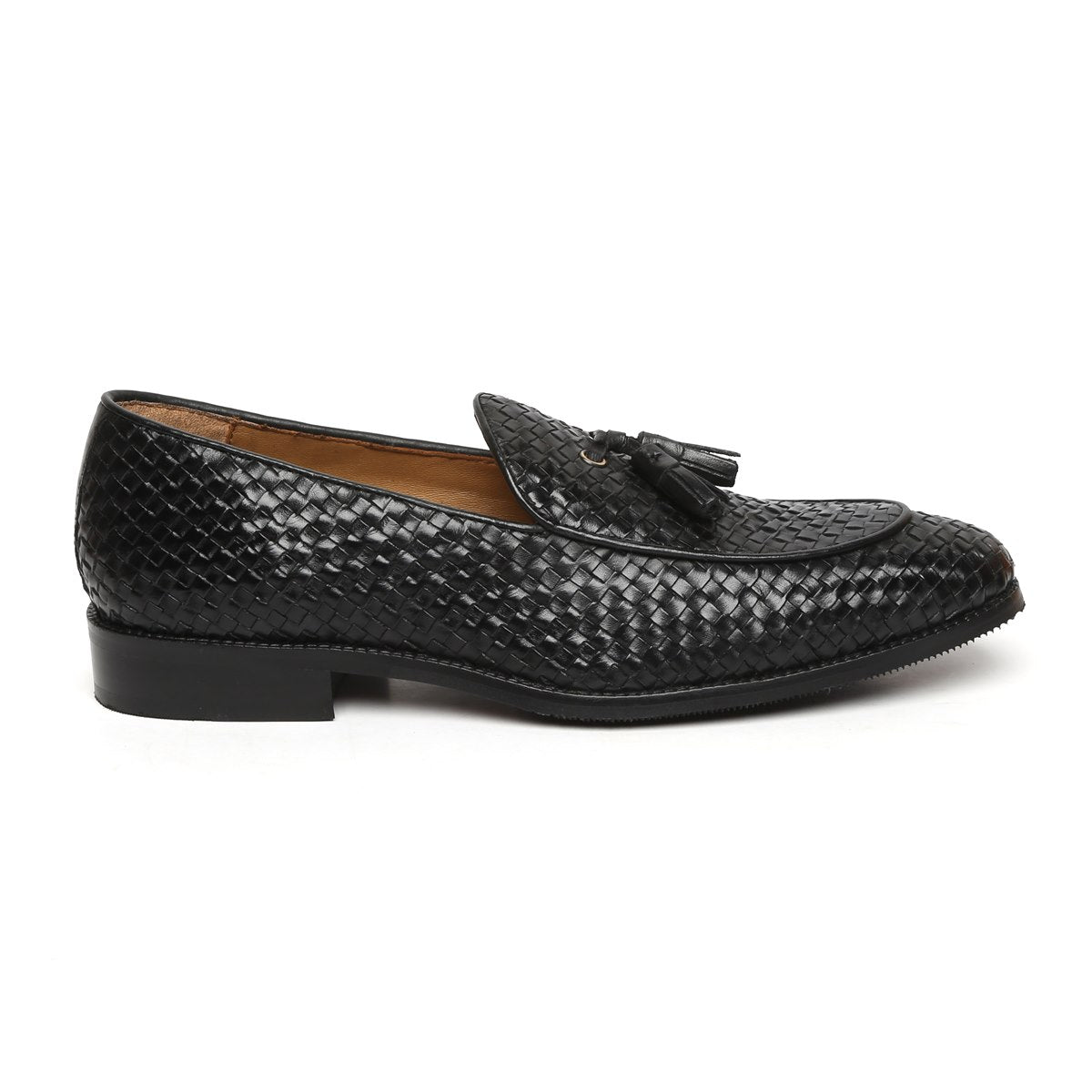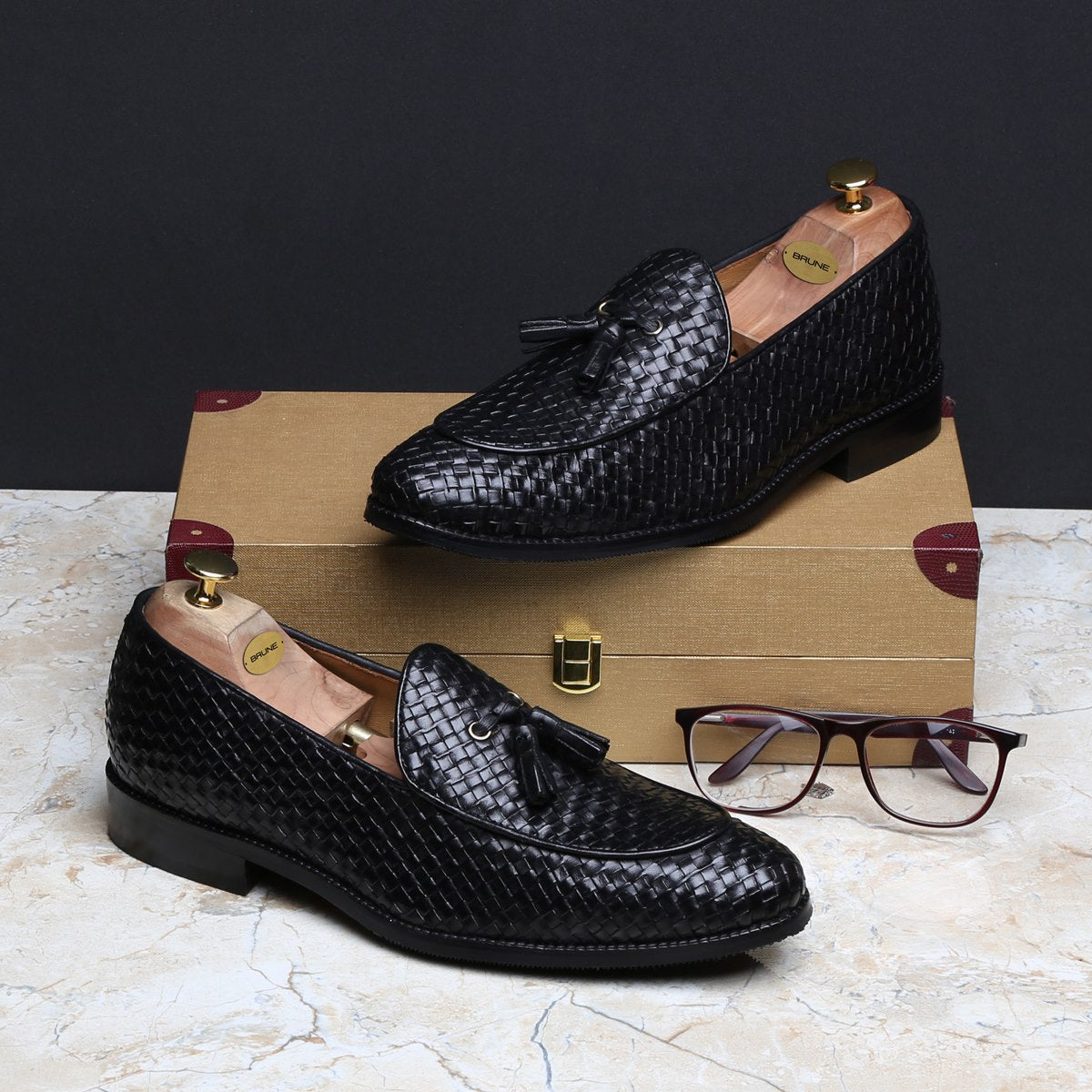 This sassy black hand weaved leather slip-on is a must have for fashion forward folks. The 100% Genuine Leather made ensures the top notch style and quality. Stylish Tassels on Weaved Slip-On Shoes looks very elegant. For, it is often said that, finding the perfect pair of shoes to wear for formal occasions is tough. Finding shoes that spell your style, besides being comfortable to wear, is definitely a challenge. However, if the shoes are made by BRUNE you can be sure to find comfort and snug fit.