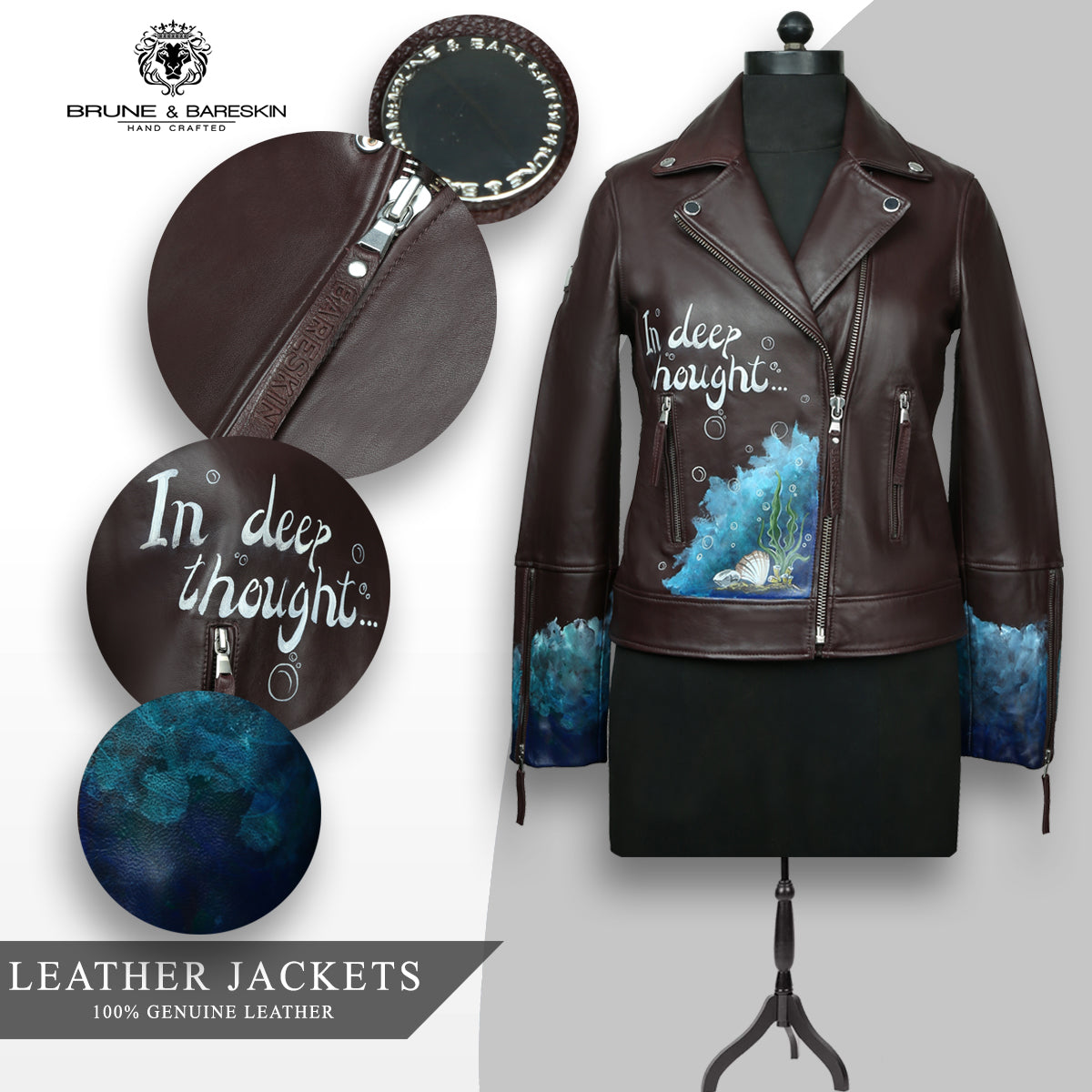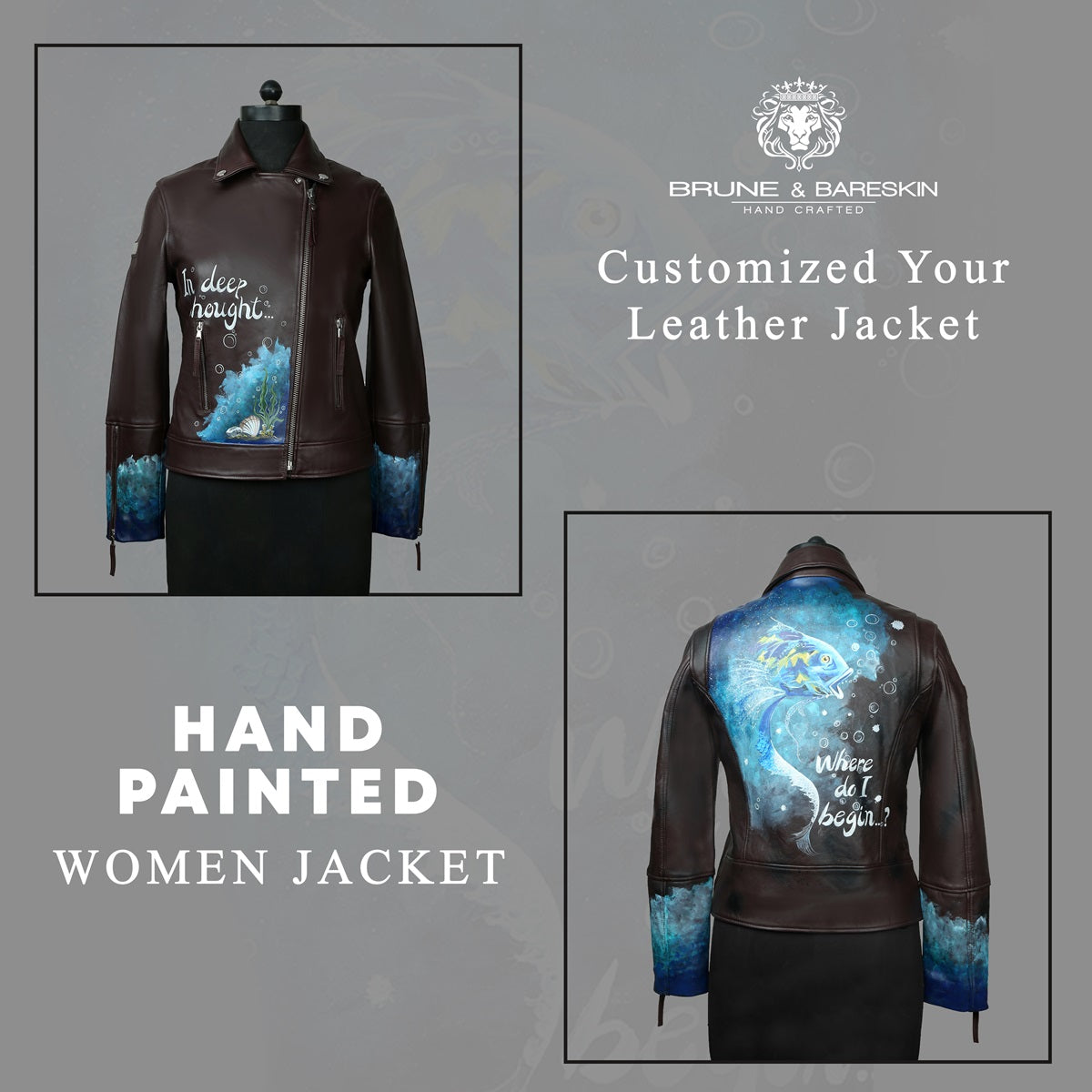 Genuine leather biker jacket, cross zip, smooth soft lamb leather, decorated with handwritten verses, black color. If you're in need of an awesome, unique new piece to add to your wardrobe then you have come to the right place "Brune & Bareskin". The design consists of hand-painted text and all paints used are suited for leather and will not crack or fade. These paintings depict fish in their natural habitat as symbolic creatures. The artwork also depicts fish in their role as folklore legends. This is a biker-style jacket with button details on the collar and a zipper up the front. The jacket includes zipper pockets on either side of the front of the jacket. The company " Brune & Bareskin" complements the fashion statement in a unique way to help customers cherry-pick from the collection & feel better & look better.