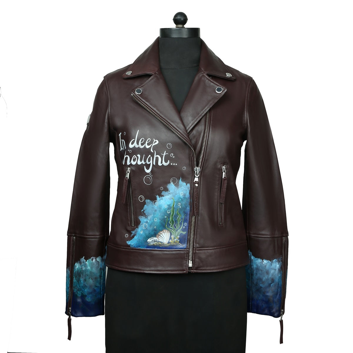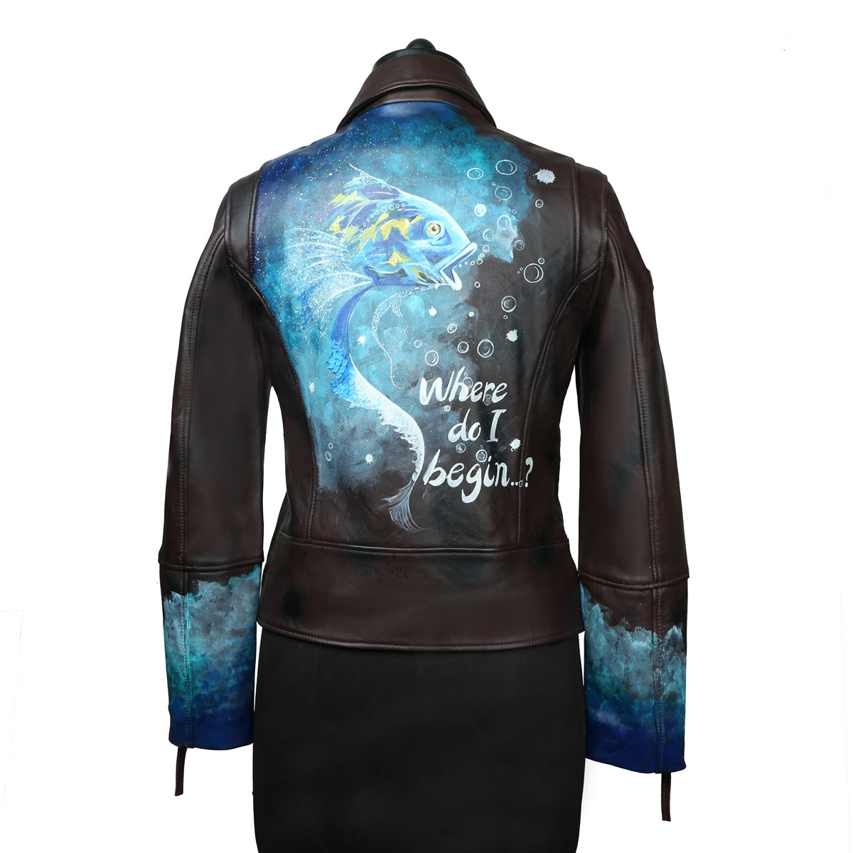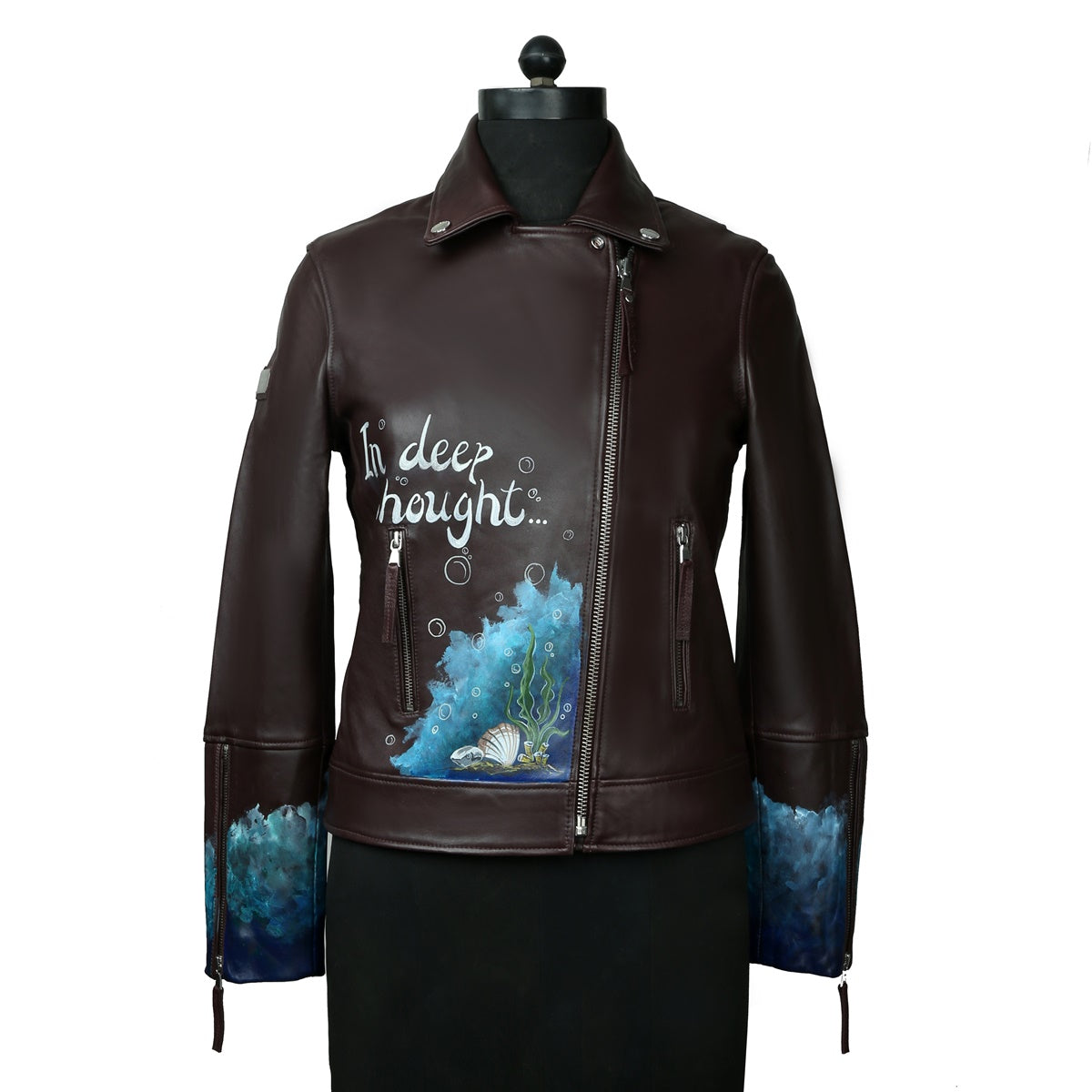 Black Handwritten Aquatic Inspired underwater Hand Painting Ladies Leather biker style Jacket By Brune & Bareskin