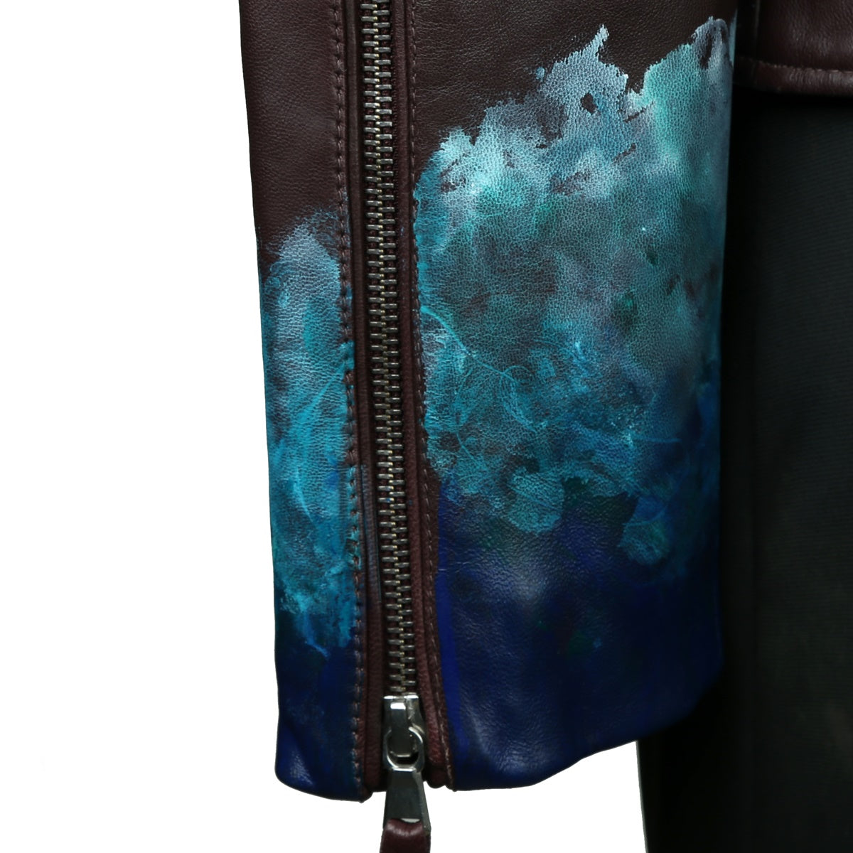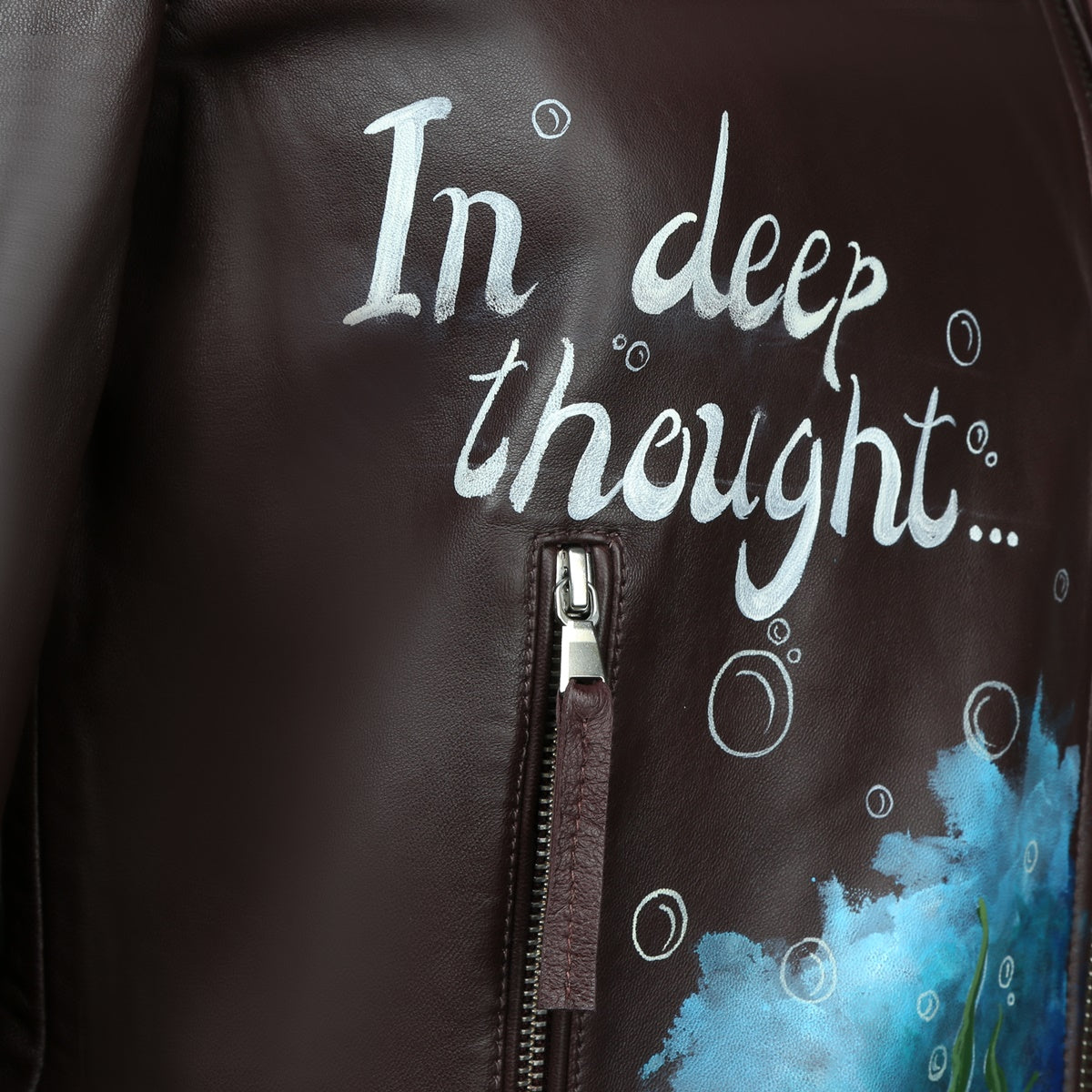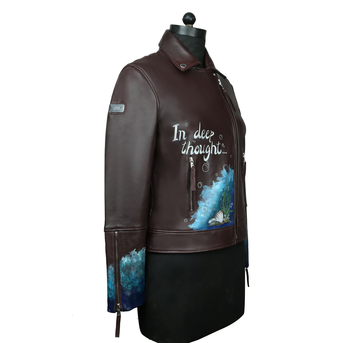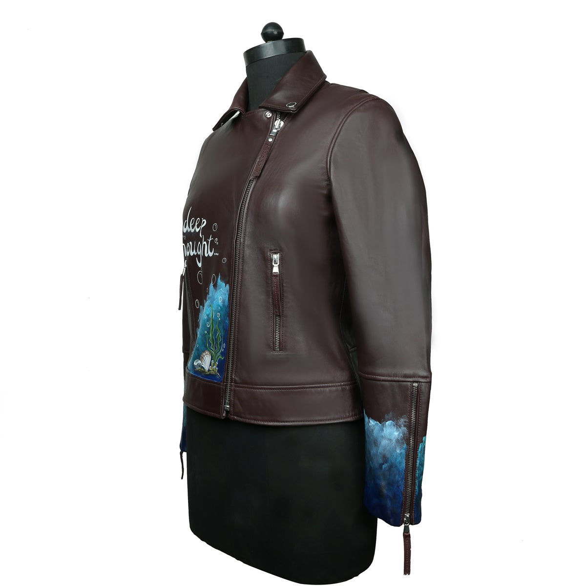Black Handwritten Aquatic Inspired underwater Hand Painting Ladies Leather biker style Jacket By Brune & Bareskin