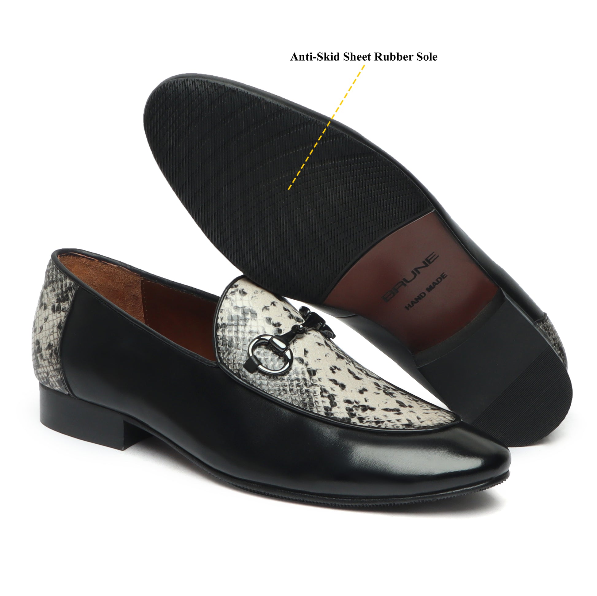 Make your everyday special with these classy men's loafers. It is the best shoe category for any men's closet. Loafers remain the favorite style of shoes, as they are convenient to use and spell minimum fuss. Black & White snake print leather on the vamp is enhancing its look with metal horse-bit on it. And when they are made of exemplary fitting and finish as that of the brand Brune & Bareskin, you can be sure that the shoes are nothing short of excellence. These black leather shoes, with a perfectly round toe and apron toe design, have a very rich appearance. This is a must-have pair in your footwear collection.