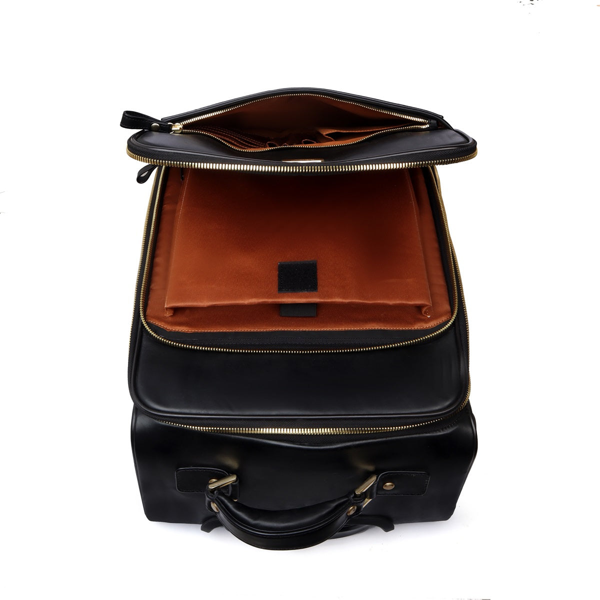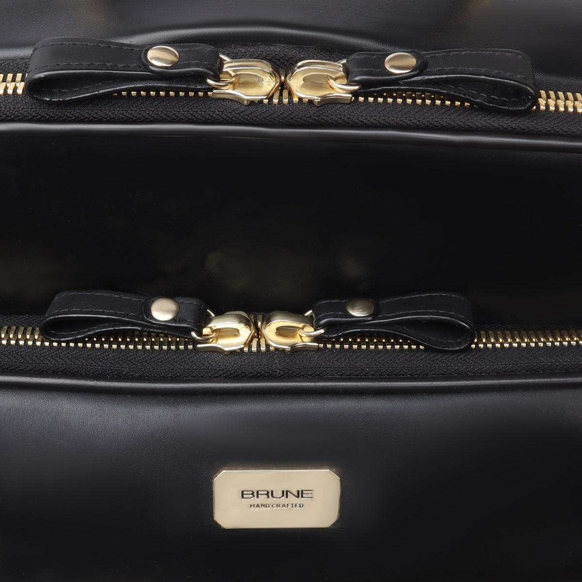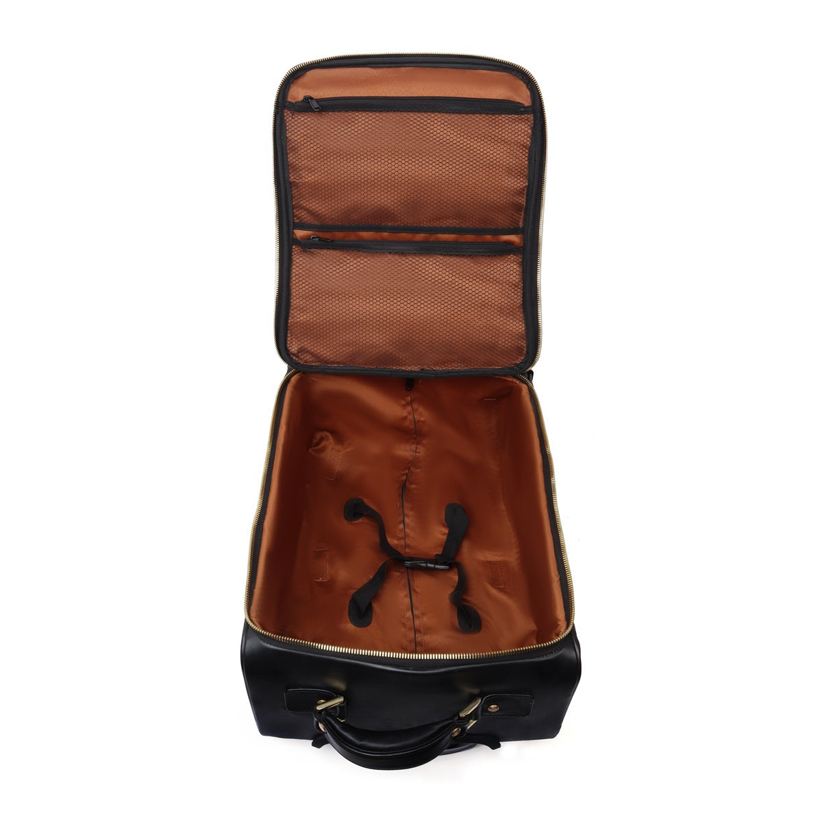 A good traveler has no fixed plans, but has good trolley bag. Black color is never old or outdated. Black Leather Trolley Bag by Brune & Bareskin is perfect travel companion for Getting off on a city break. Brune & Bareskin's roll-along Cabin Case is handmade from the finest quality leather and luxuriously lined with multiple compartments. It's diamond stitched design makes it look unique as compare to others. The spacious interior which opens with a smooth 3 zipper features pockets at the front and has spacious briefcase opening to carry cloths & other stuff. Moreover, multi pockets are there to keep all your travel essentials, whilst the exterior boasts a handy slip in pocket perfect for those last minute airport purchases. The foldaway telescopic handle is tucked away in a neat compartment and the integral quad wheels are discreetly placed at the bottom, which stands the case in all its glory. You can customize this further in your favorite color and also add the name initials.