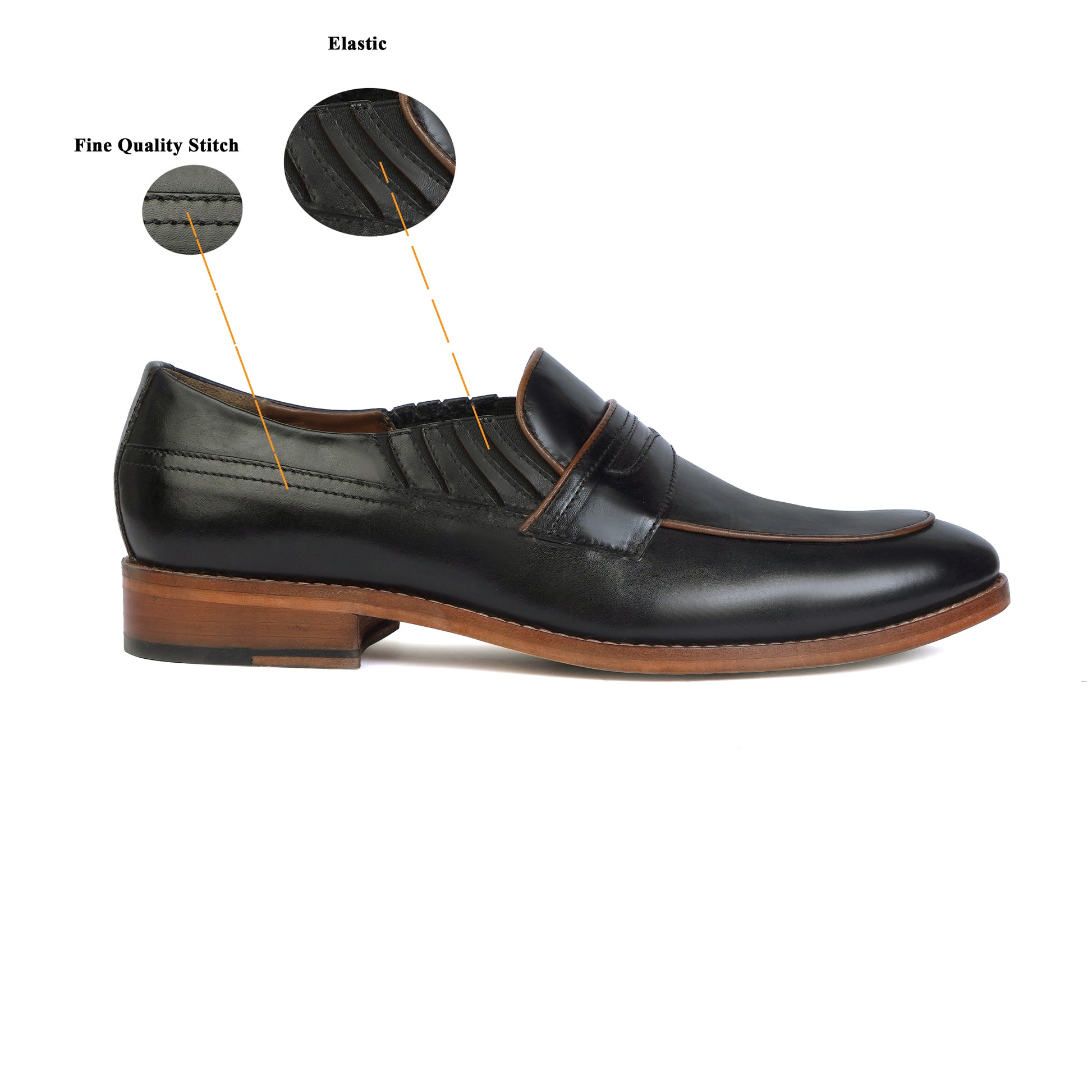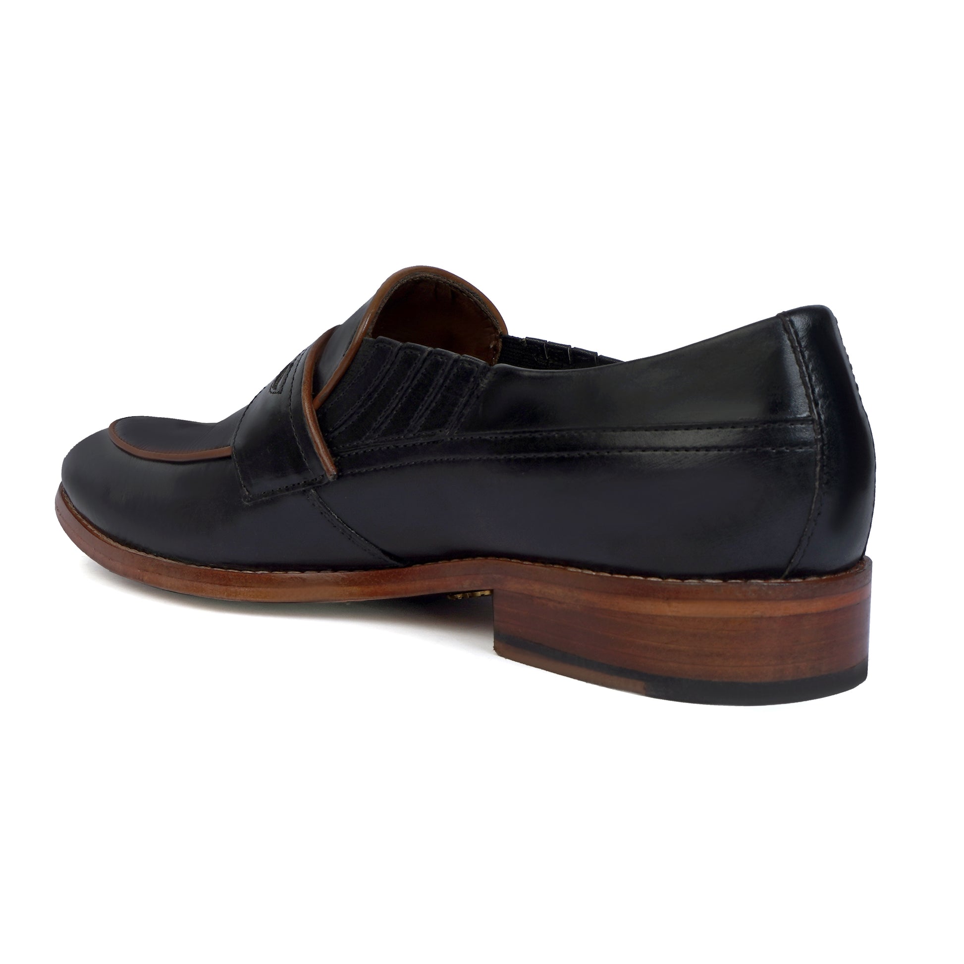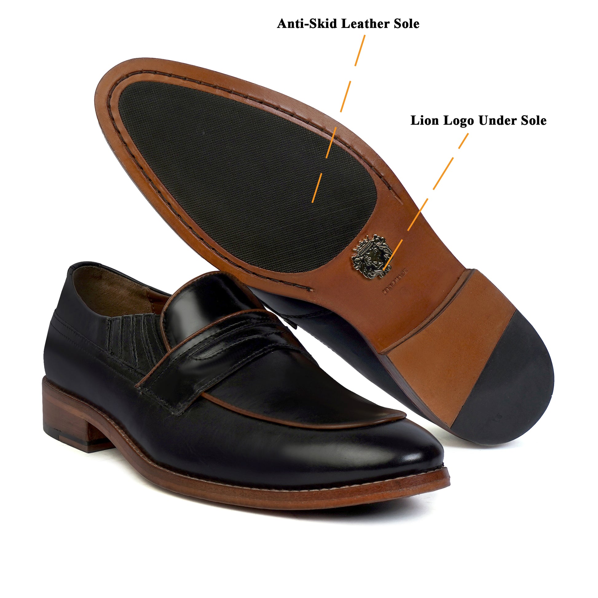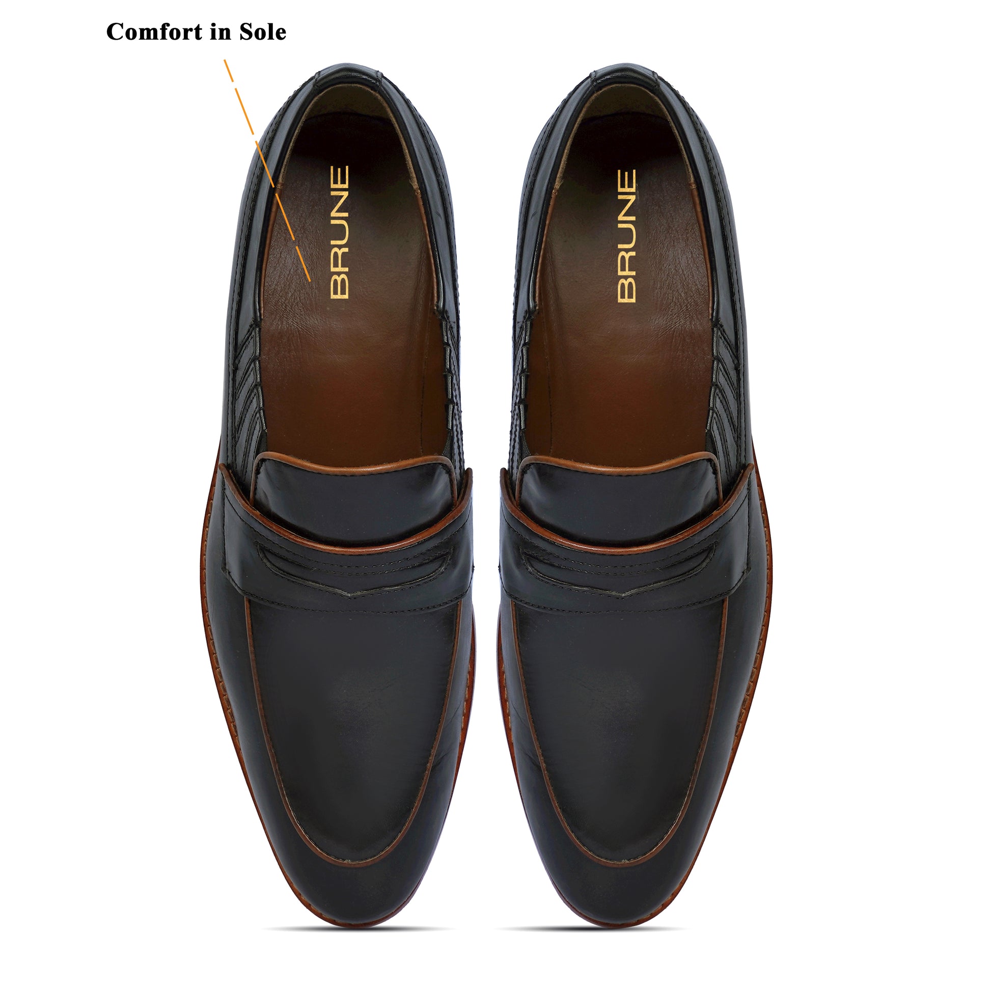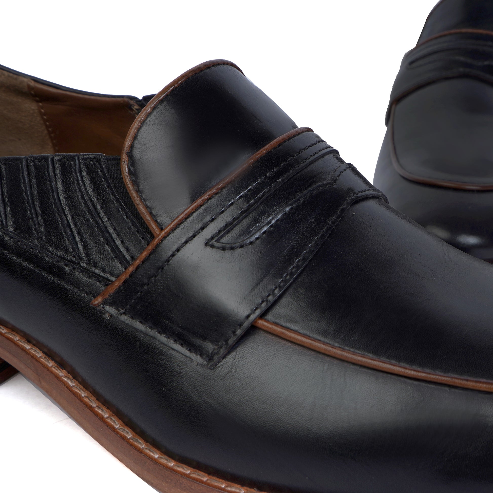 Effortlessly elevate your formal look with our premium quality Black Leather Loafers. Designed for the modern and busy man, these hand crafted penny loafers feature a hidden elastic pocket for ease of wear and an anti-skid leather sole for added comfort and practicality. It is a perfect accessory to wear with formal-to-casual attires at any party or office. Experience the luxury of genuine leather from the trusted brand, Brune & Bareskin.