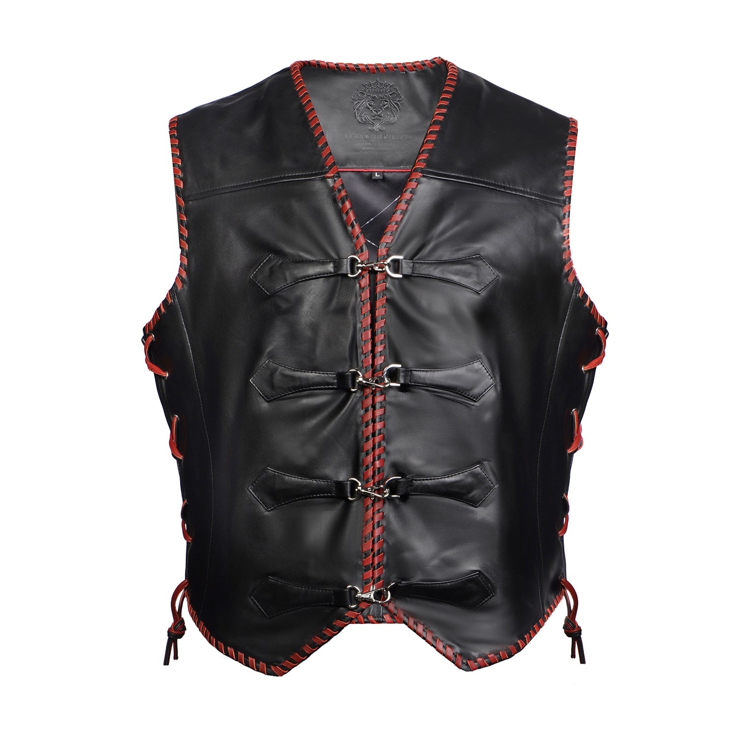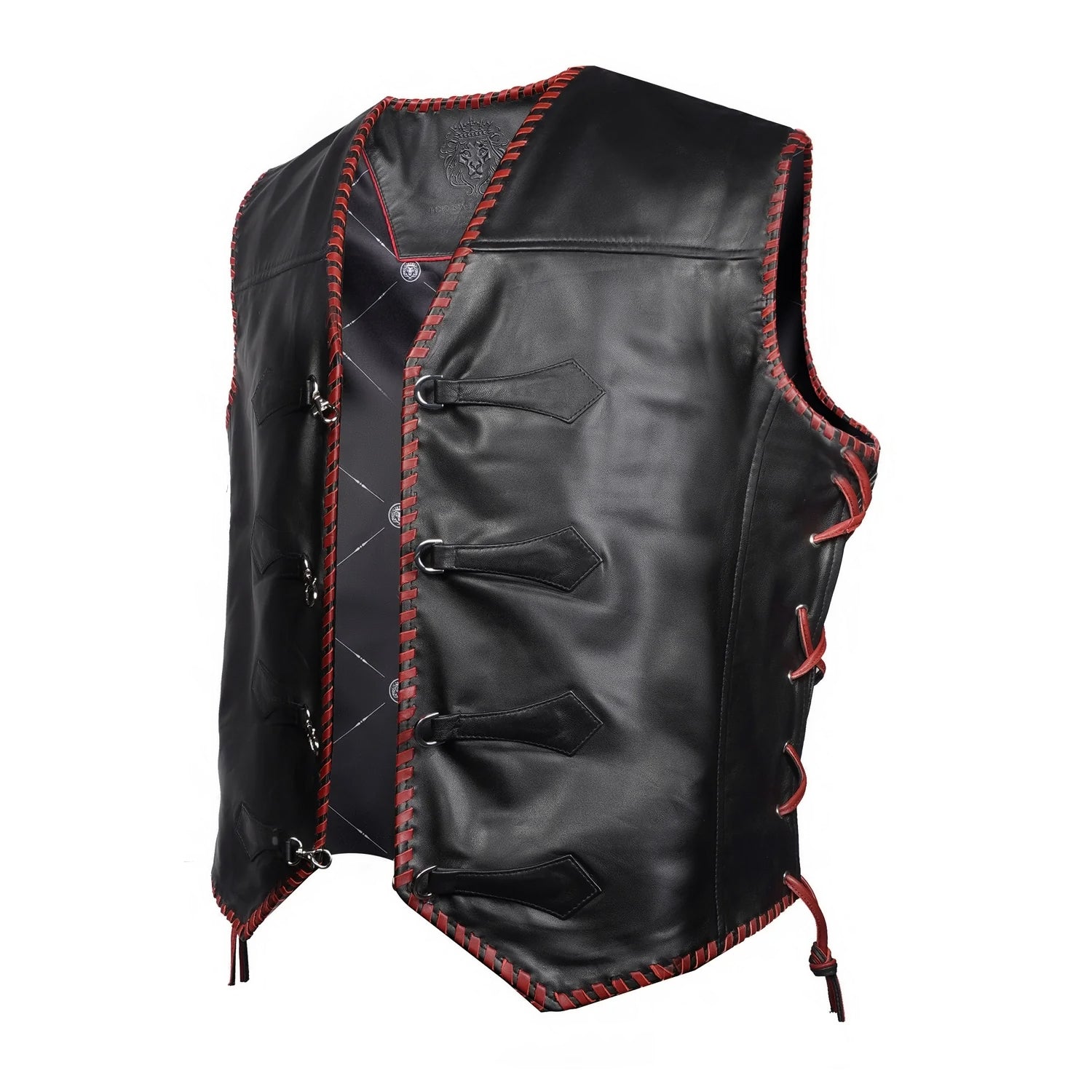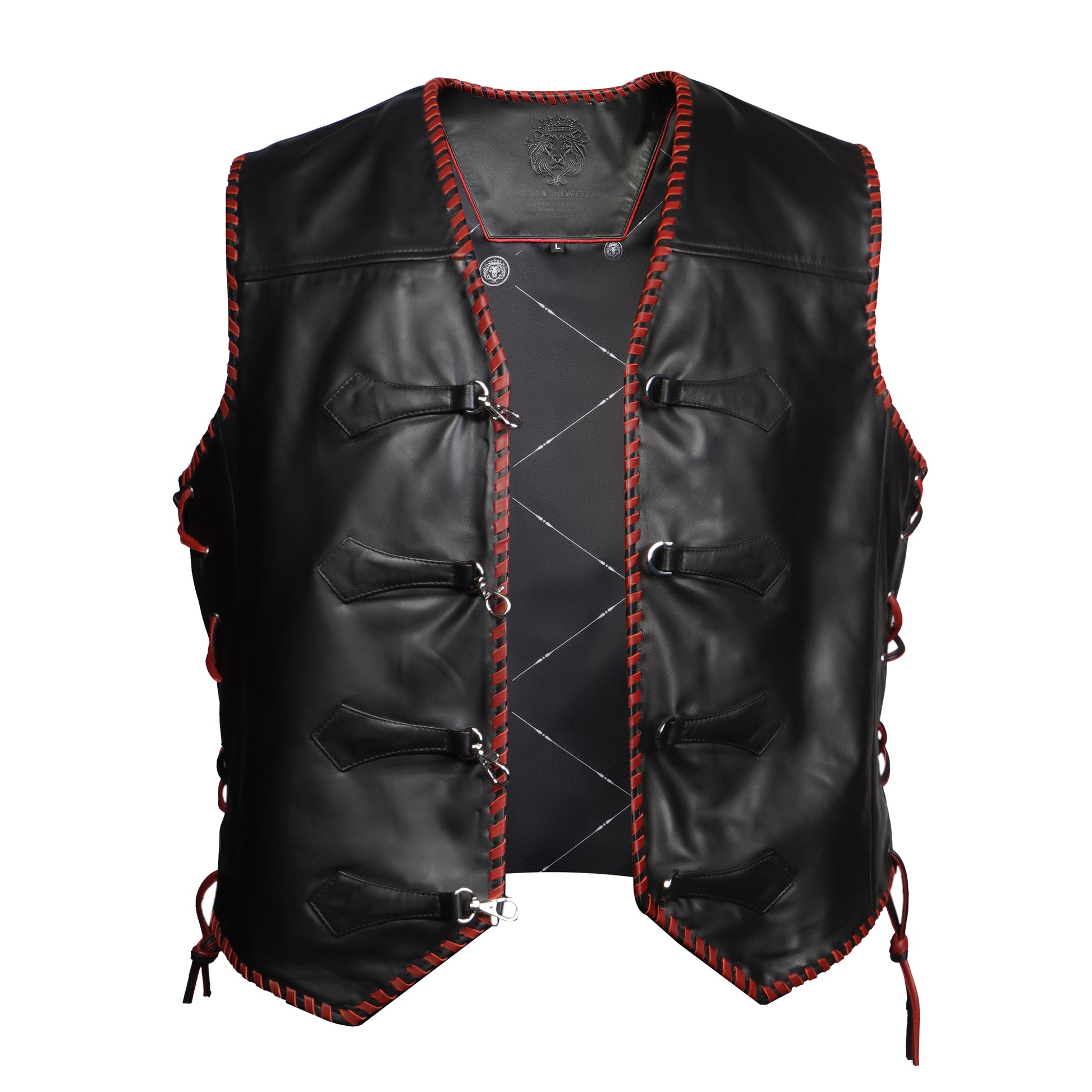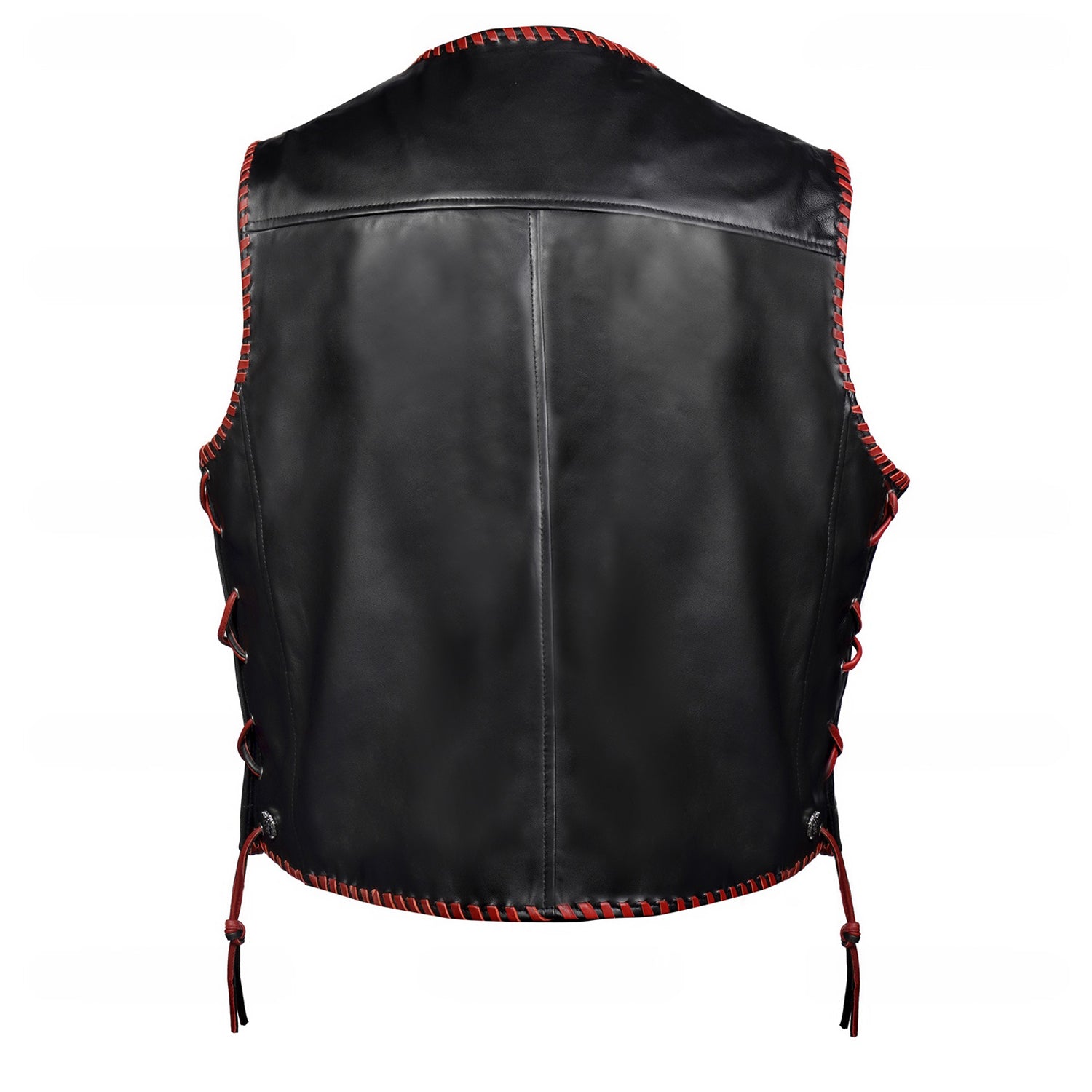 One of the key design elements of this vest is the contrast red whipstitch detailing running along the front opening, armholes, shoulders, and hemline. This handcrafted stitch detailing not only strengthens the edges but also adds a distinctive design element that makes the vest stand out. The red stitching against the black leather creates a bold contrast, giving the vest a statement look.