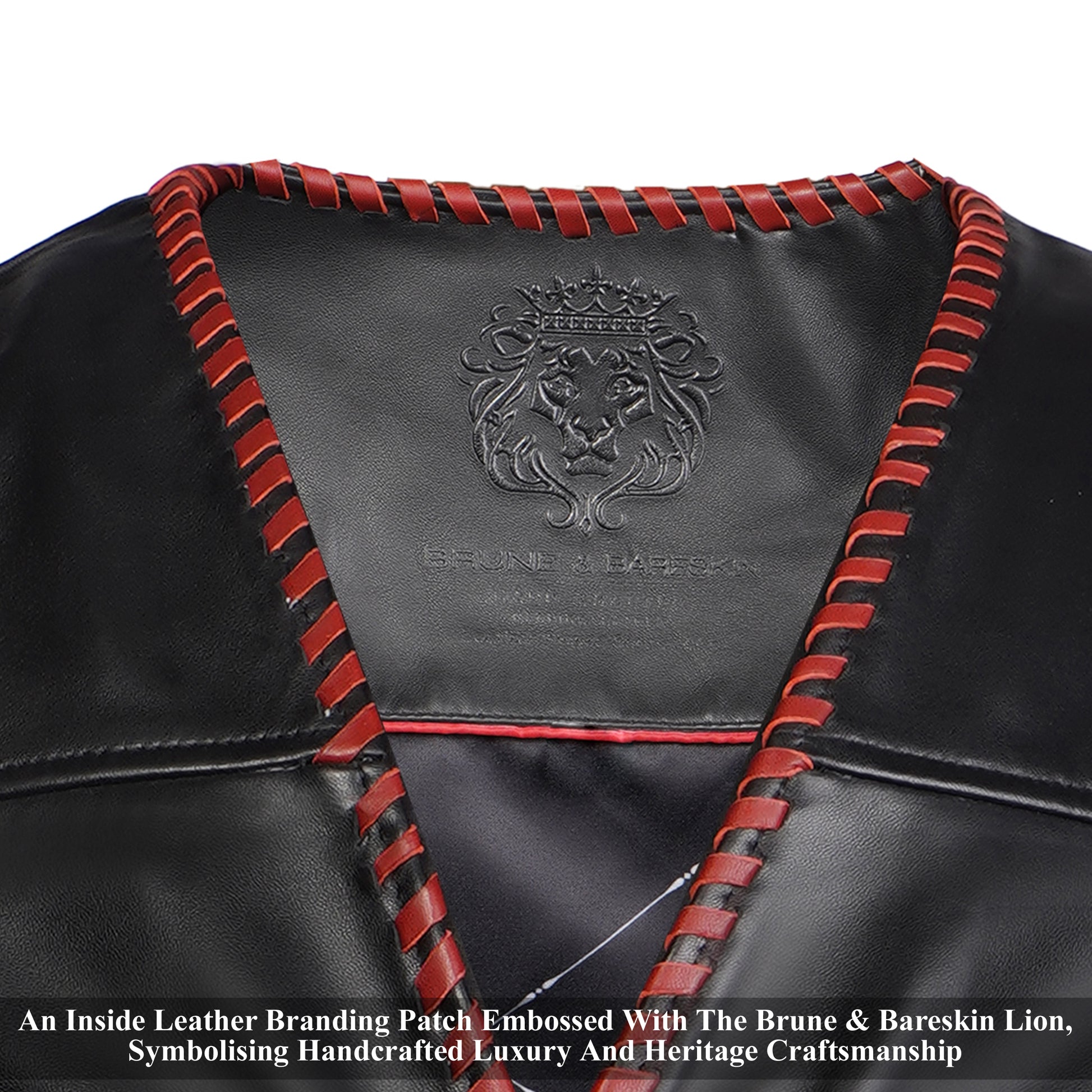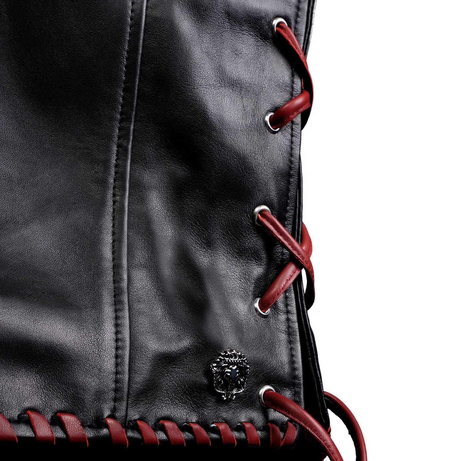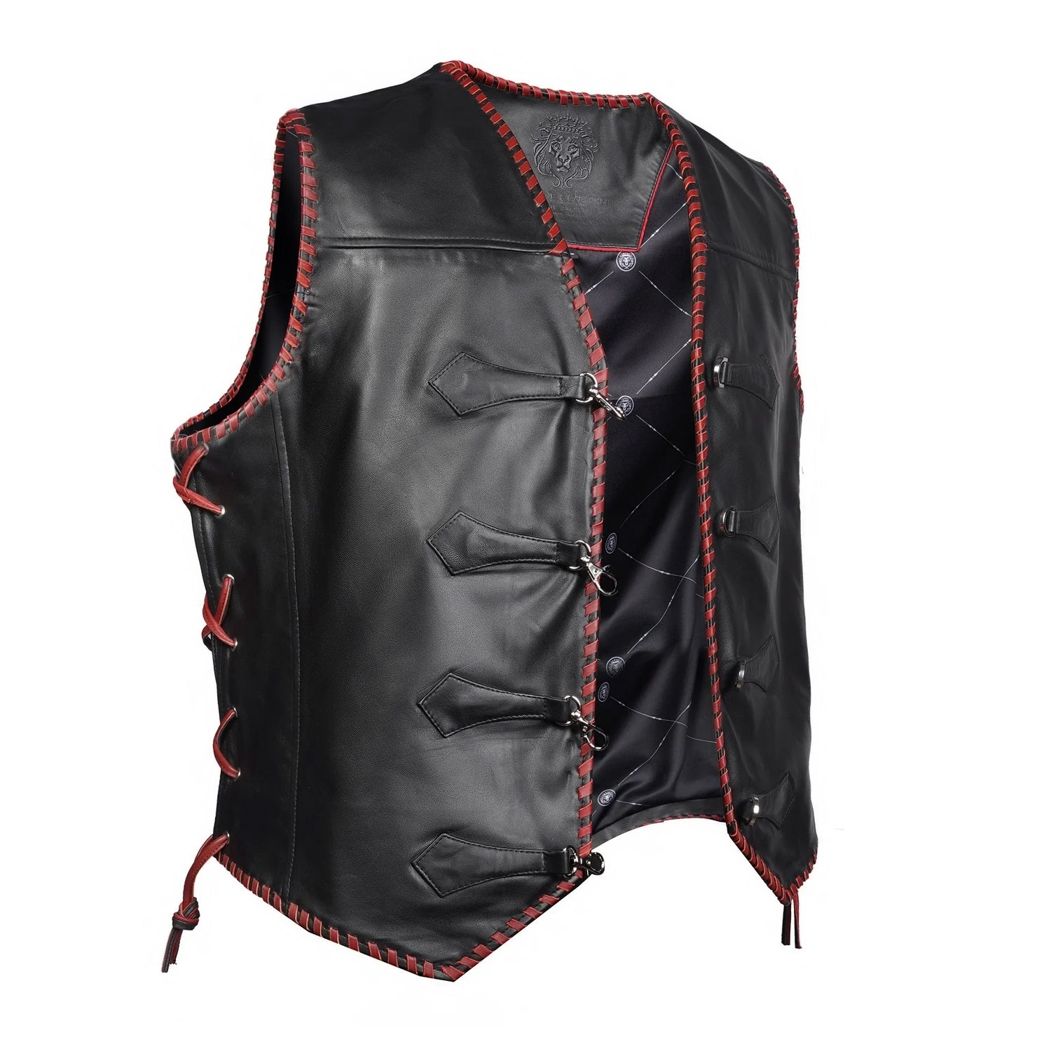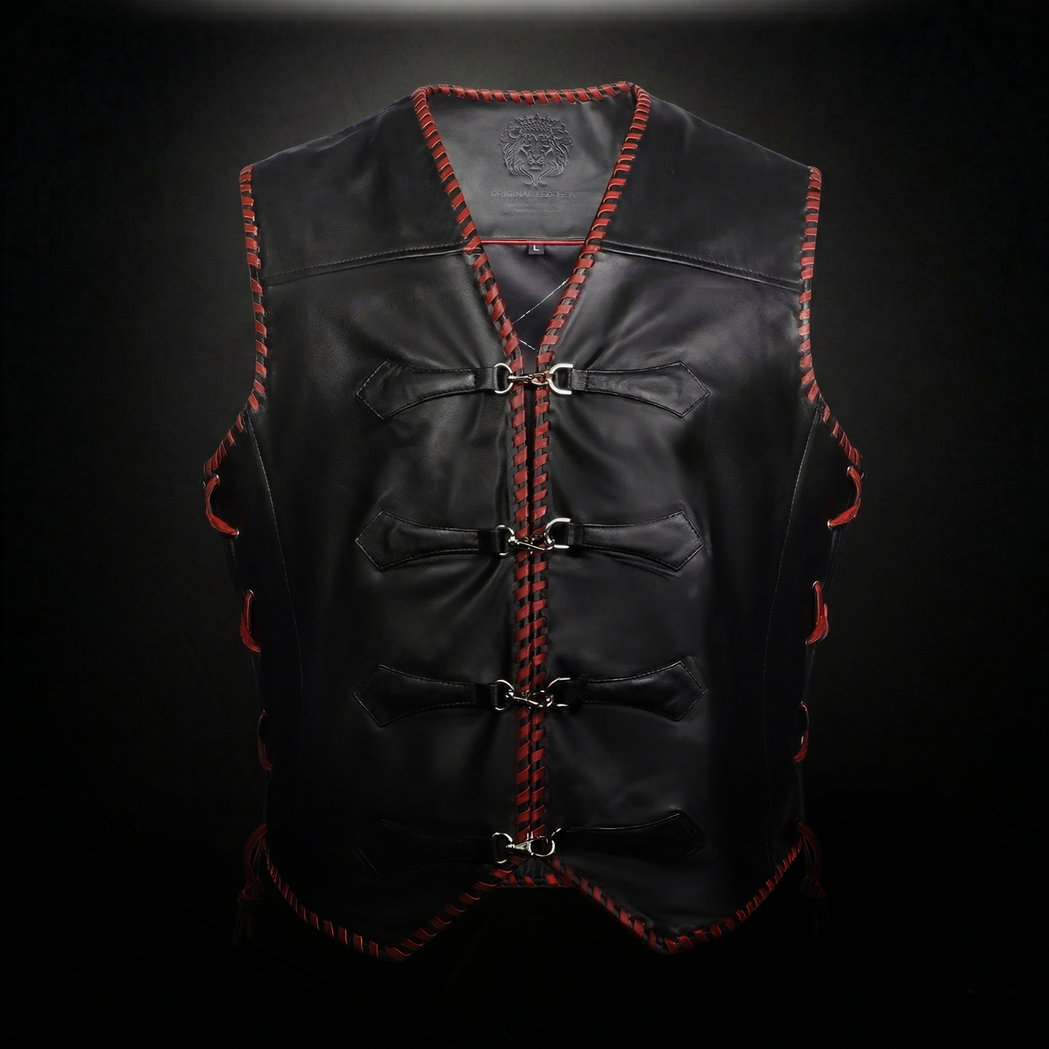 One of the key design elements of this vest is the contrast red whipstitch detailing running along the front opening, armholes, shoulders, and hemline. This handcrafted stitch detailing not only strengthens the edges but also adds a distinctive design element that makes the vest stand out. The red stitching against the black leather creates a bold contrast, giving the vest a statement look.