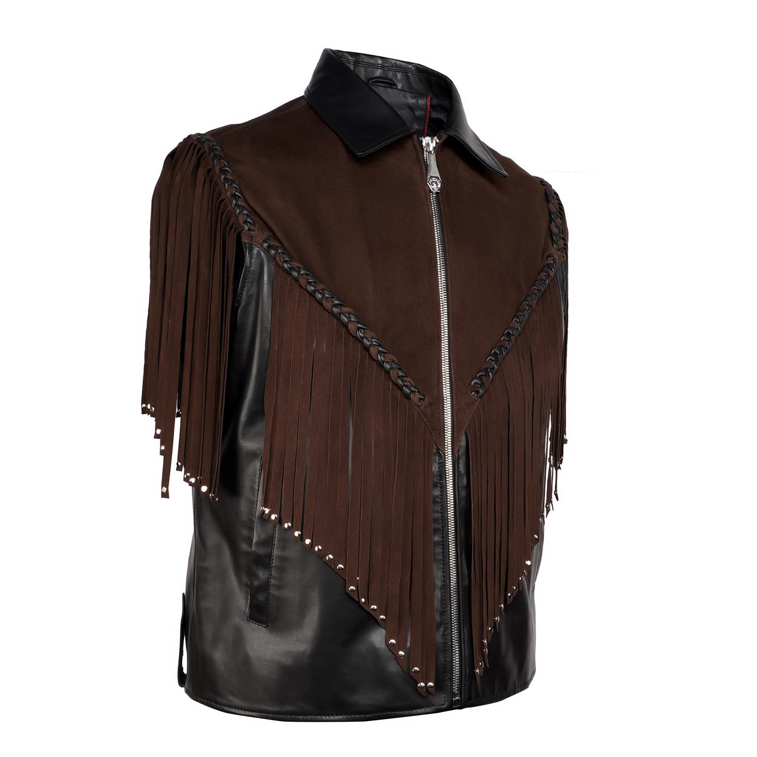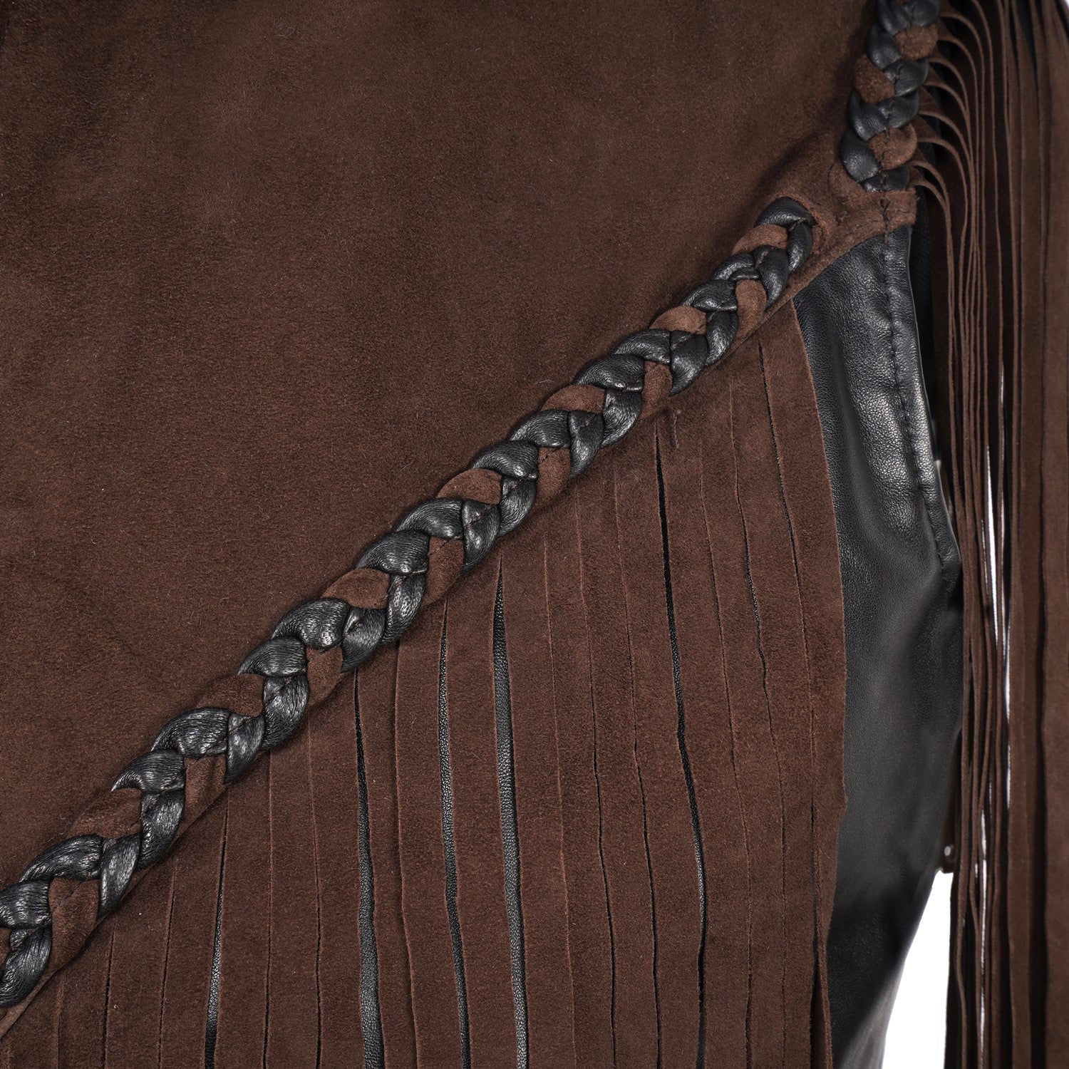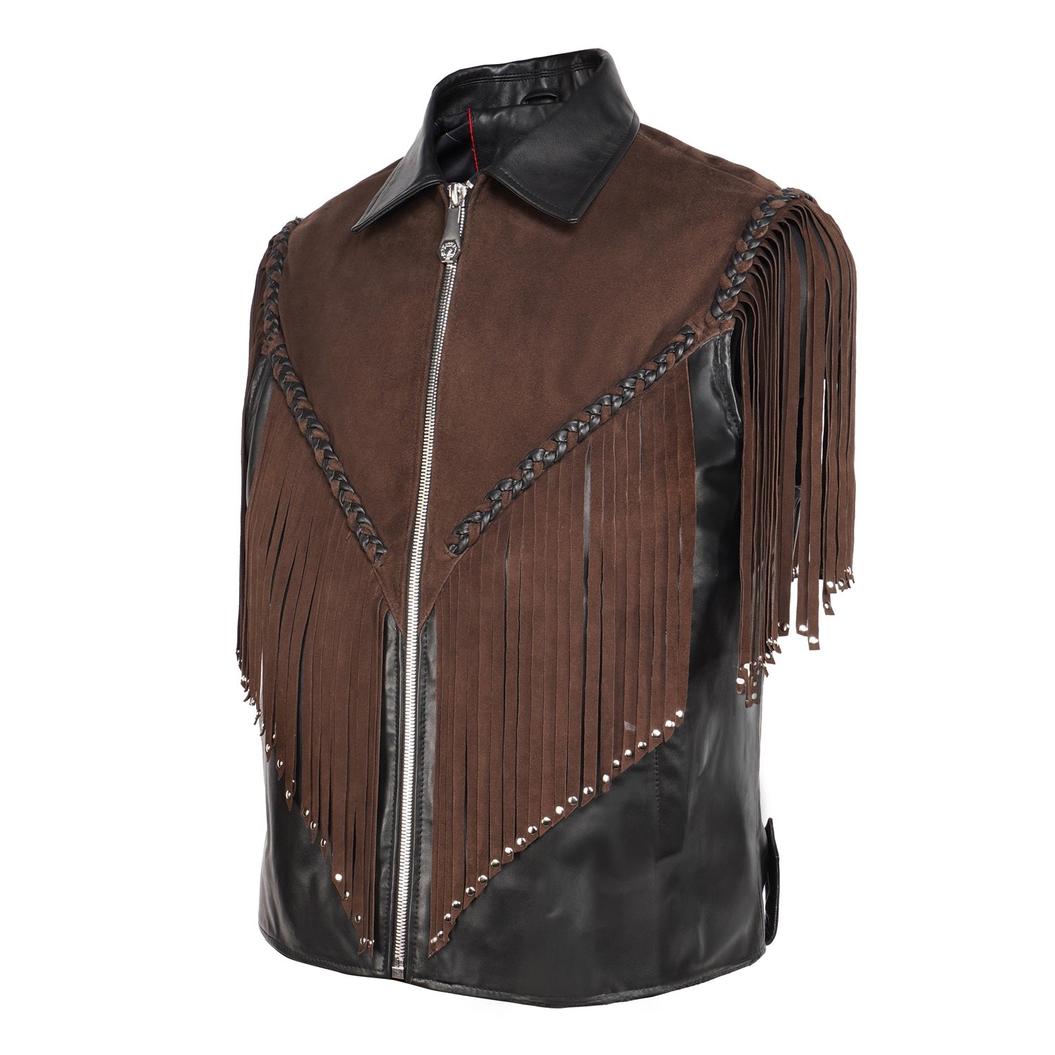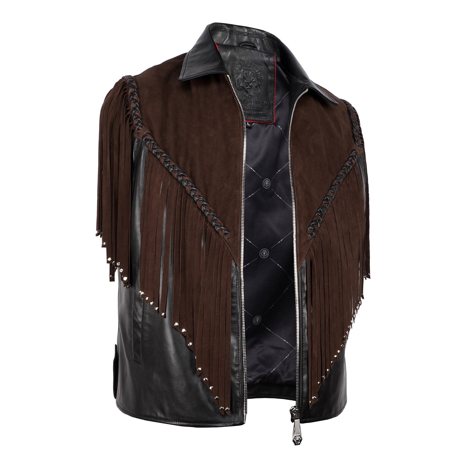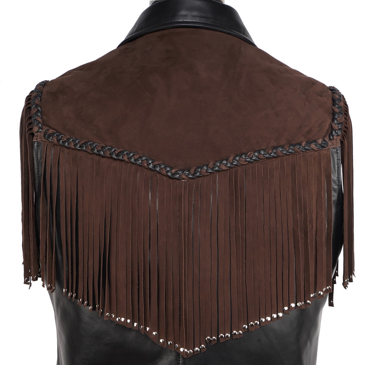 Crafted for those who appreciate bold luxury, this statement vest showcases a striking dual-leather design. Rich brown suede forms the fringe detailing, adding fluid movement and a distinctive western cowboy edge, while the smooth black leather base creates a sharp, structured contrast. Intricate braided accents enhance its handcrafted appeal, making every detail stand out. Designed with a refined silhouette and sleek front closure, this vest delivers a perfect balance of rugged character and modern sophistication.
