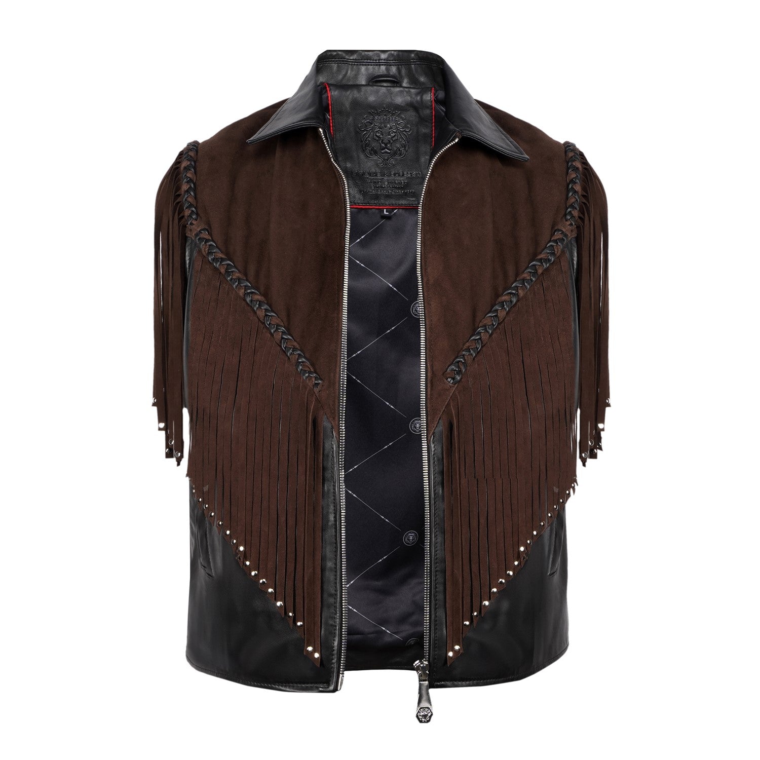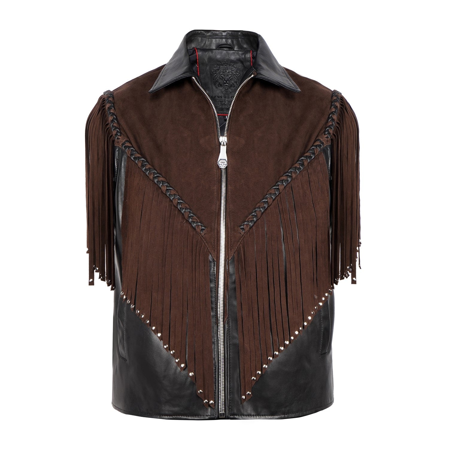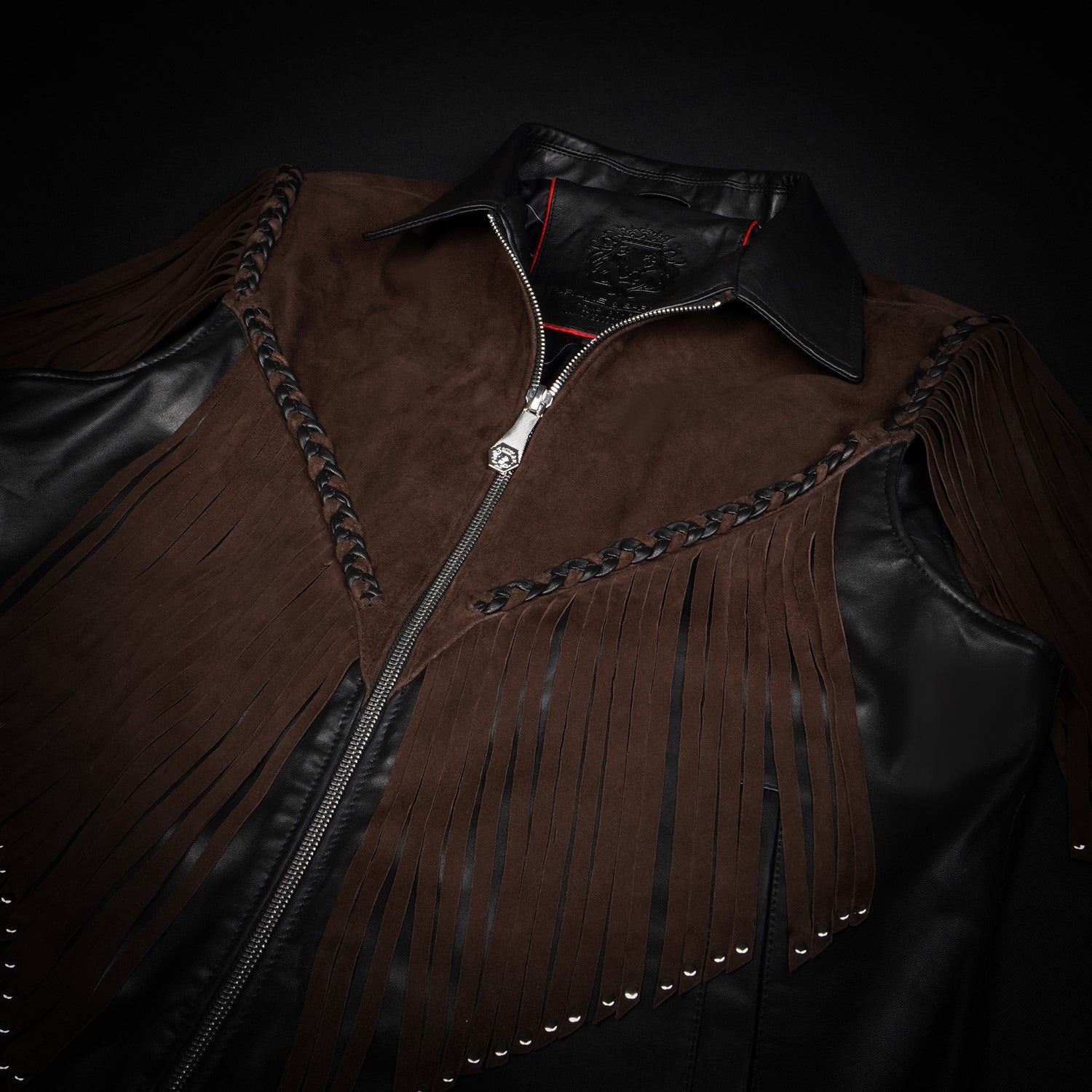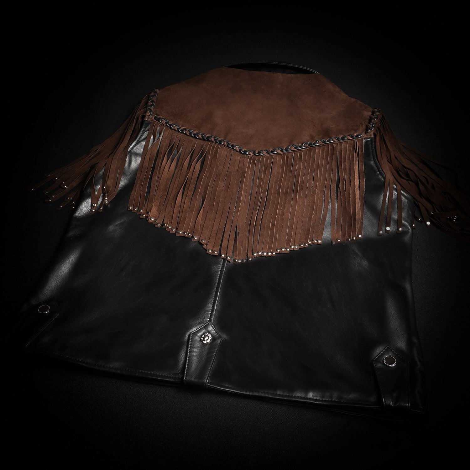 Crafted for those who appreciate bold luxury, this statement vest showcases a striking dual-leather design. Rich brown suede forms the fringe detailing, adding fluid movement and a distinctive western cowboy edge, while the smooth black leather base creates a sharp, structured contrast. Intricate braided accents enhance its handcrafted appeal, making every detail stand out. Designed with a refined silhouette and sleek front closure, this vest delivers a perfect balance of rugged character and modern sophistication.