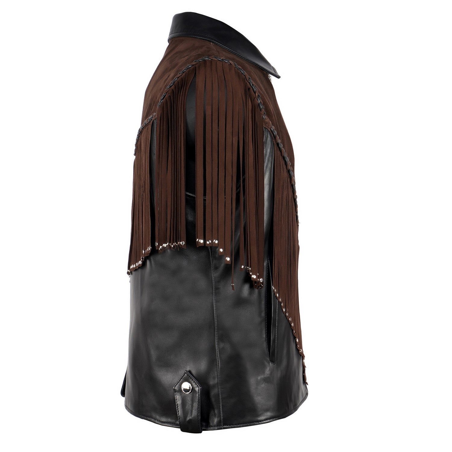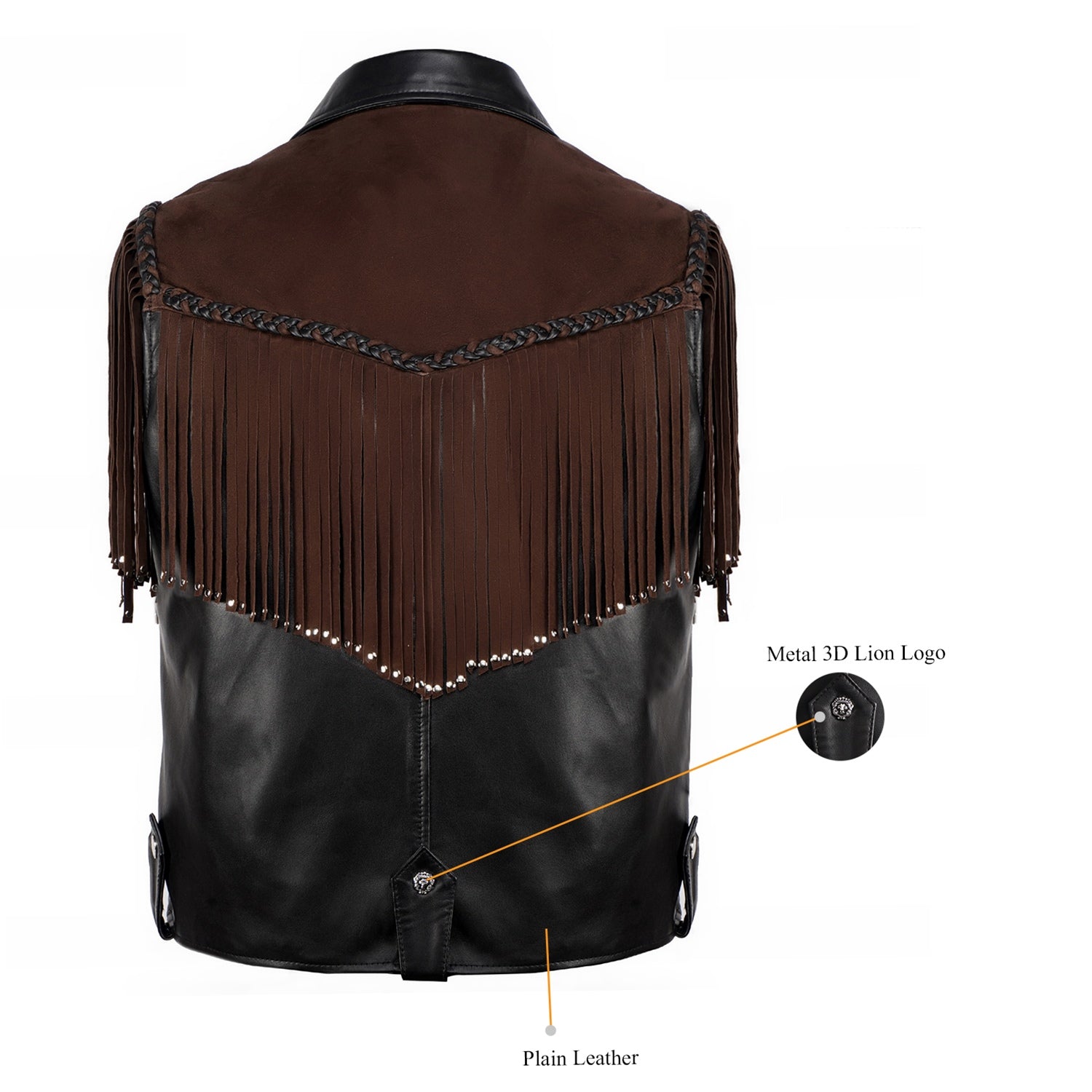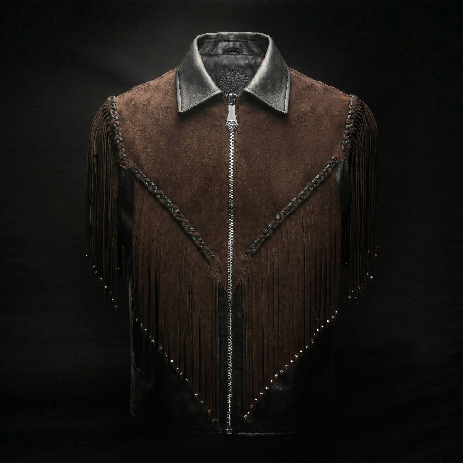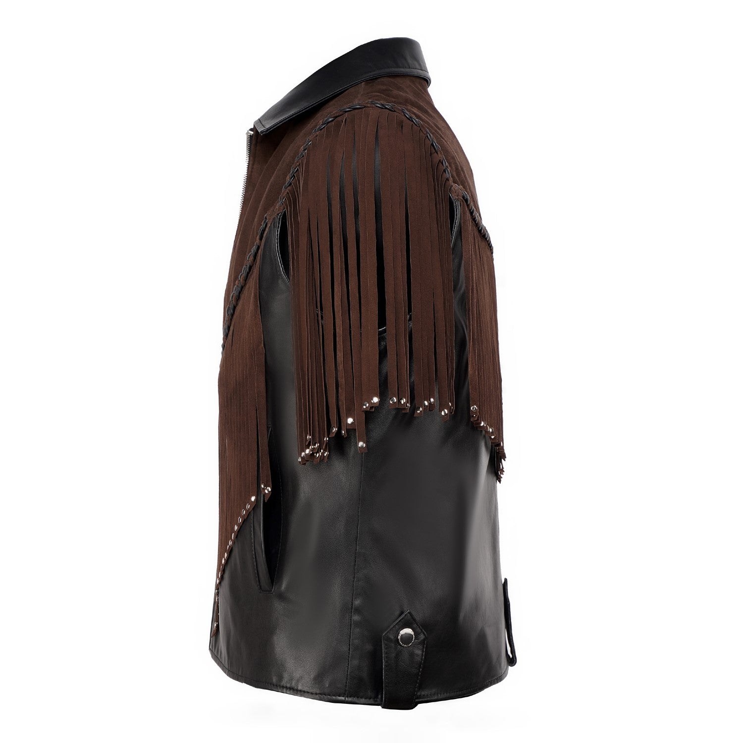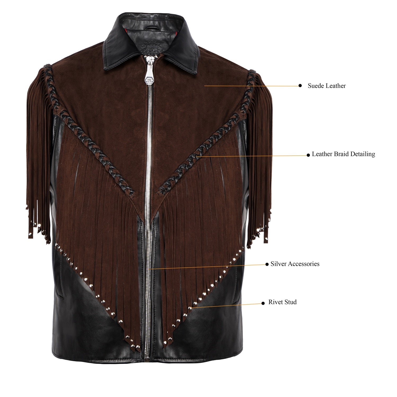 Crafted for those who appreciate bold luxury, this statement vest showcases a striking dual-leather design. Rich brown suede forms the fringe detailing, adding fluid movement and a distinctive western cowboy edge, while the smooth black leather base creates a sharp, structured contrast. Intricate braided accents enhance its handcrafted appeal, making every detail stand out. Designed with a refined silhouette and sleek front closure, this vest delivers a perfect balance of rugged character and modern sophistication.