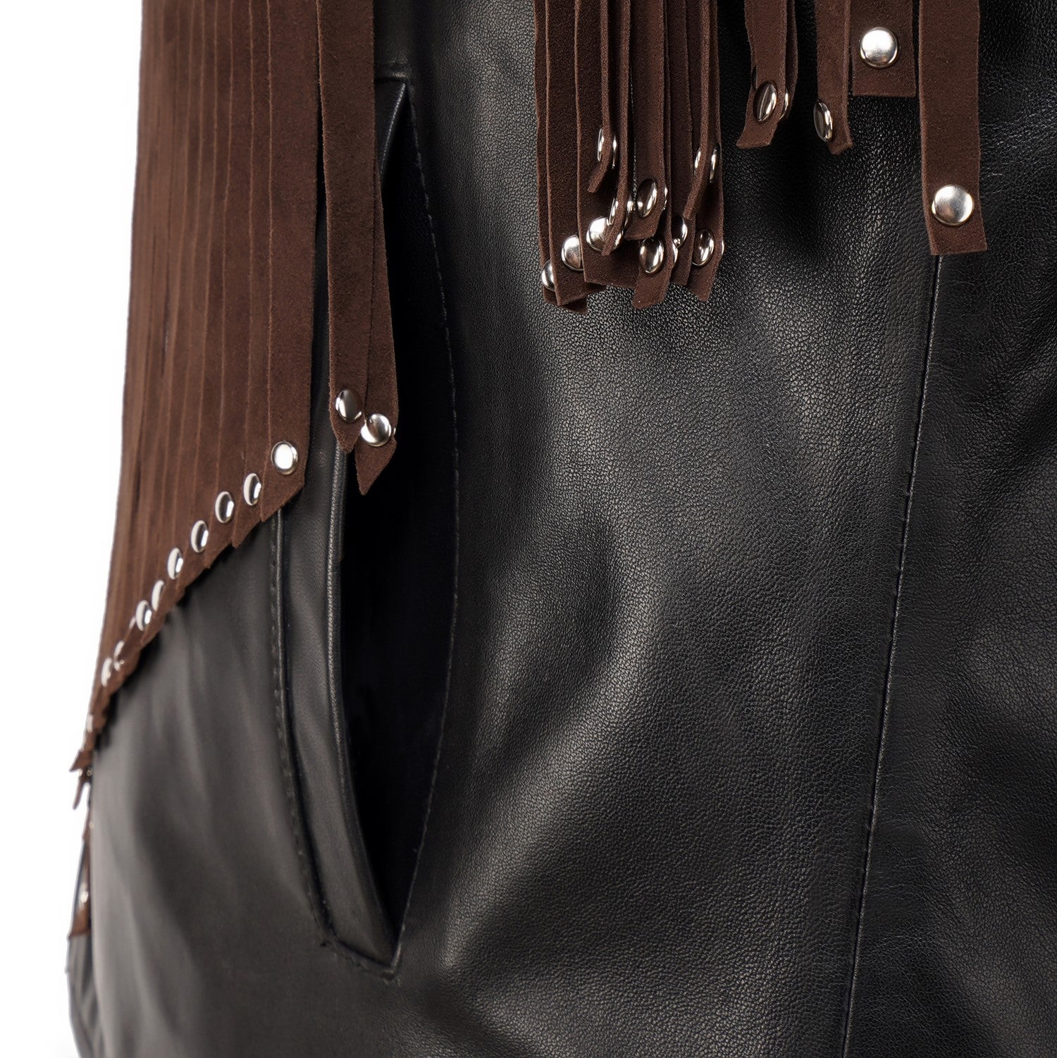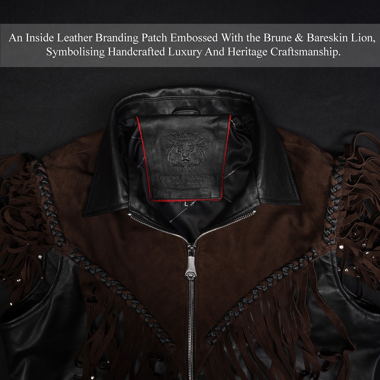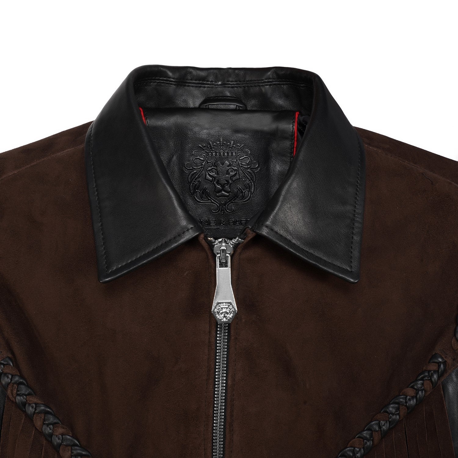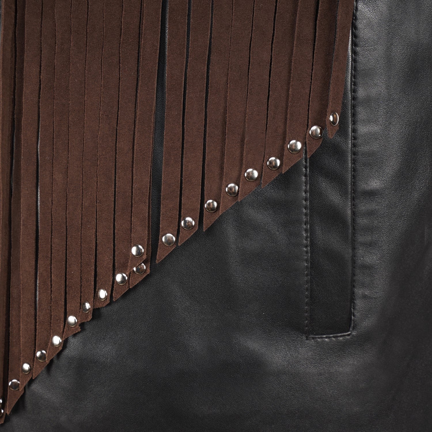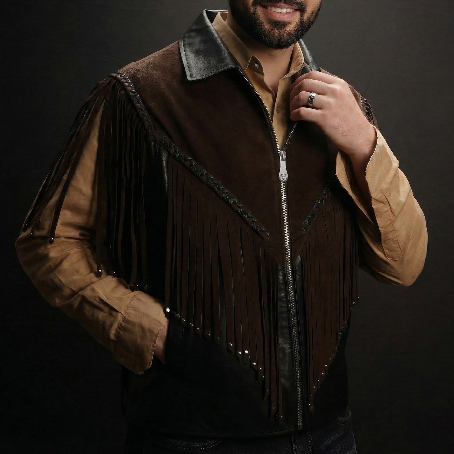 Crafted for those who appreciate bold luxury, this statement vest showcases a striking dual-leather design. Rich brown suede forms the fringe detailing, adding fluid movement and a distinctive western cowboy edge, while the smooth black leather base creates a sharp, structured contrast. Intricate braided accents enhance its handcrafted appeal, making every detail stand out. Designed with a refined silhouette and sleek front closure, this vest delivers a perfect balance of rugged character and modern sophistication.