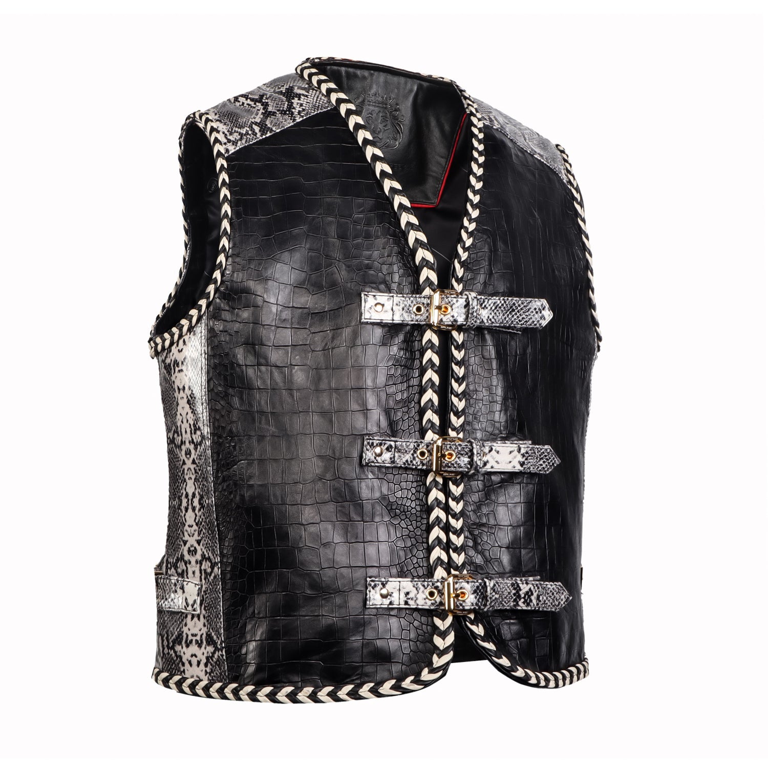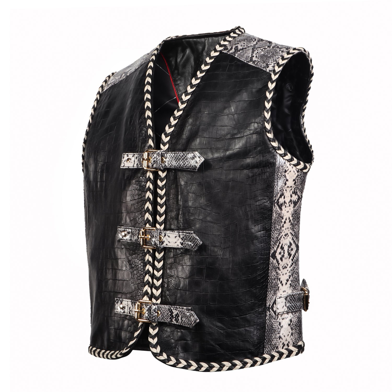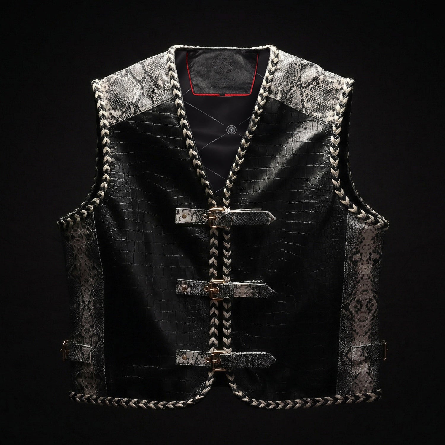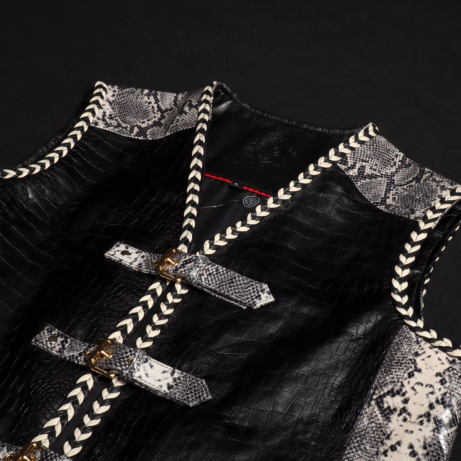 One of the standout features of this vest is the front buckle closure system, designed with multiple snake print leather straps and gold-tone metal buckles. This unique closure not only enhances the visual appeal but also provides an adjustable fit, adding both functionality and style. The vest is further enhanced with braided leather piping along the edges, giving it a handcrafted, premium finish and adding depth to the overall design.