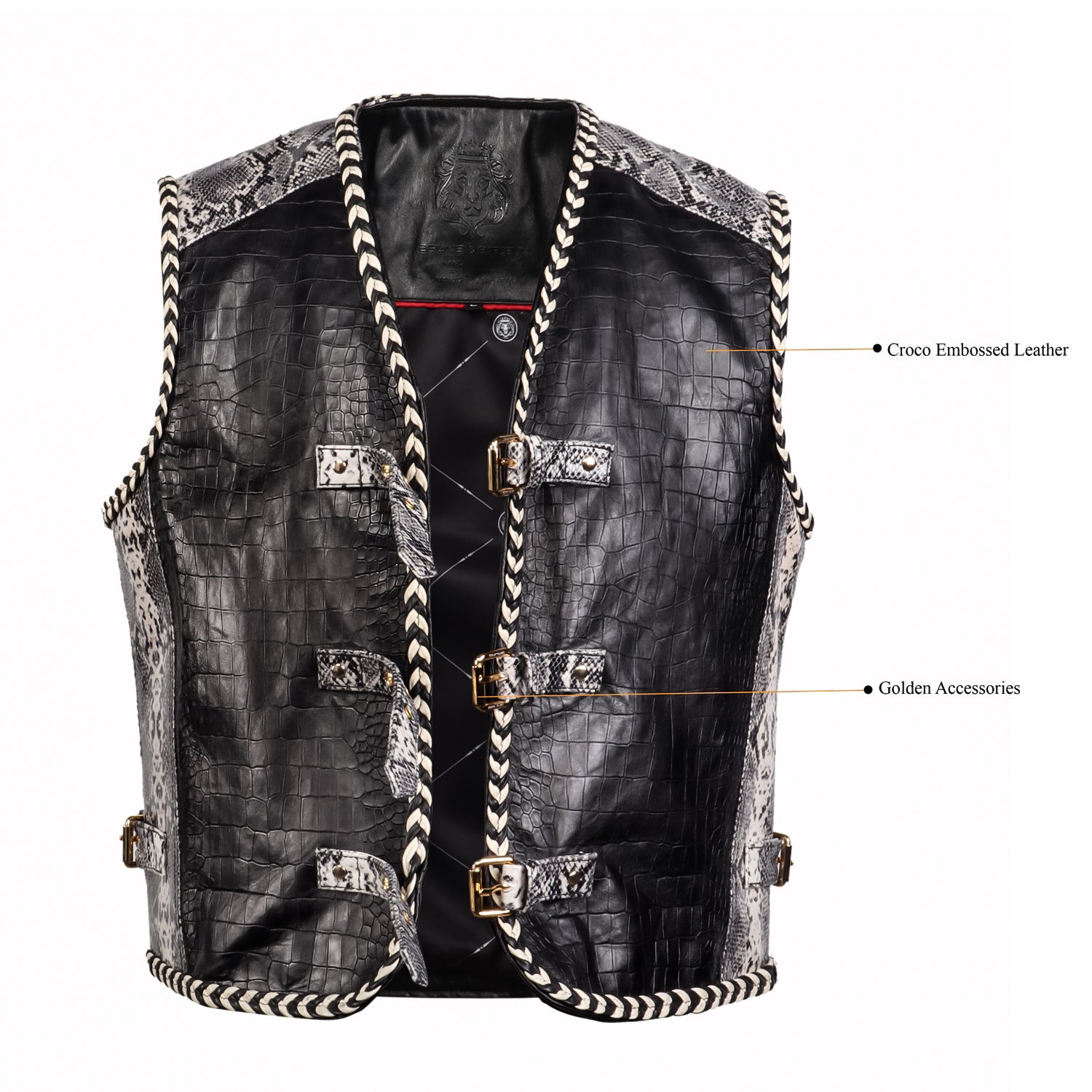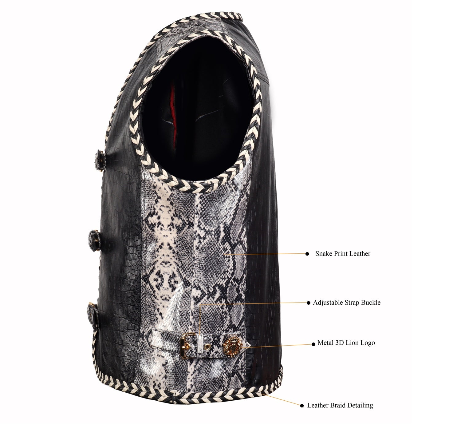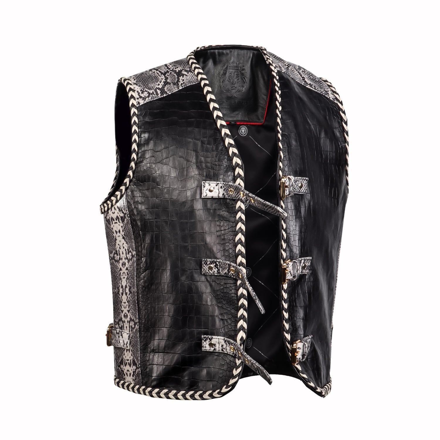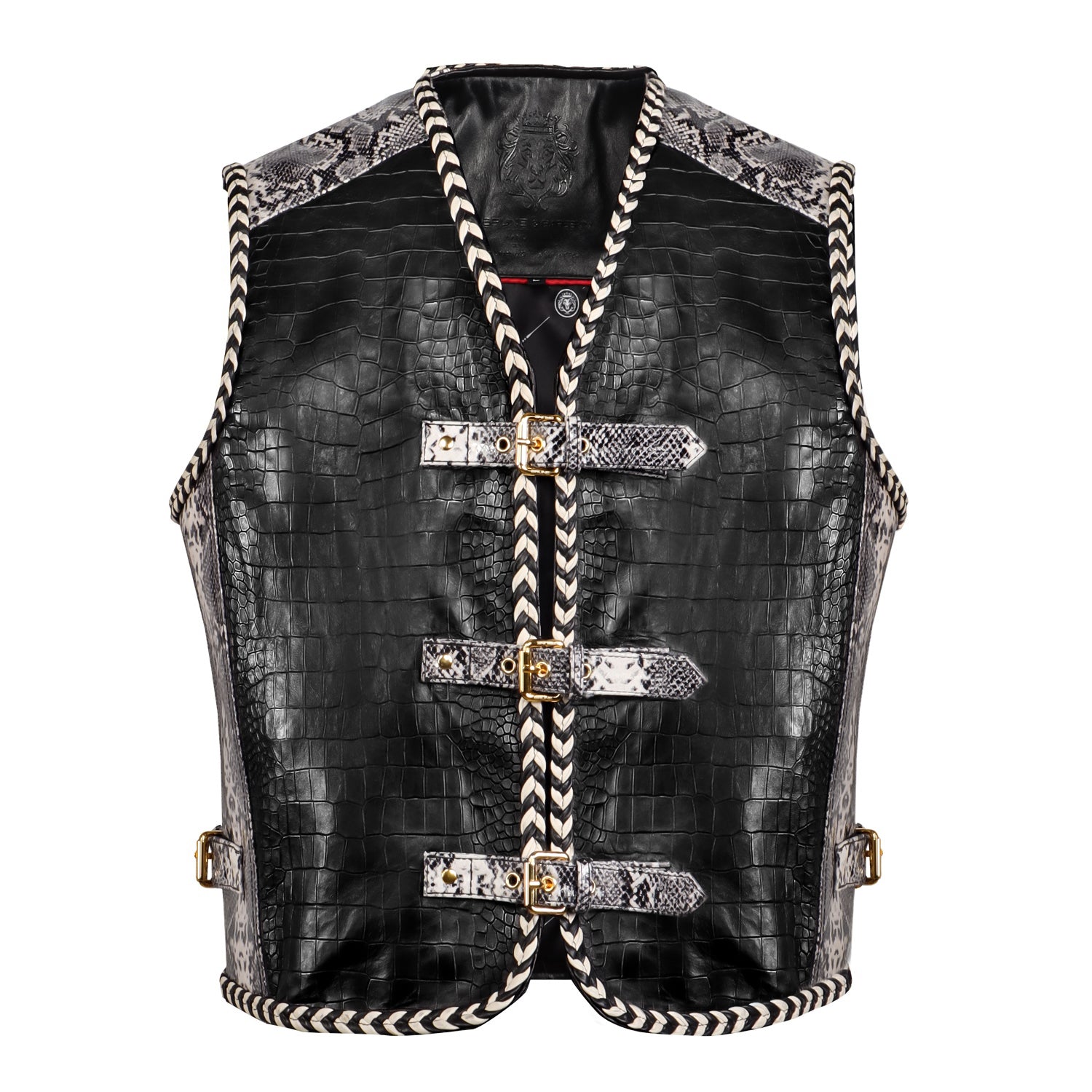 One of the standout features of this vest is the front buckle closure system, designed with multiple snake print leather straps and gold-tone metal buckles. This unique closure not only enhances the visual appeal but also provides an adjustable fit, adding both functionality and style. The vest is further enhanced with braided leather piping along the edges, giving it a handcrafted, premium finish and adding depth to the overall design.