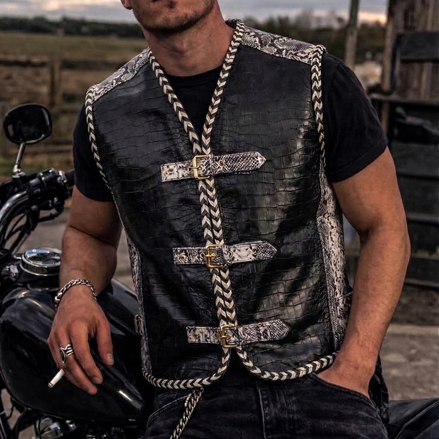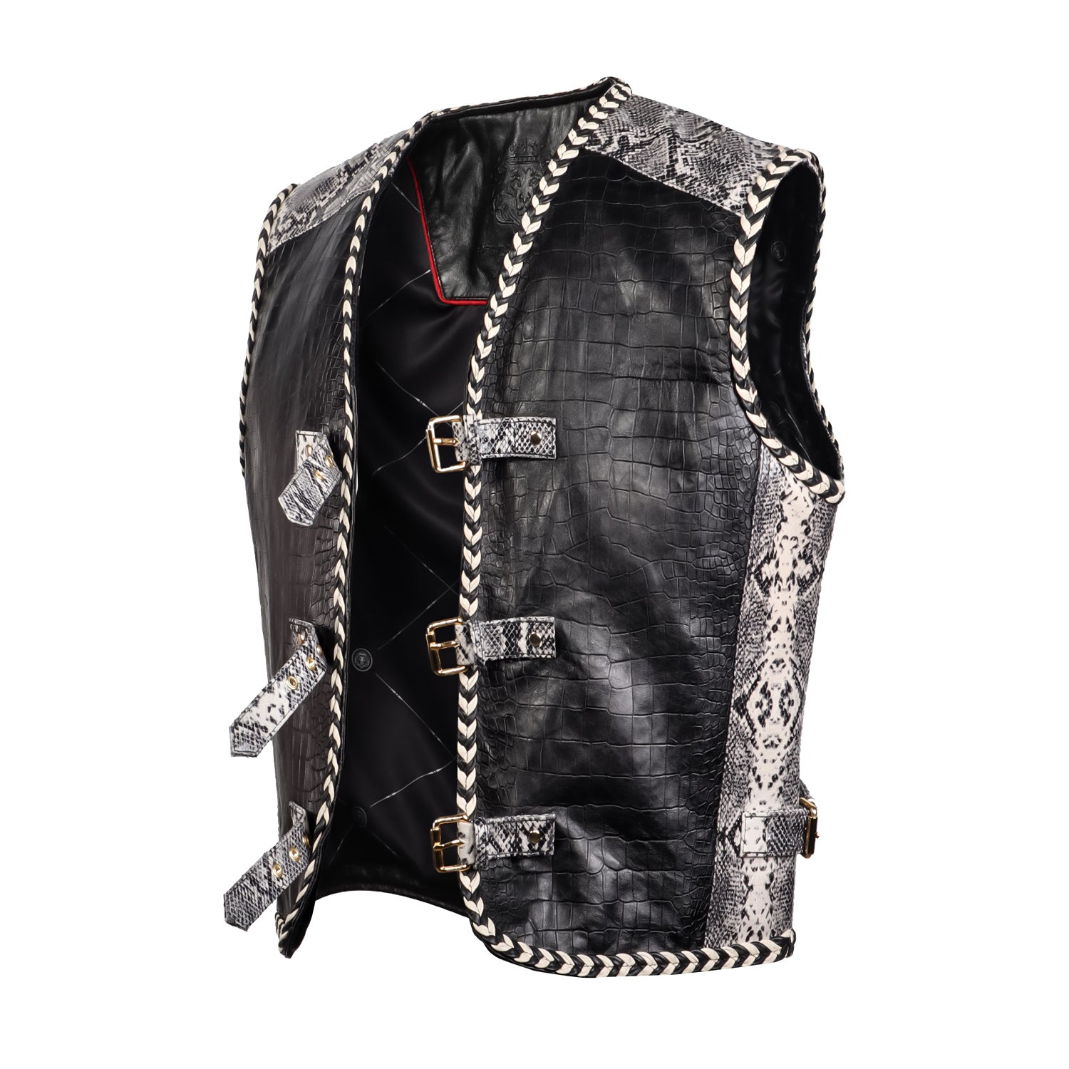 Black Leather Vest with Croco Embossed & Snake Print Buckle Straps