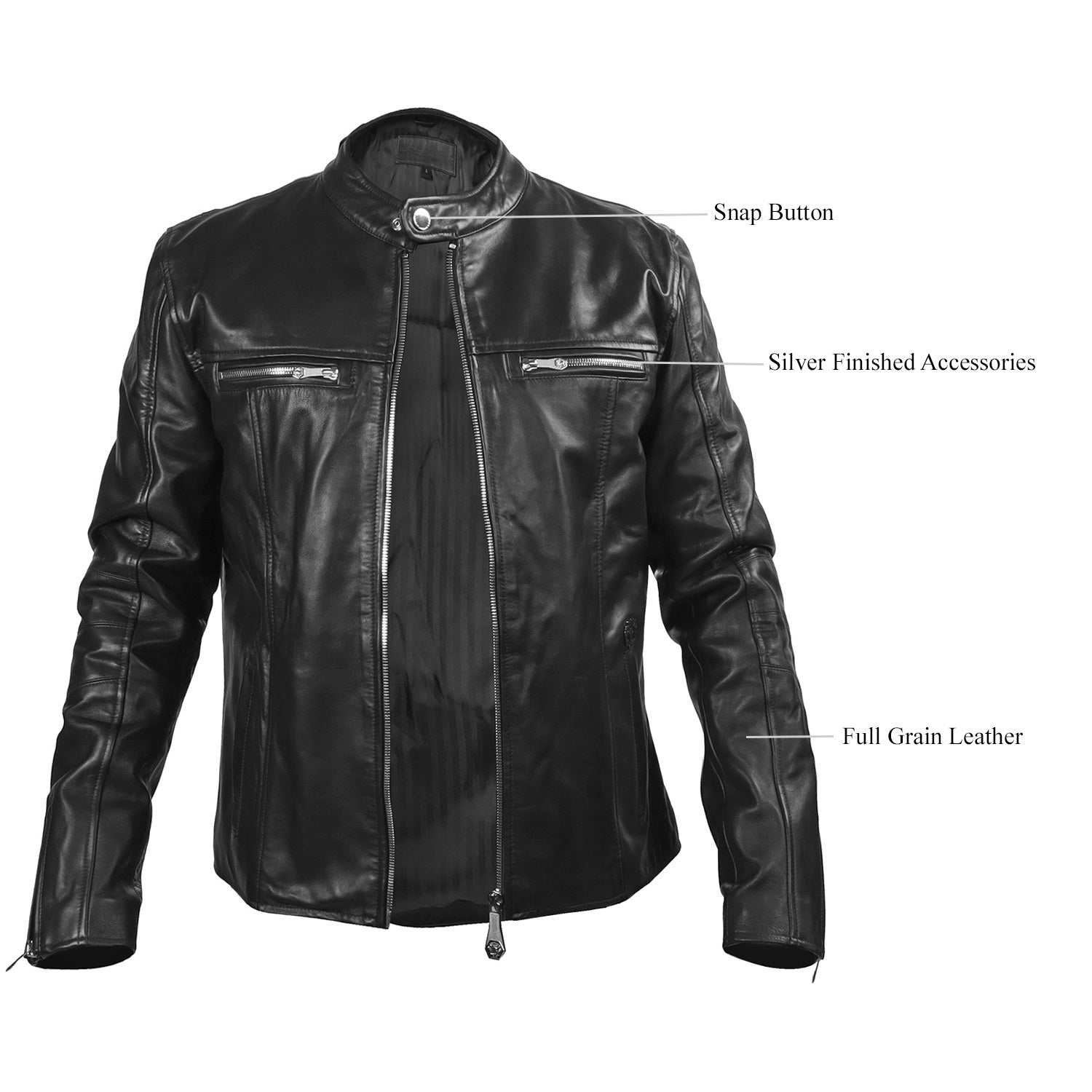 Men's Black leather Jacket with Band Neck Collar Front Zipper Pockets By Brune & Bareskin