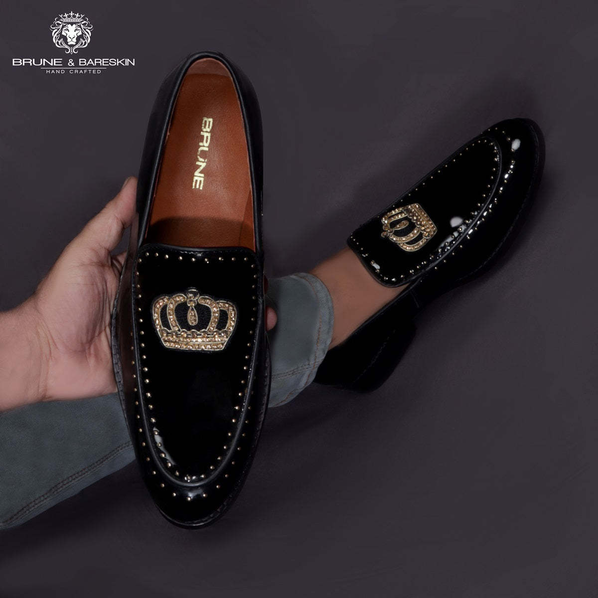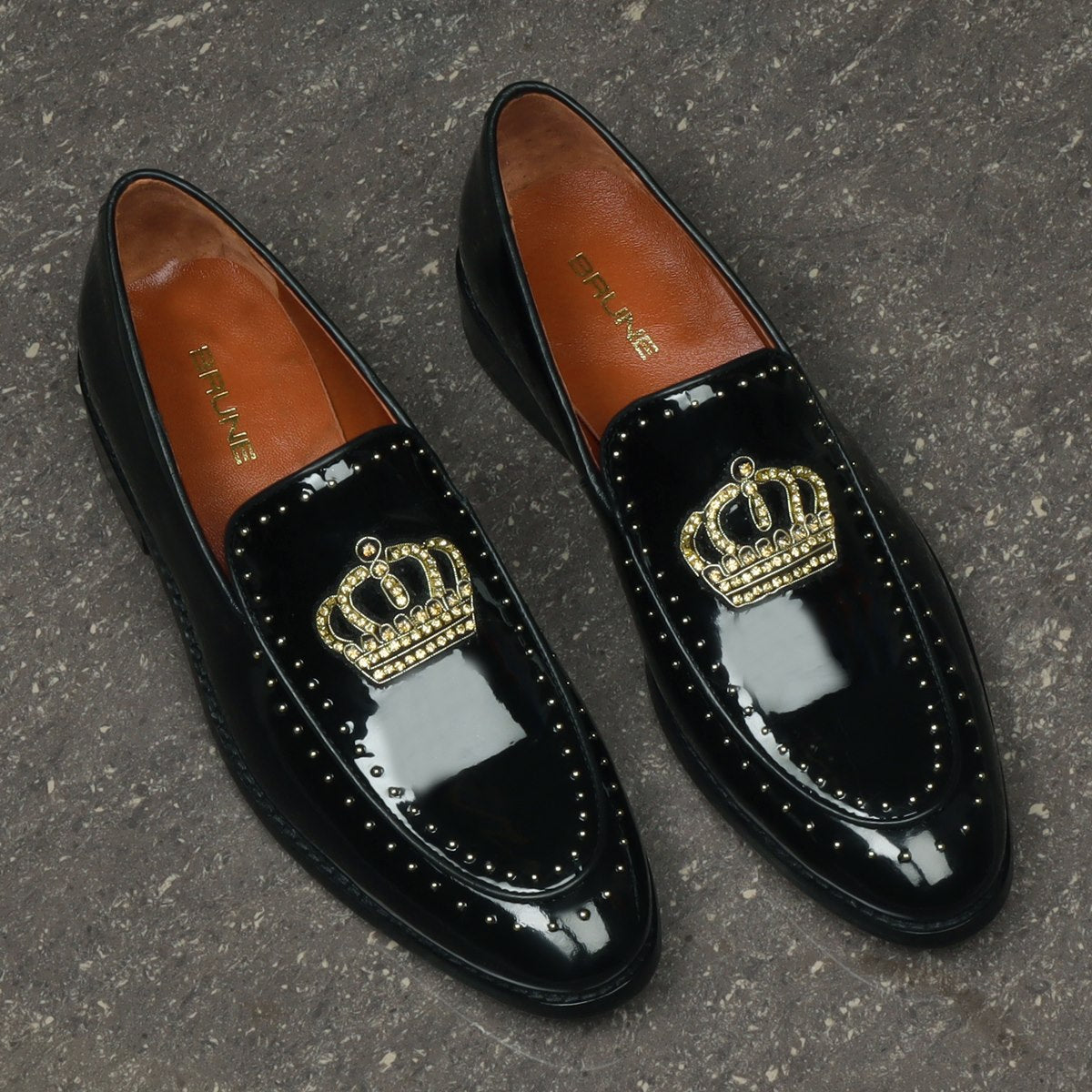 It's hard to be a master of Patent Leather Skills, at BRUNE & BARESKIN, we have industries leading craftsmen who take care of this special classic unit. This Black Patent Leather Slip On with zardosi crown is very swanky in looks. This is the best pair of shoes to win every party you attend. This shoe enhances the style quotient, especially with formal and semi-formal attires. This is a must-have addition to your fashion collection