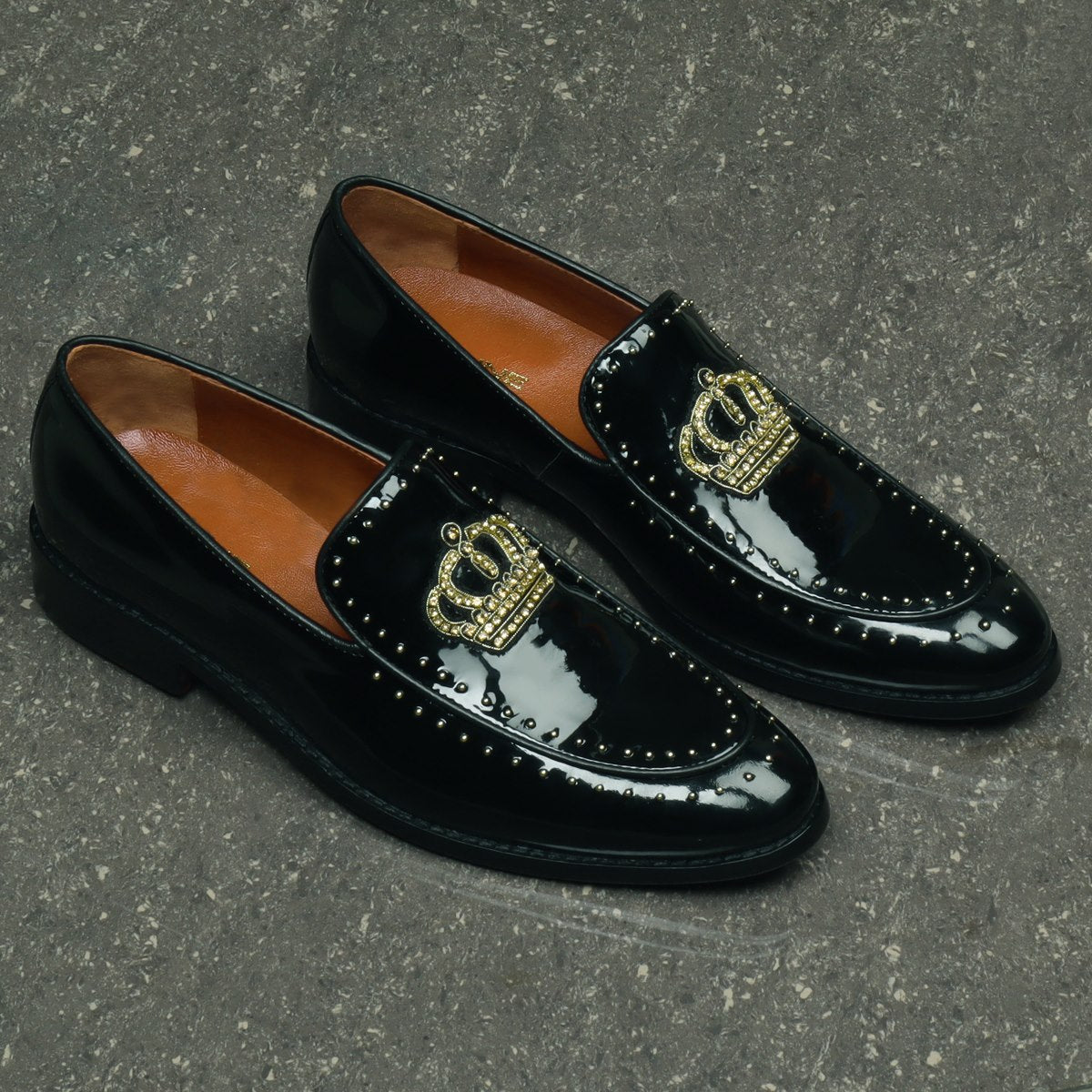 Studded Apron Leather Loafers in Black Patent Crown Zardosi