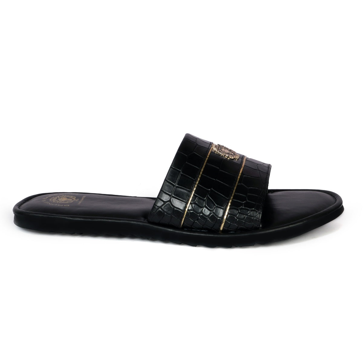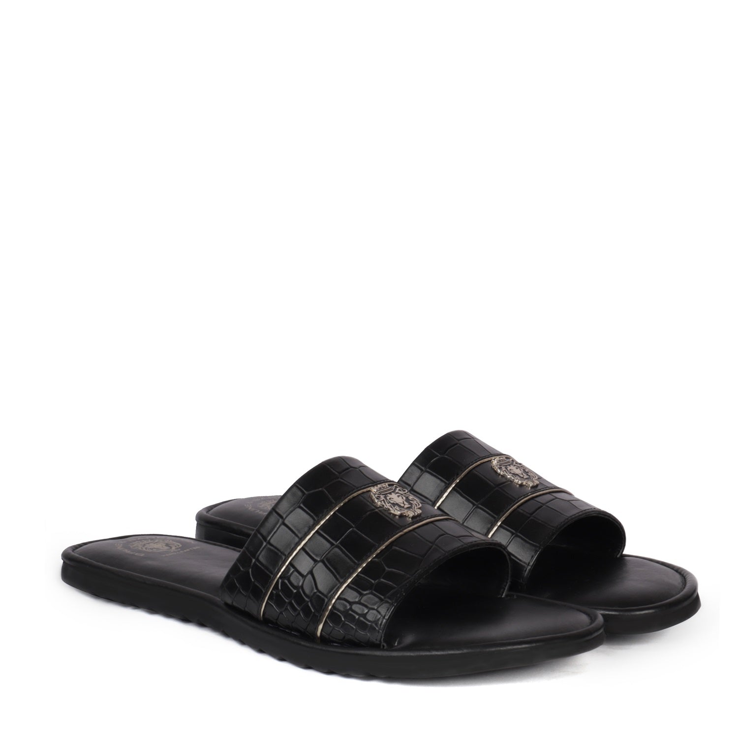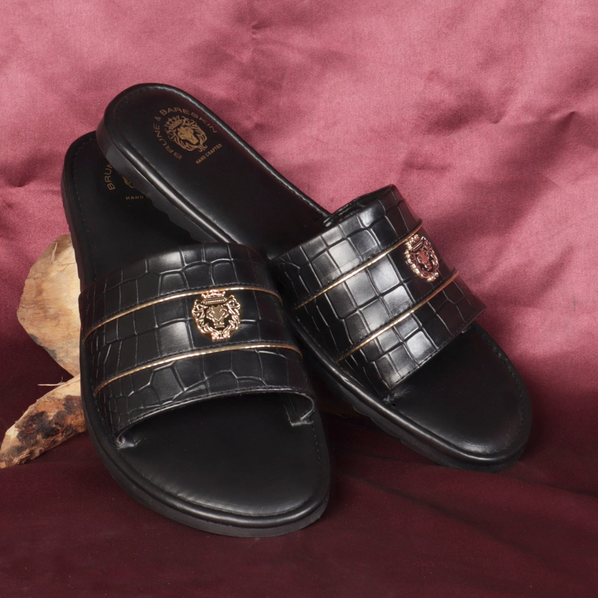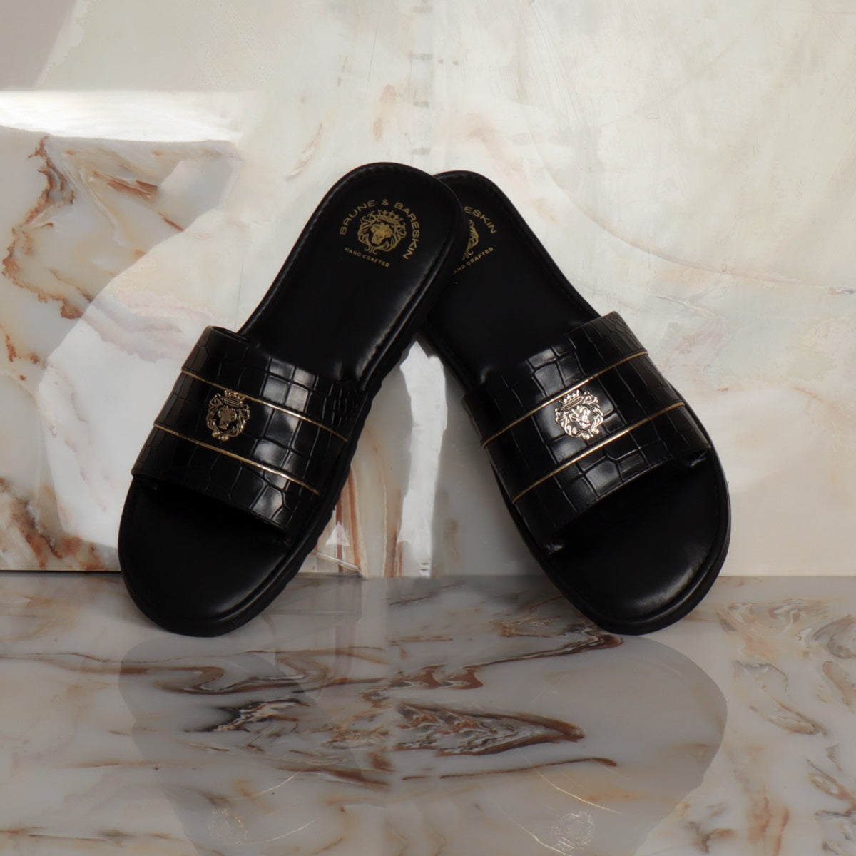 Black Deep Cut Croco Leather With Signature Metal Lion Slide-In-Slippers by BRUNE BY BARESKIN